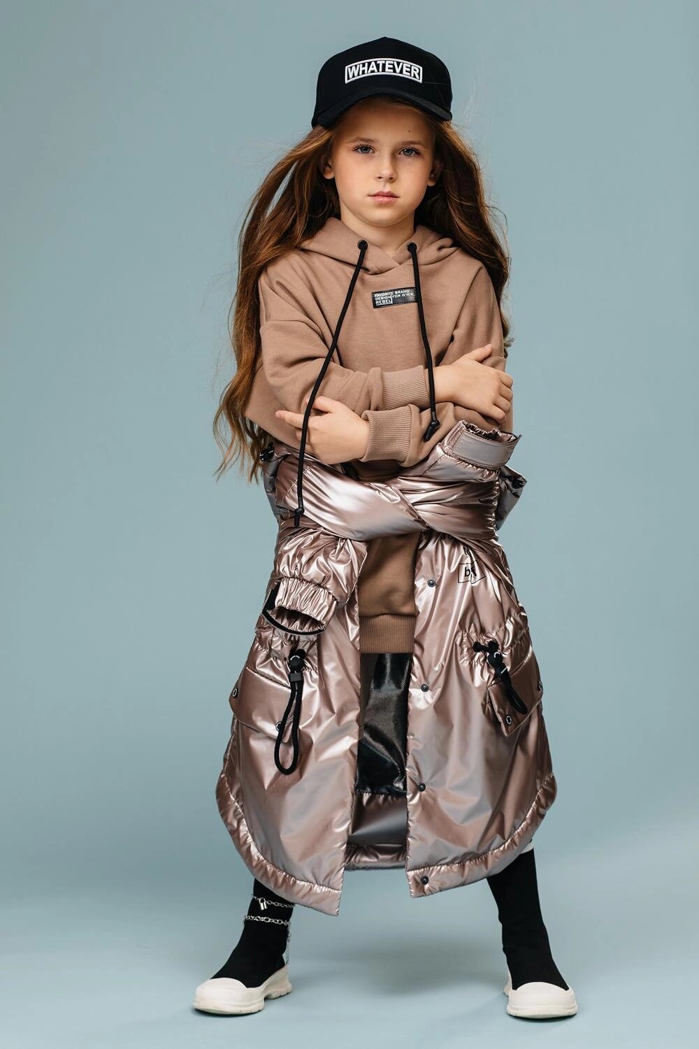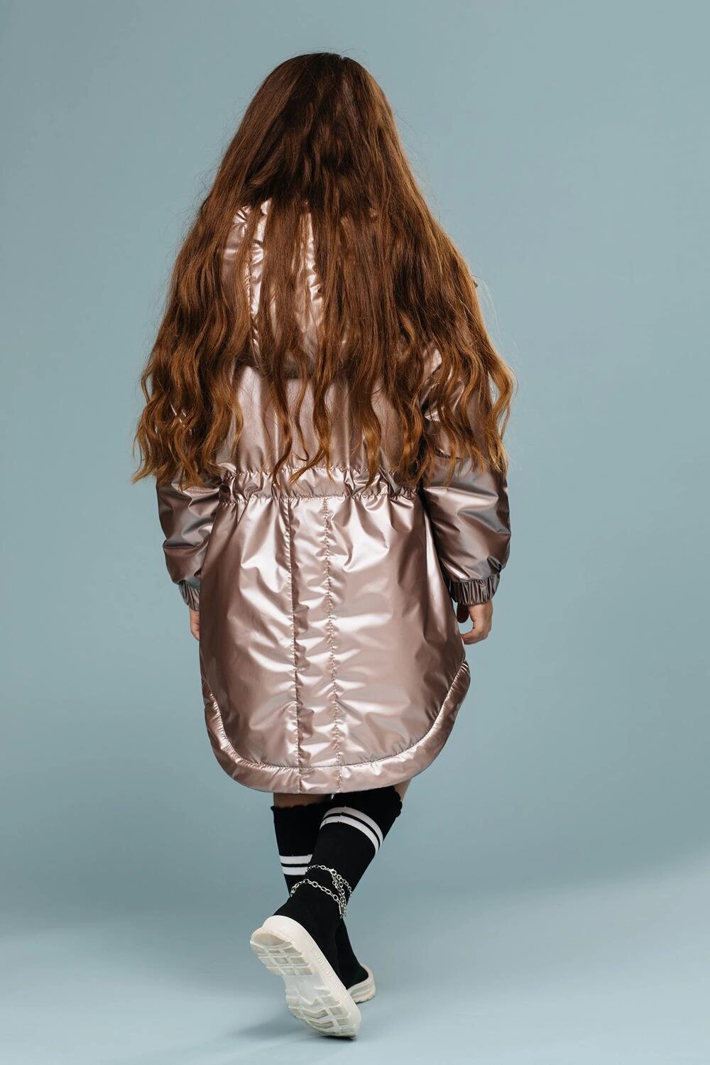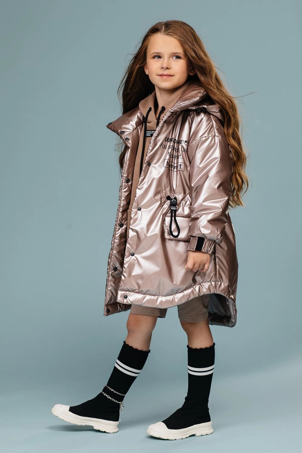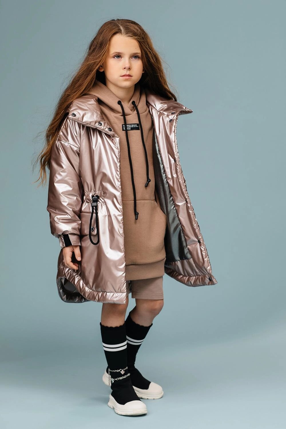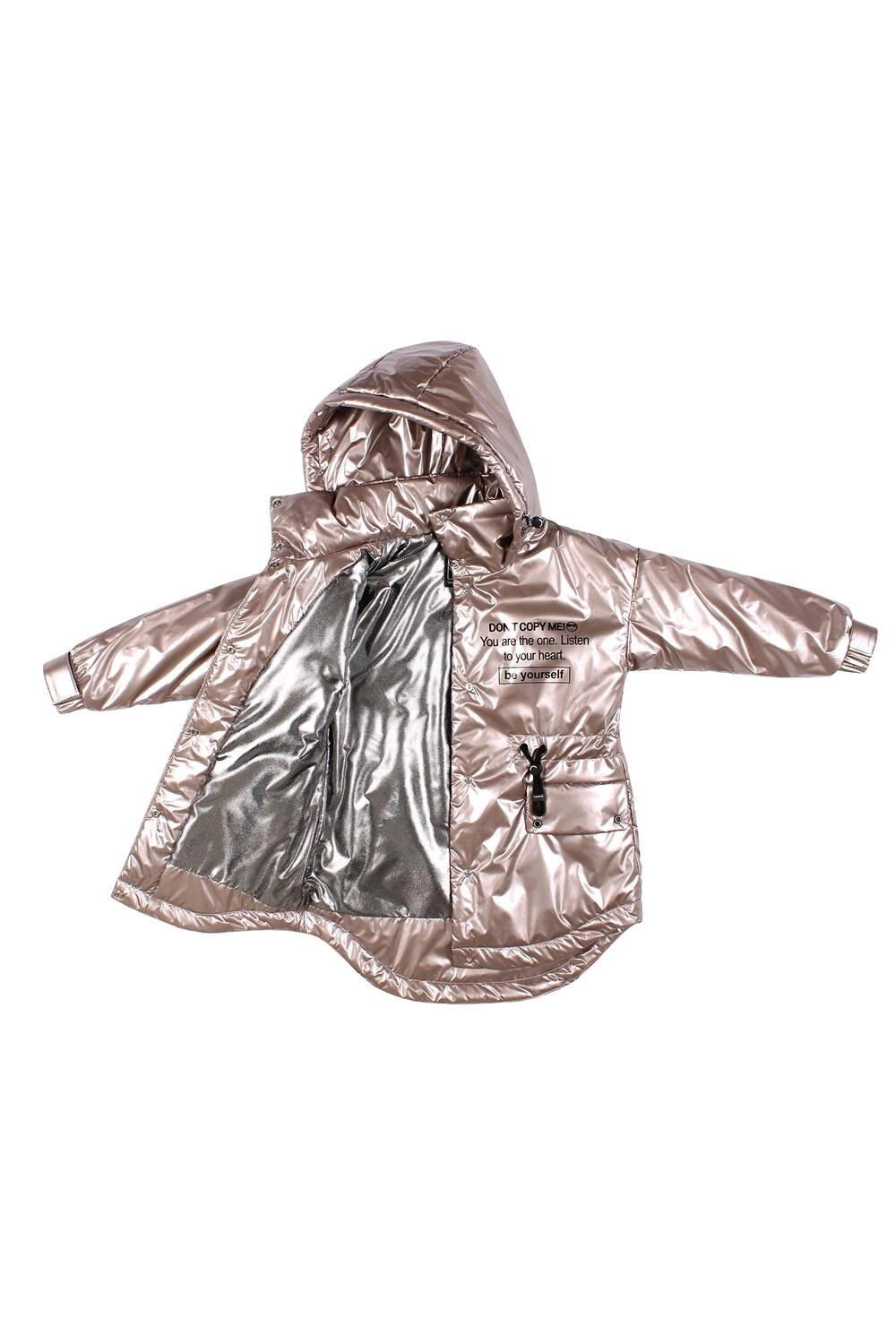 Куртка прямого силуэта с воротником-стойкой и отстегивающимся капюшоном. Рукав втачной, со спущенной мягкой линией плеча. Застежка - центральная на потайные кнопки. На переде обработаны, боковые горизонтальные прорезные карманы с фигурным клапаном, застегивающимся на кнопки. Низ рукавов оформлен притачными манжетами на резинке с патами застегивающимися на ленту-велькро. Низ изделия-фигурный, с удлиненной спинкой и отделочной строчкой. Наполнитель: Слайтекс 150 г/м2. Ткань: металлизированная курточная ткань. Подклада: фольгированная (омни хит).