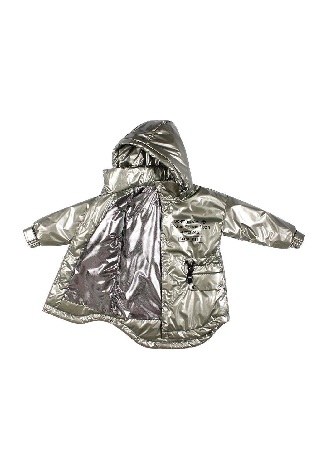 Куртка прямого силуэта с воротником-стойкой и отстегивающимся капюшоном. Рукав втачной, со спущенной мягкой линией плеча. Застежка - центральная на потайные кнопки. На переде обработаны, боковые горизонтальные прорезные карманы с фигурным клапаном, застегивающимся на кнопки. Низ рукавов оформлен притачными манжетами на резинке с патами застегивающимися на ленту-велькро. Низ изделия-фигурный, с удлиненной спинкой и отделочной строчкой. Наполнитель: Слайтекс 150 г/м2. Ткань: металлизированная курточная ткань. Подклада: фольгированная (омни хит).