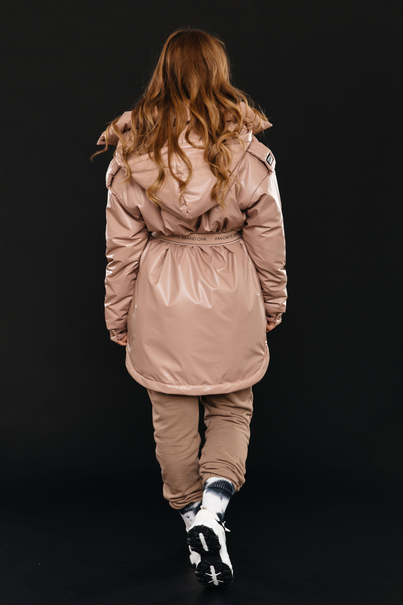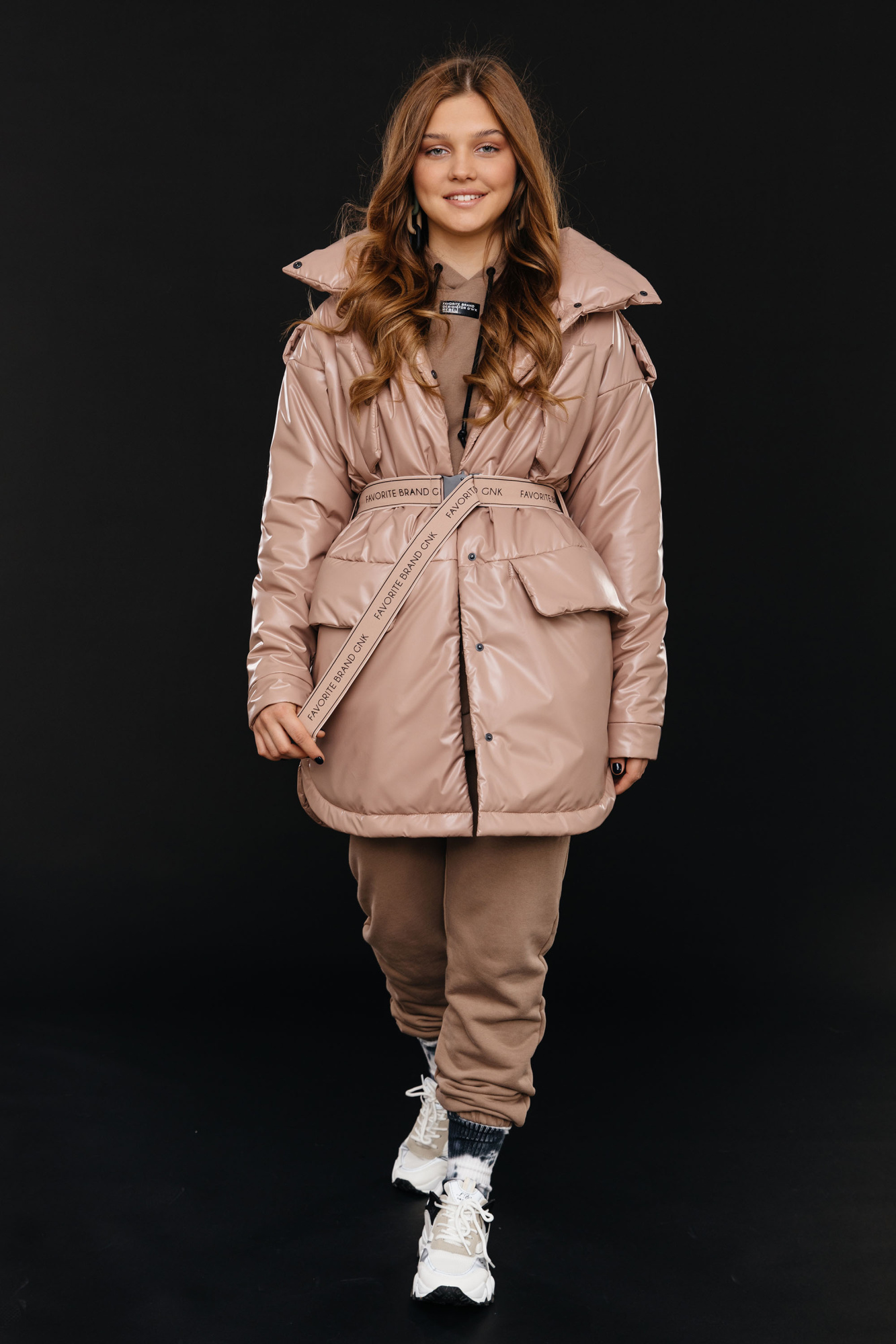 Куртка прямого силуэта. Рукав втачной, со спущенной линией плеча. Застежка – центральная на потайные кнопки. Воротник - стойка. На переде выполнены наклонные нагрудные прорезные карманы с фигурными клапанами. Боковые карманы - горизонтальные прорезные с клапанами. Низ рукава оформлен притачными манжетами застегивающимися на кнопки. Капюшон отстегивающийся, по краю капюшона кулиса регулируемая резинкой и стопорами . Низ изделия фигурный, с отделочной строчкой. С помощью съемного пояса возможна трансформация силуэта.