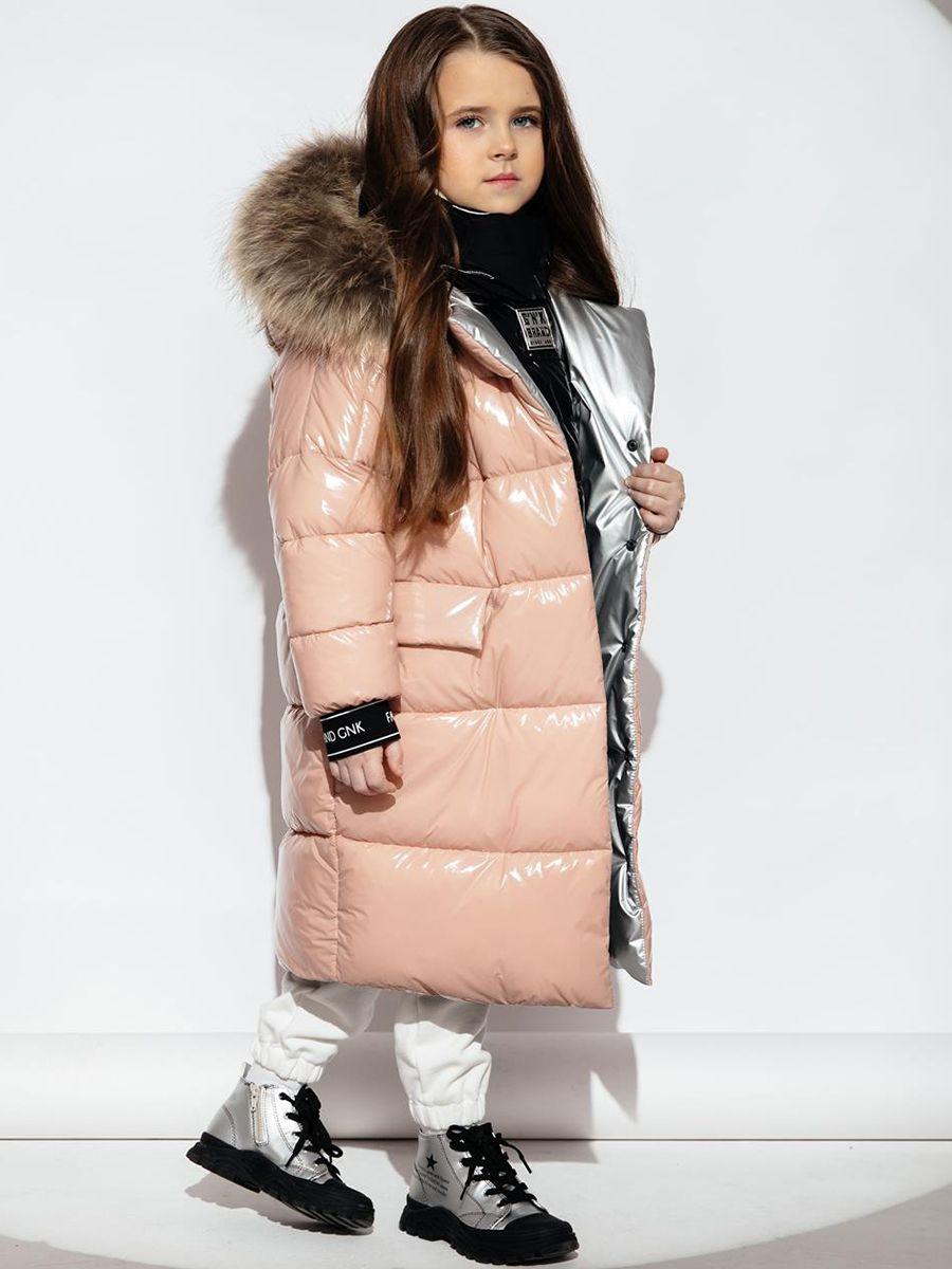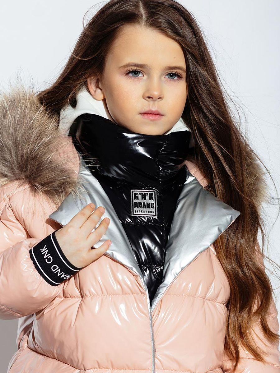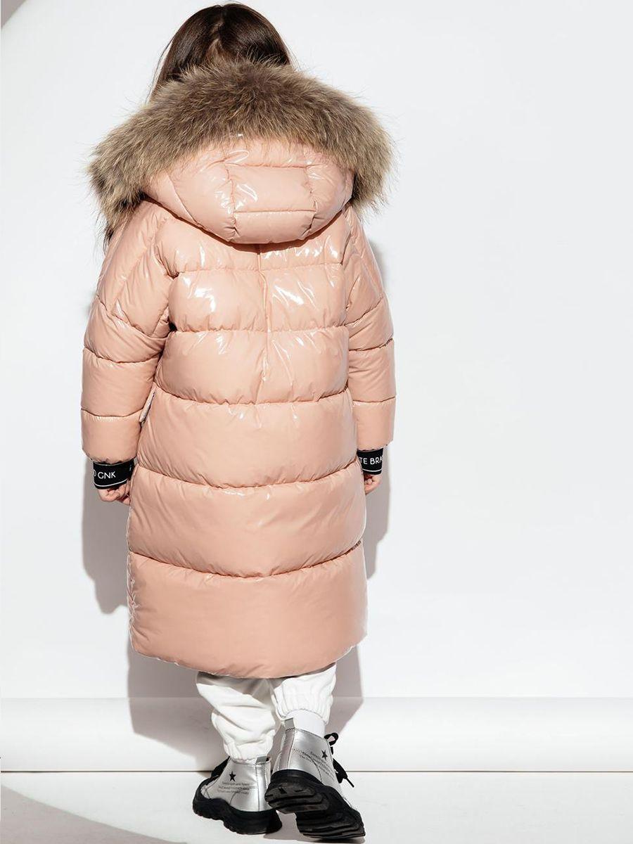 Пальто-прямого, объемного, силуэта, с имитацией многослойности. Рукав втачной, со спущенной линией плеча. На нижнем слое выполнен воротник-стойка, верхний слой с лацканами. Нижний слой застегивается на тесьму - молнию, с цельнокроеной верхней планкой, верхний слой - на потайные кнопки. Пальто стеганое горизонтальными переборками. На переде обработаны горизонтальные прорезные карманы с клапанами. Низ рукавов оформлен удлиненными трикотажными манжетами с вырезом для большого пальца. Капюшон несъемный. Наполнитель: синтетический лебяжий пух. Ткань: курточная ткань с лаковым блеском. Подклада: фольгированная (омни хит). Опушка: мех енота натуральный.