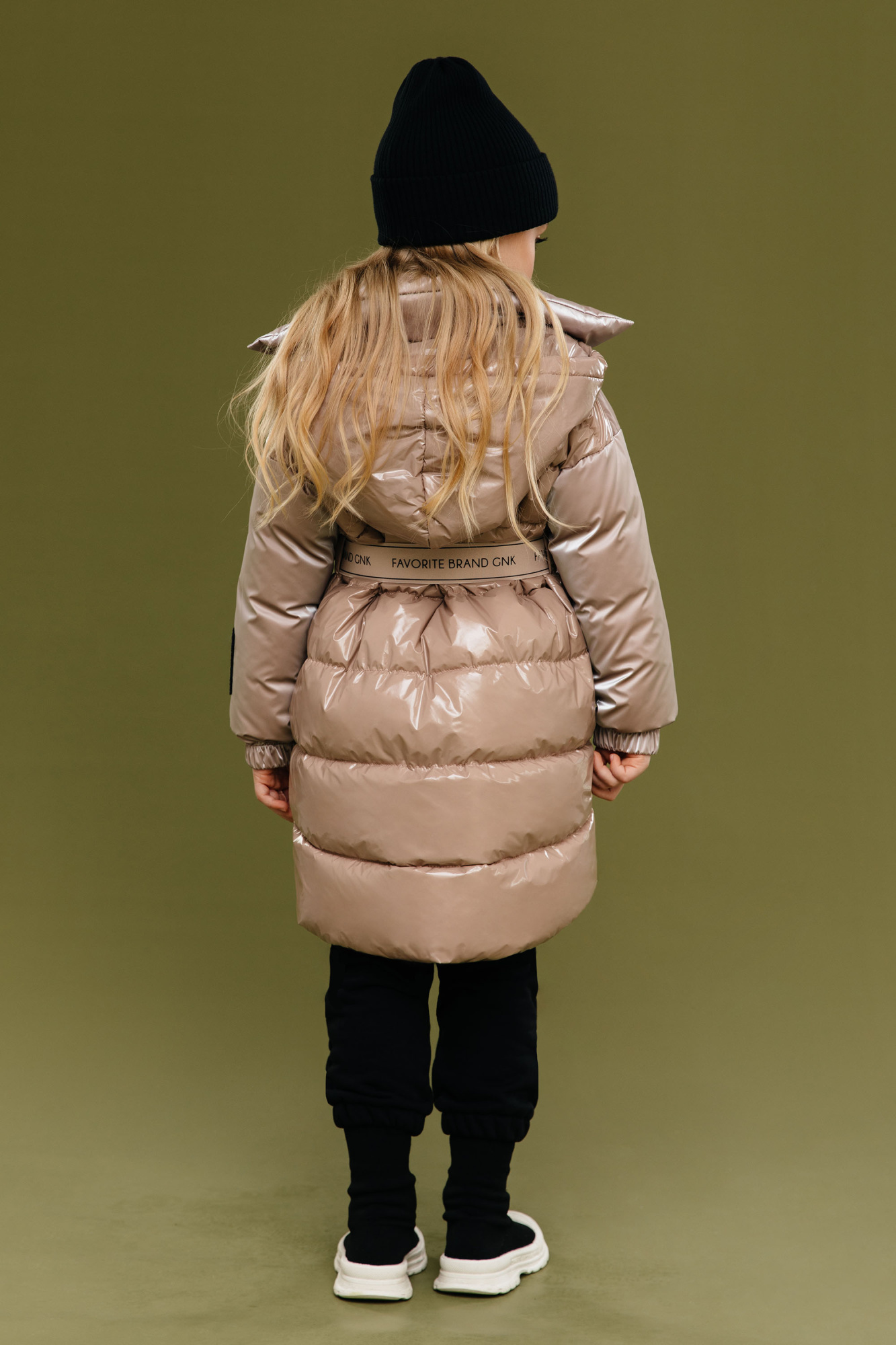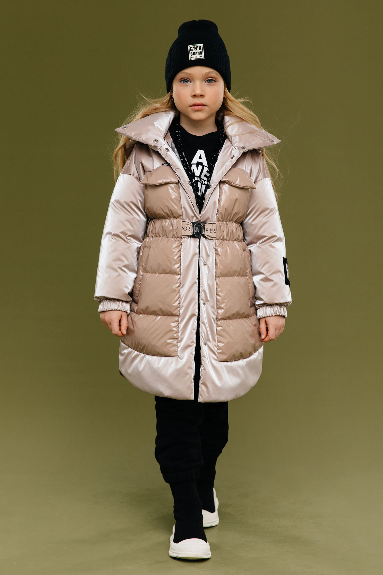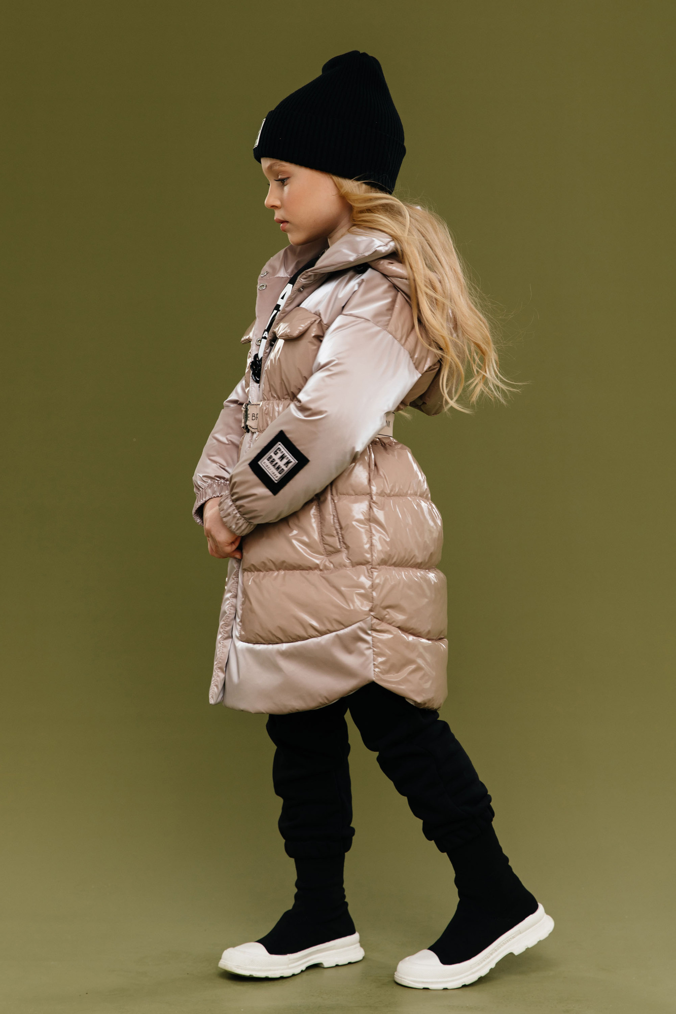 Пальто  полуприлегающего силуэта со спущенной мягкой линией плеча и воротником-стойкой. Низ рукавов оформлен манжетами на резинке. Капюшон не отстёгивающийся, по краю капюшона выполнена внутренняя кулиса, регулируемая шнуром резинкой и стопорами. Состав: Наполнитель: синтетический лебяжий пух; Ткань: курточная ткань с лаковым блеском/ курточная ткань с имитацией peach-эффекта (эффект "персика") с полиуретановым покрытием; Подклада: фольгированная (омни хит).