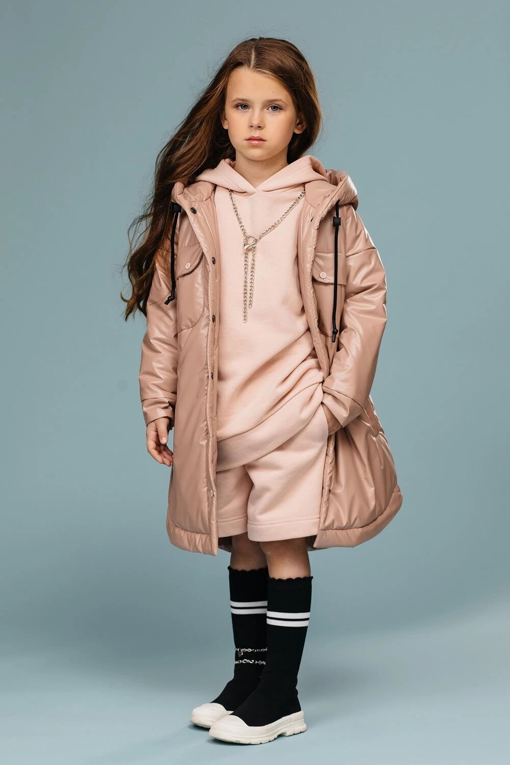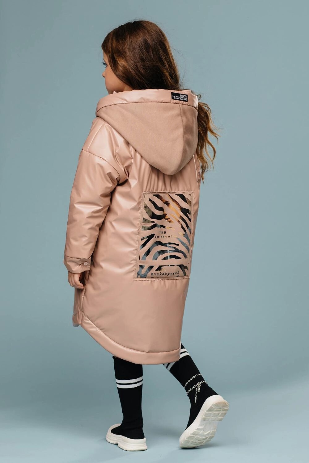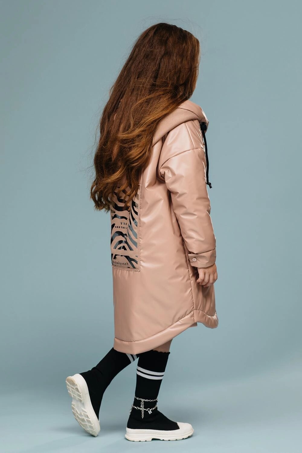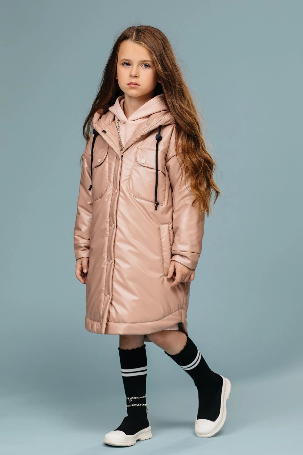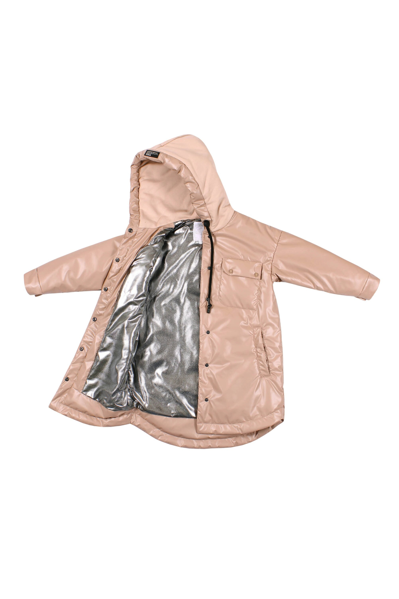 Пальто-"рубашка" прямого силуэта на кнопках. Рукав втачной, со спущенной линии плеча. Капюшон втачной в горловину, по краю капюшона кулиса регулируемая шнуром резинкой и стопорами. На переде обработаны нагрудные накладные карманы с клапанами и обработаны боковые, вертикальные прорезные карманы с листочкой. Низ рукава оформлен притачными манжетами застегивающимися на кнопки. Низ изделия-фигурный, с удлиненной спинкой и отделочной строчкой. Наполнитель: Слайтекс 150 г/м2. Ткань: курточная ткань с фактурой "эко-кожа". Подклада: фольгированная (омни хит).