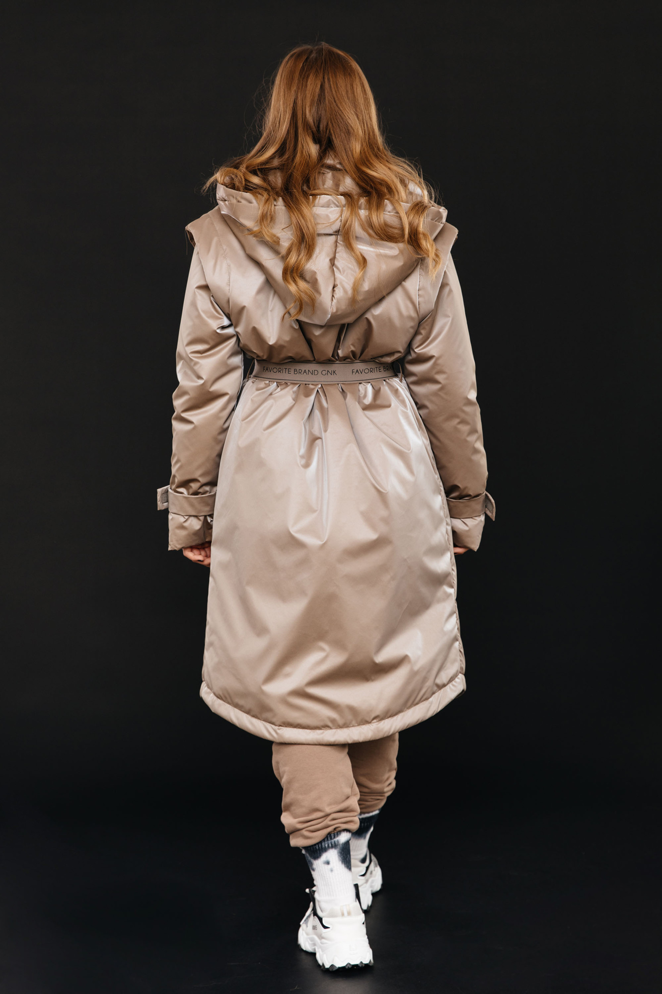 Пальто прямого силуэта со спущенной линией плеча. Верхний слой имитирует жилет. Воротник - стояче отложной с лацканами, застегивающимися на съемный пат с кнопками. По низу рукавов обработаны паты, застегивающиеся на ленту-велькро. Капюшон съемный, по краю капюшона регулируемая кулиса со шнуром и стопорами. С помощью съемного пояса возможна трансформация силуэта. Состав: Наполнитель: Слайтекс 150 г/м2; Ткань: курточная ткань с имитацией peach-эффекта (эффект "персика") с полиуретановым покрытием; Подклада: фольгированная (омни хит).
