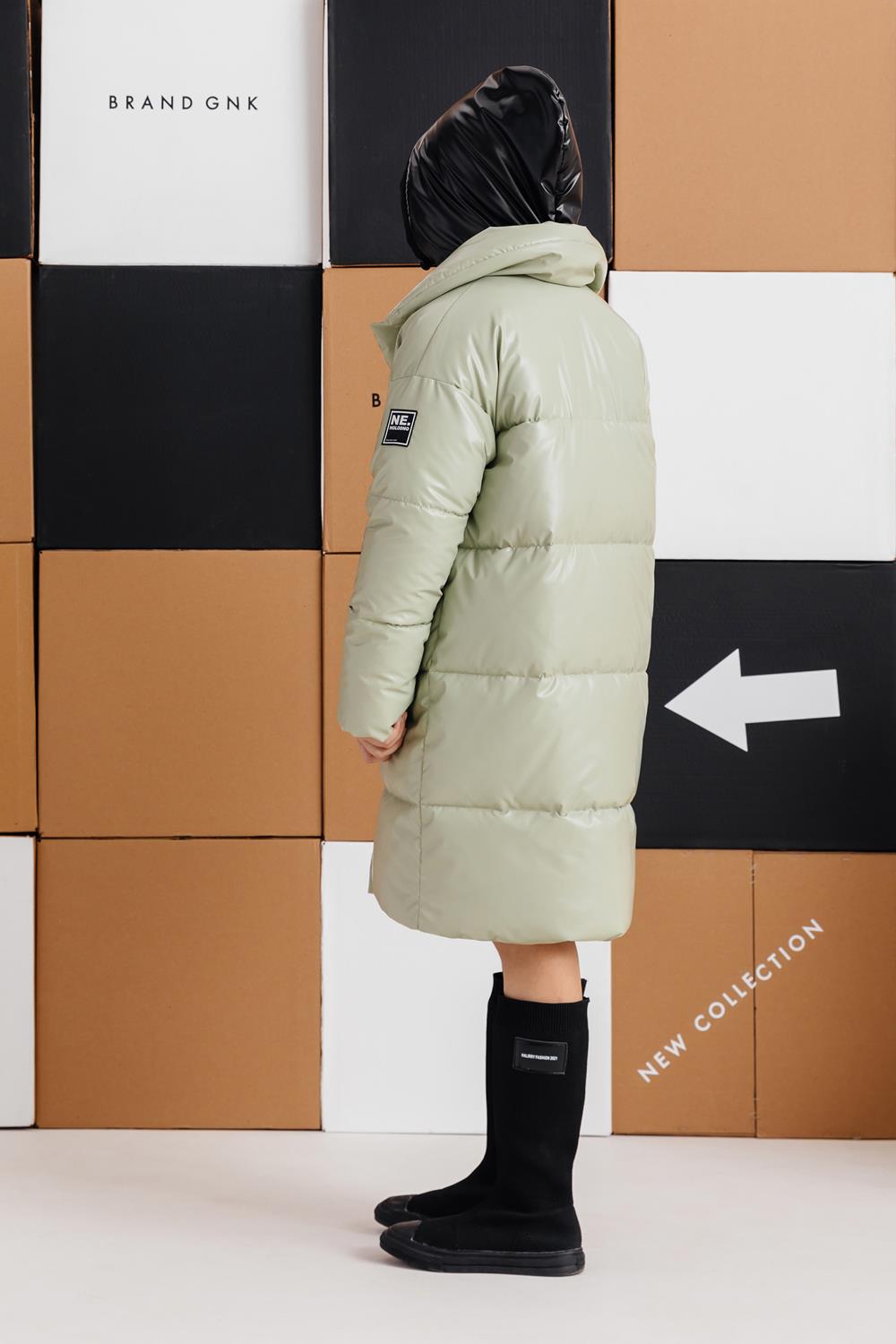 Пальто свободного прямого силуэта. Рукав втачной, со спущенной линией плеча. Застежка - центральная на молнию и потайные кнопки. Воротник - стояче отложной с лацканами, застегивающимися на пат с кнопками. Изделие стеганое широкими горизонтальными переборками. На переде обработаны боковые вертикальные прорезные карманы с листочками. Низ рукавов собран на резинку. Капюшон съемный одношовный с манишкой, застегивающейся на потайные кнопки. По краю капюшона регулируемая кулиса из футера со шнуром-резинкой и стопорами.