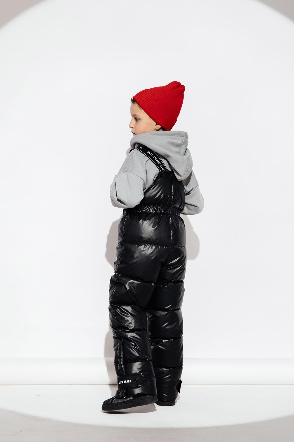 Полукомбинезон прямого силуэта, стеган горизонтальными переборками. Верхняя часть полукомбинезона застегивается на молнию, закрытую верхней ветрозащитной планкой на кнопках. Бретели регулируемые по длине, за счет резинки с рамкой. Пояс на спинке -с резинкой для удобства прилегания. По боковым швам полукомбинезона выполнены разрезы на застежку-молнию, с внутренней ветрозащитной планкой. Для возможности регулирования ширины брюк по низу предусмотрены паты с застежкой на ленту-велькро. Наполнитель: синтетический лебяжий пух Ткань: современная курточная ткань Подклада: 100% полиэфир.