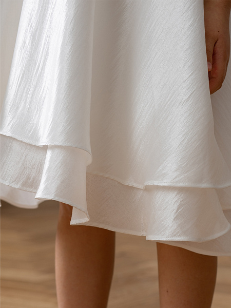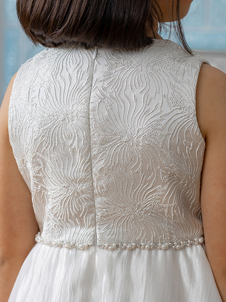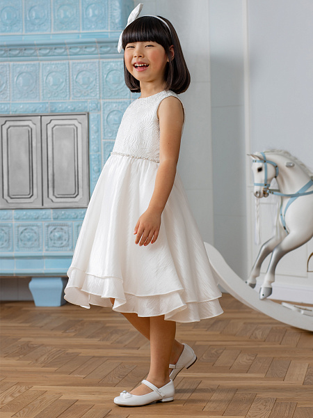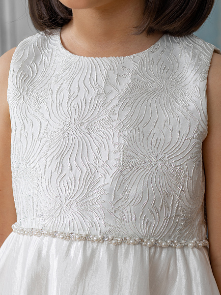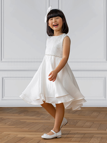 Платье белого цвета с изысканным дизайном — идеальный выбор для торжественных случаев. Верх платья выполнен из ткани с нежным орнаментом в тон, что придаёт образу утончённость. Лёгкая многослойная юбка создаёт эффект воздушности и подчёркивает элегантность наряда. В комплекте идёт ободок с милым бантиком сбоку, который идеально дополняет образ. Такой ансамбль подойдёт для праздников, фотосессий или других особых мероприятий. Платье подчеркнёт индивидуальность и создаст праздничное настроение.