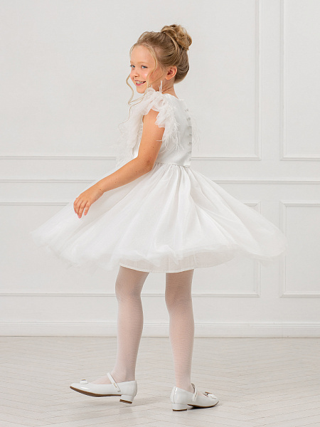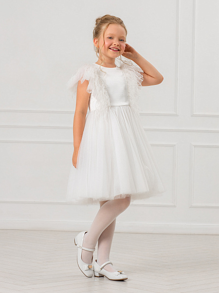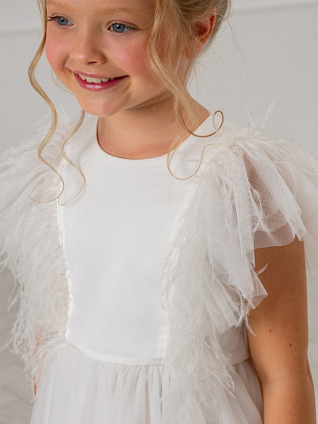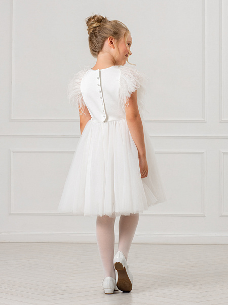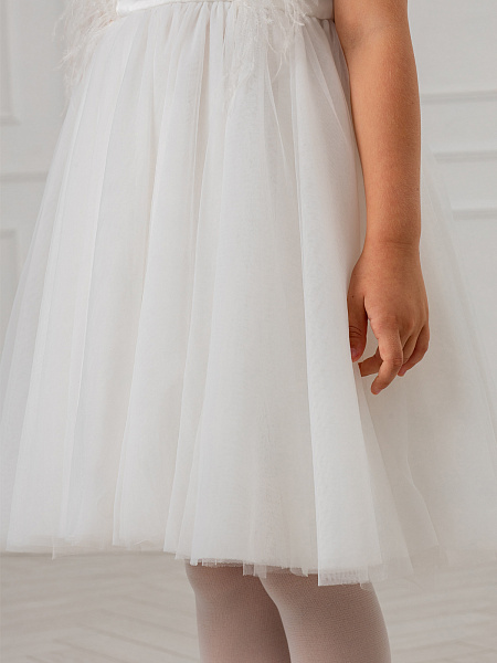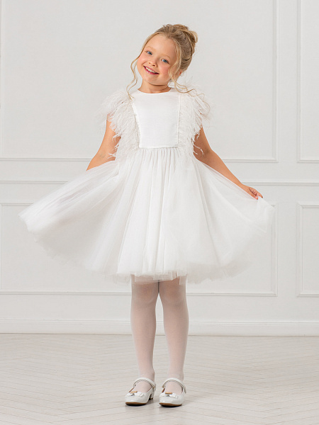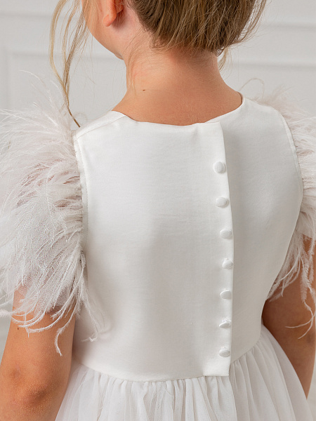Очаровательное белое платье для девочек. Изысканная модель привлекает внимание нежной пышной юбкой из воздушной сетки и изящной отделкой из перьев на груди и рукавах. Особого внимания заслуживает продуманная конструкция: оригинальная застёжка с декоративной планкой и удобными пуговицами по спинке обеспечивает комфортное надевание. Верх платья выполнен из качественного 100% полиэстера, а внутренняя подкладка — из мягкого 100% хлопка, что гарантирует комфорт в течение всего праздника. Это нарядное платье станет идеальным выбором для торжественных мероприятий, дней рождения и фотосессий. Элегантный дизайн и качественные материалы делают его настоящей находкой для создания незабываемого образа.