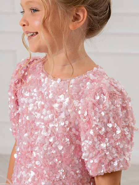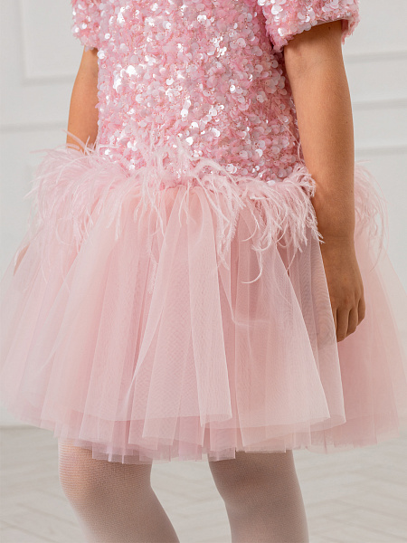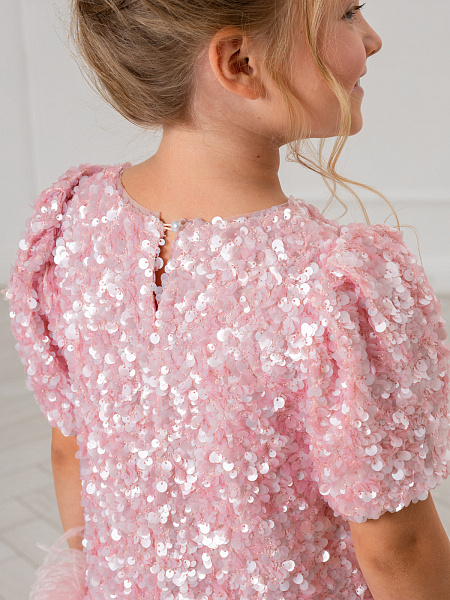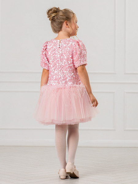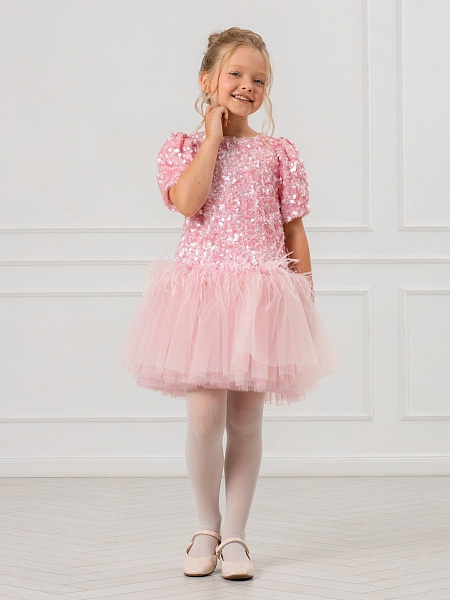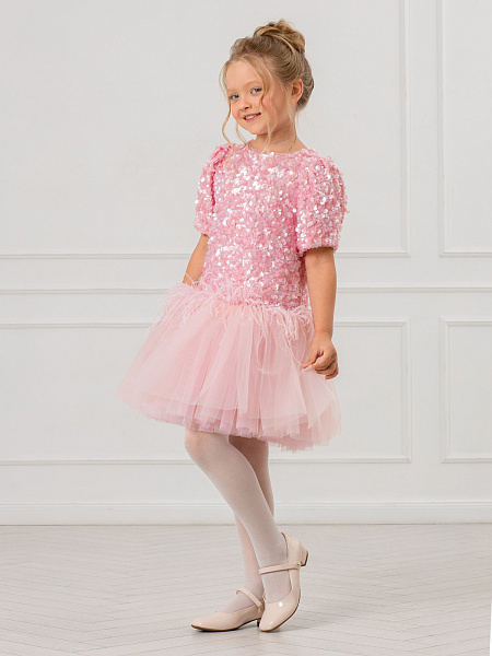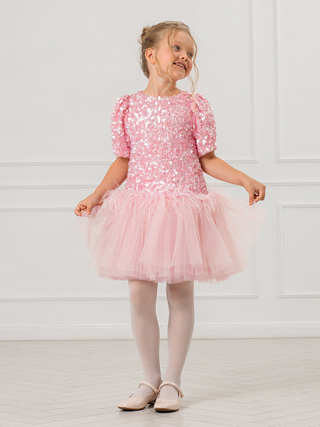 Нарядное платье для девочки в нежном розовом цвете. Модель привлекает внимание блестящей отделкой из пайеток, которые красиво переливаются при движении. Изящный А-силуэт и романтичные рукава-фонарики создают элегантный образ. Особую изюминку платью придаёт нижняя часть юбки из лёгкой сетки с изящными перьями. Комфортная посадка обеспечивается удобной застёжкой-молнией на спинке. Сочетание материалов делает платье практичным: верх выполнен из прочного 100% полиэстера, а внутренняя подкладка — из мягкого хлопка, который приятен к телу. Это платье станет идеальным выбором для праздников, утренников и других торжественных мероприятий. В нём ваша малышка будет чувствовать себя настоящей принцессой!