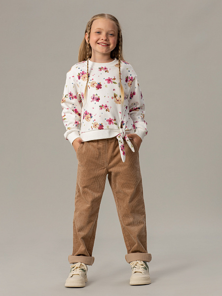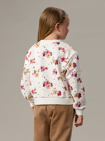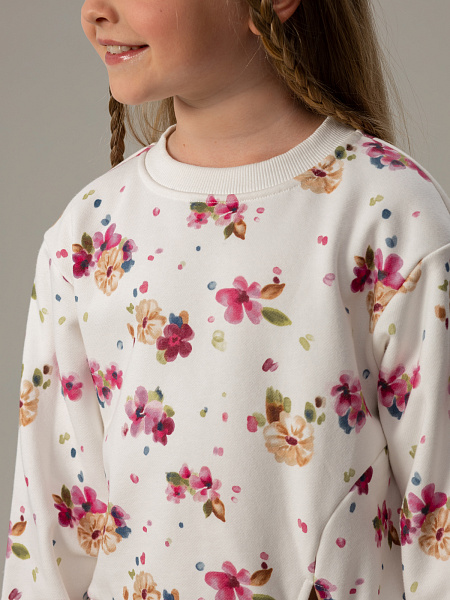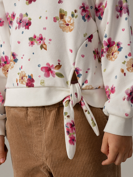 Очаровательный свитшот для девочки с ярким цветочным принтом станет настоящим украшением гардероба! Модель выполнена из смесового материала, состоящего из 89% хлопка и 11% полиэстера, что обеспечивает максимальный комфорт при носке. Натуральный хлопок позволяет коже дышать, а добавление полиэстера делает изделие практичным в уходе. Дизайн дополнен стильным декором: декоративной завязкой по низу, которая позволяет создавать разные образы, и элегантными рибамии по низу рукавов. Благодаря качественному составу и продуманному крою, свитшот отлично сидит по фигуре и подходит как для активных игр, так и для спокойных прогулок.