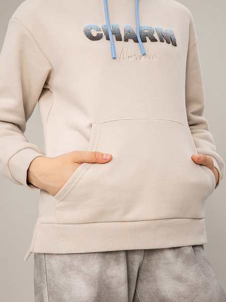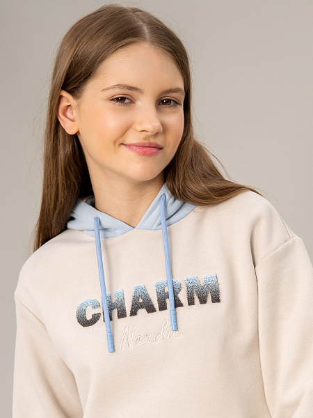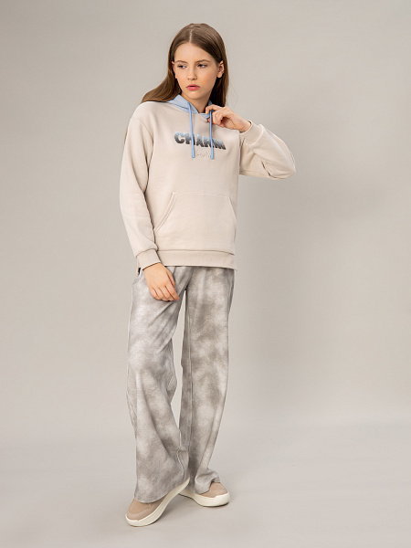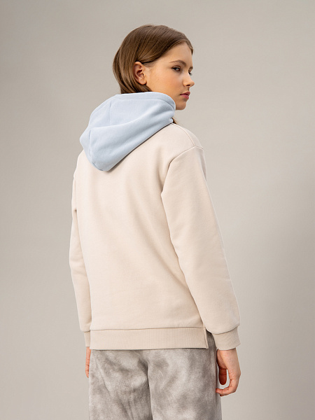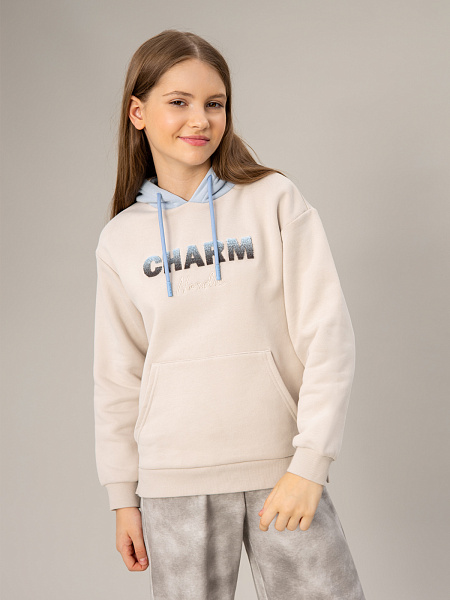 Комфортное худи для девочки выполнено из мягкого материала — хлопка с добавлением полиэстера, что обеспечивает приятные тактильные ощущения и долговечность изделия. Модель представлена в сером цвете и дополнена ярким голубым капюшоном, создающим стильный контраст. Оригинальный ворсистый принт придаёт модели индивидуальность. Капюшон оснащён шнурком для регулировки, что позволяет настроить посадку по желанию. Удобный карман-кенгуру добавляет практичности, а эластичные рибы по низу изделия и манжетам обеспечивают комфортную посадку. Эта модель отлично подойдёт для повседневной носки и активного отдыха.