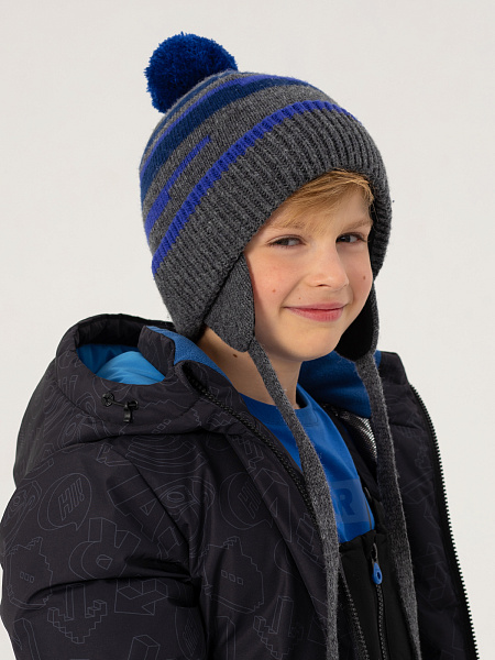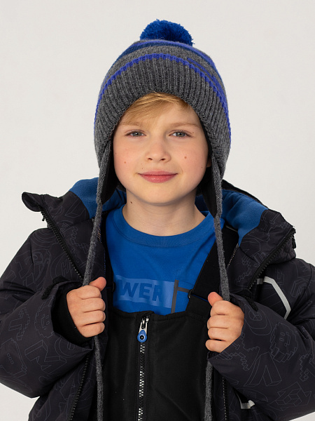 Теплая вязаная шапка для мальчика выполнена в сером цвете с яркими синими акцентами. Модель изготовлена из премиальной пряжи с добавлением шерсти, кашемира и полиамида, что обеспечивает отличную теплоизоляцию и комфорт при носке. Дизайн дополнен милыми ушками, длинными завязками для надежной фиксации и стильным небольшим помпоном. Мягкая внутренняя подкладка делает шапку особенно комфортной. Прочная конструкция и качественные материалы гарантируют долговечность изделия. Шапка отлично держит форму и сохраняет свои свойства после стирки. Идеальный выбор для зимних прогулок и активного отдыха.