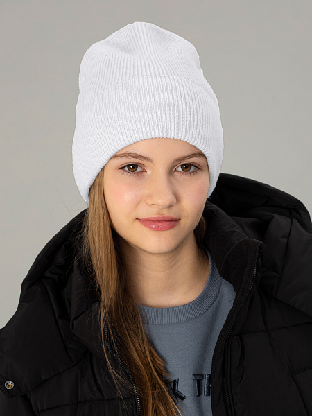 Белая шапка для девочки с подворотом и классической вязкой в рубчик. Модель выполнена из натуральной 100% шерсти, обеспечивающей отличную теплоизоляцию и комфорт. Плотная вязка сохраняет форму изделия, а натуральный материал гарантирует хорошую воздухопроницаемость. Универсальный дизайн подходит для зимнего и демисезонного периода, надёжно защищая от холода и легко сочетаясь с любой одеждой.