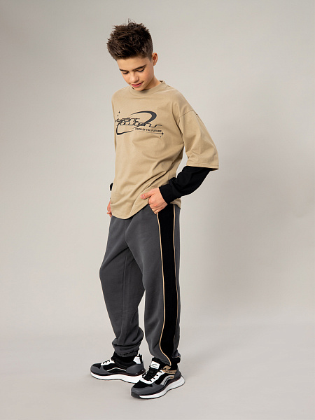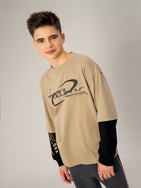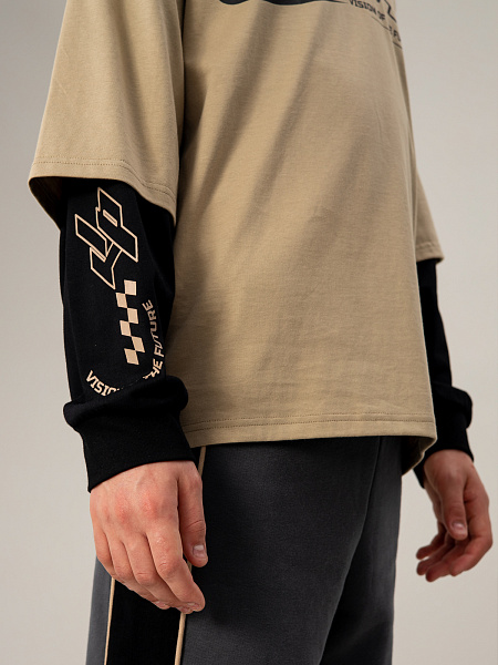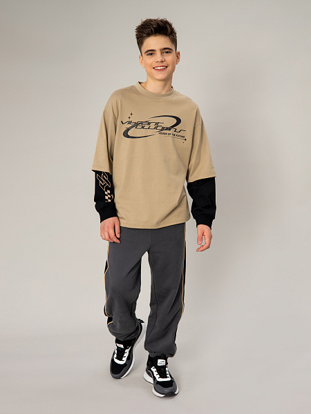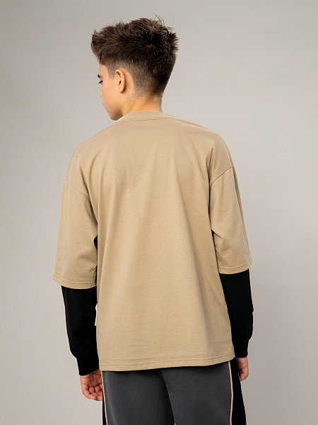 Бежевый лонгслив для мальчика отличается стильным дизайном с контрастными чёрными рукавами, а так же выразительными принтами на груди и рукаве. Свободный силуэт обеспечивает комфорт при движении. Комфортную посадку обеспечивают эластичные рибы по горловине и низу рукавов. Хлопковая ткань отлично пропускает воздух, не вызывает аллергии и проста в уходе. Лонгслив идеально подходит для повседневной носки и активного отдыха, легко комбинируется с другой одеждой.