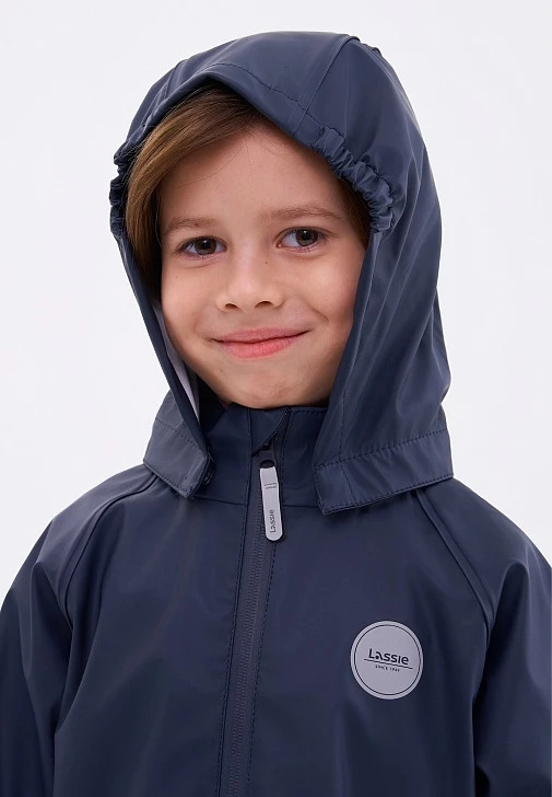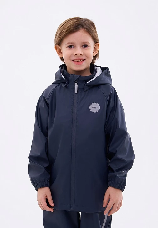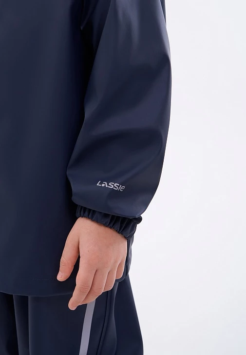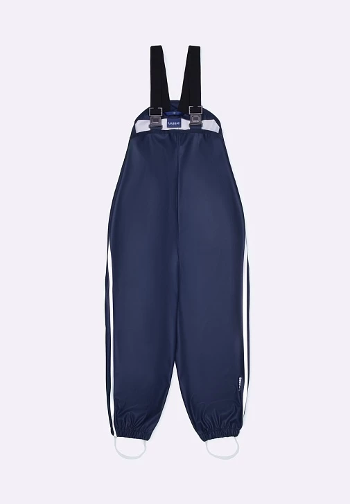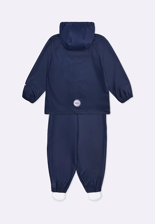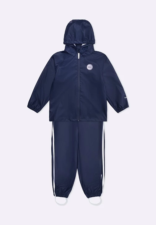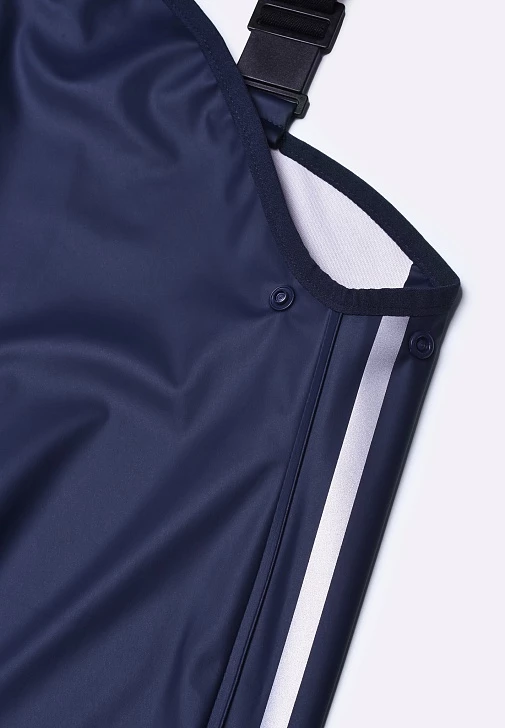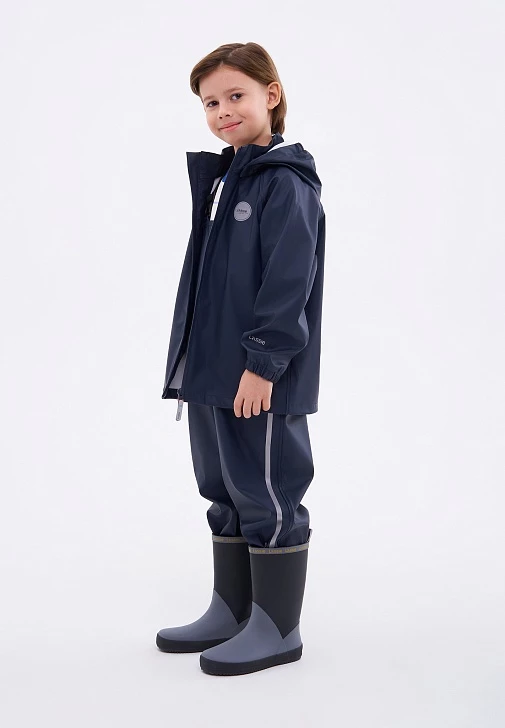 Комплект из дождевой ткани — брюки на подтяжках и куртка. Водонепроницаемый материал быстро сохнет. Все швы запаяны. Добавлены светоотражающие детали. Капюшон куртки легко отстегивается. На манжетах резинки для защиты от ветра. Силиконовые штрипки фиксируют штанины на ноге. Застежка на молнии для быстрого переодевания. Регулируемые подтяжки и кнопки на талии обеспечивают комфортную посадку.