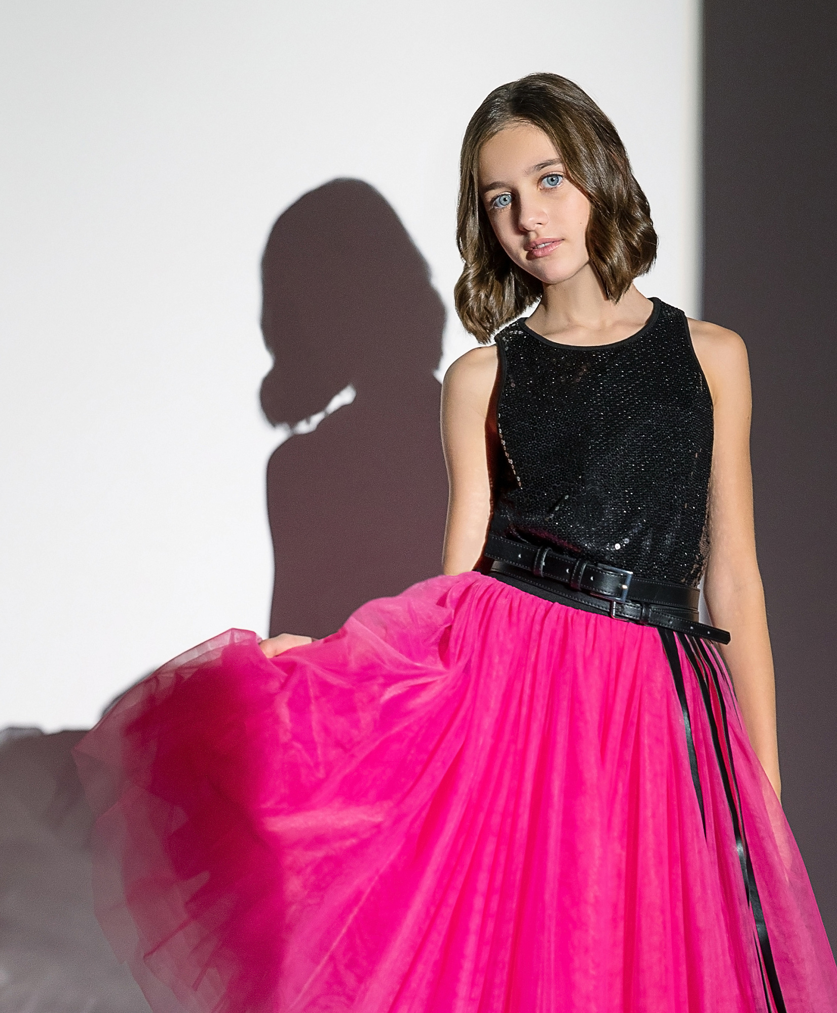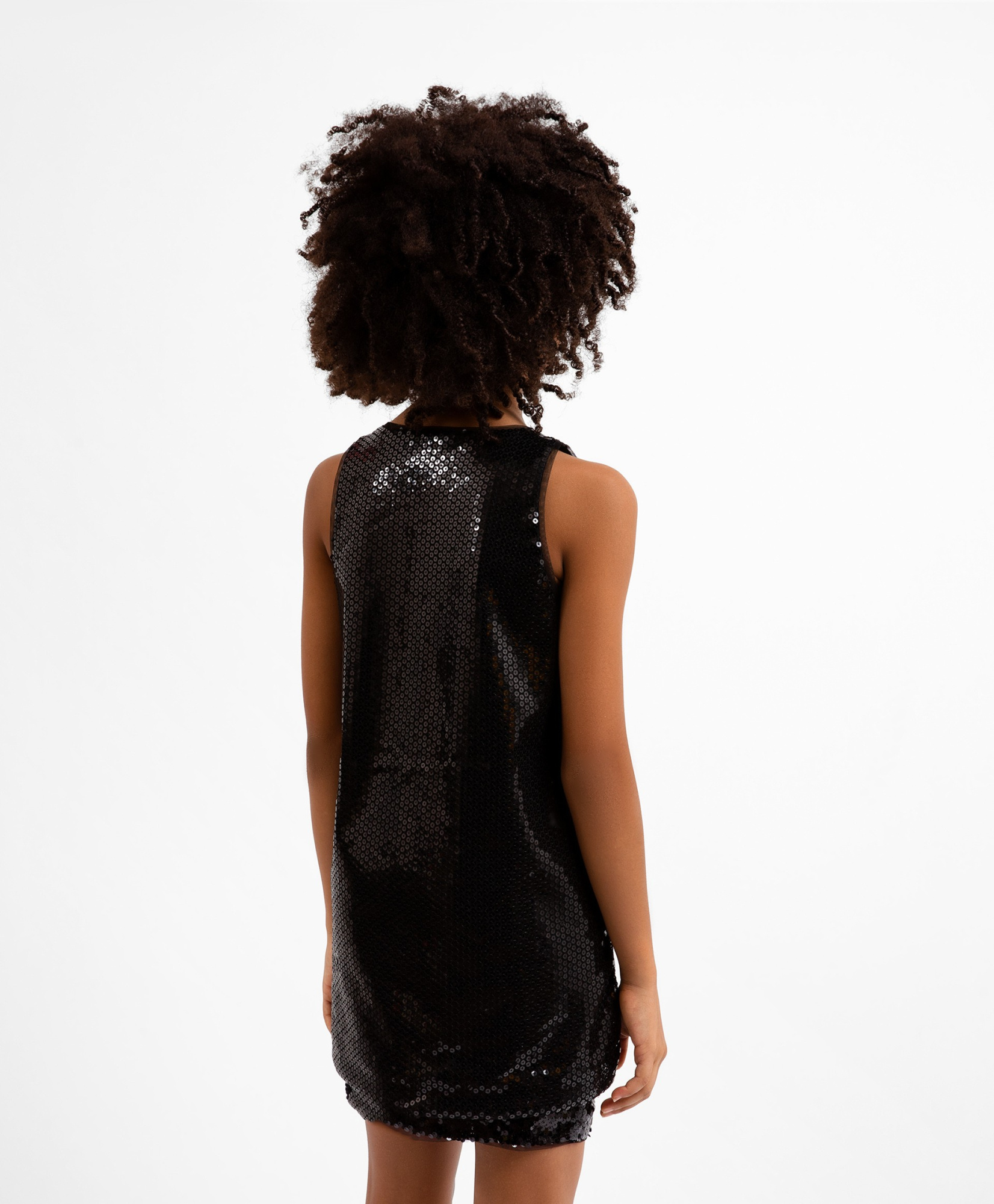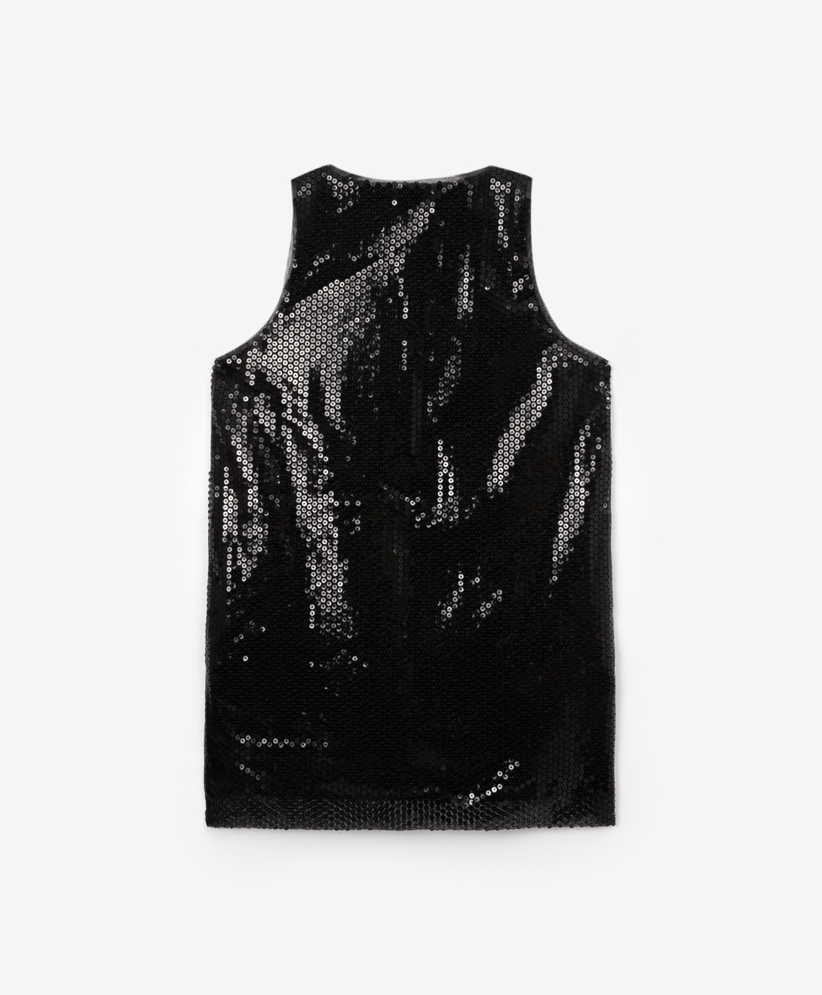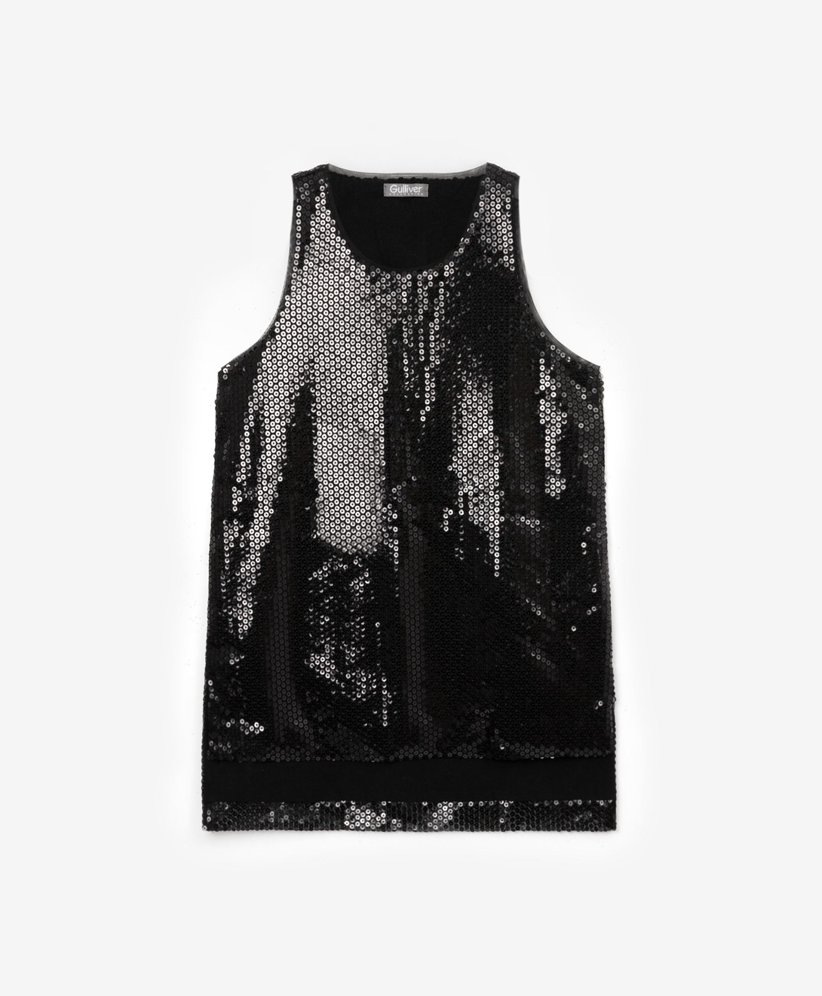 Черный топ, выполненный из материала, расшитого сверкающими пайетками, иллюстрирует минимализм в дизайне изделий. Когда ткань столь активна, выразительна и ярка, форма модели должна быть сдержанной и лаконичной. В любом случае, девочка будет сиять, создавая стильный завершенный образ. Топ имеет хлопковую подкладку для приятных тактильных ощущений при взаимодействии с вещью.
