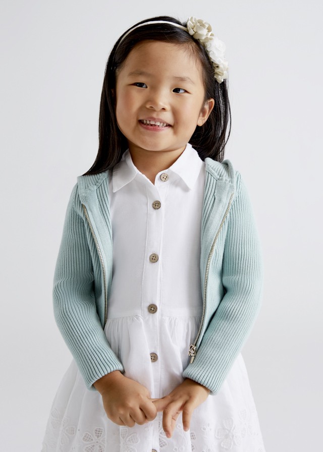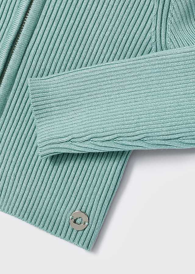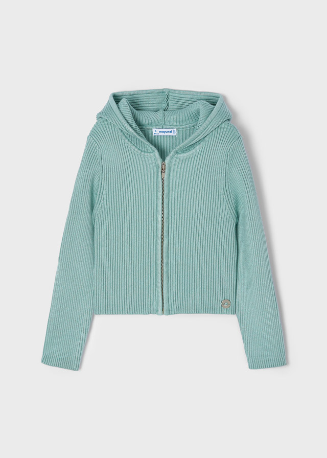 Бирюзовый кардиган с капюшоном бренда Mayoral прекрасно подойдёт как для обычного, повседневного образа, так и для нарядного случая. Изделие свободного кроя, застёгивается на молнию.  Жакет выполнен из вискозы с добавлением полиамида.