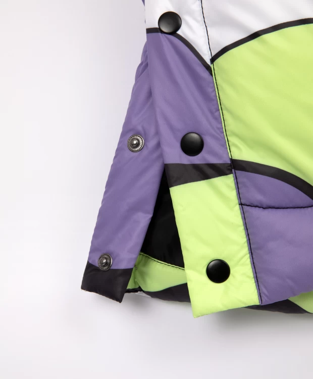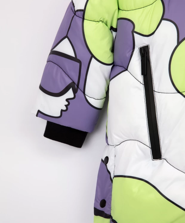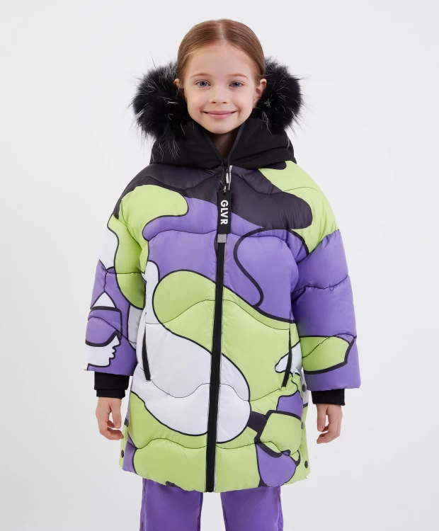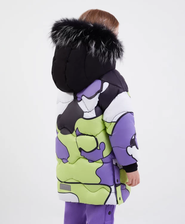 Зимнее пальто на искусственном пуху из коллекции "Киви" сделает образ девочки запоминающимся и ярким! Дизайн модели построен на сочетании фактур основного глянцевого материала и матовой плащовки на капюшоне, и динамичном рисунке. Насыщенные цвета, участвующие в принте: лаймовый, сиреневый, белый и черный поддержаны черными литыми влагостойкими молниями и черной отделкой. Объемная прямая форма со спущенным плечом формируют современные пропорции в образе, придает пальто уют и комфорт. Интересное конструктивное решение - высокие шлицы в боковых швах, застегивающиеся на кнопки, создают удобство при активной ходьбе. В оформлении модели использован оригинальный зиппер-пуллер, состоящий из резиновой таблички с шрифтовыми элементами и светоотражающей планки. Пальто имеет внутренние утяжки на линии талии и капюшоне для дополнительной защиты от ветра. Натуральный мех енота на капюшоне создает ощущение тепла, уюта, защищенности, делает изделие завершенным.
