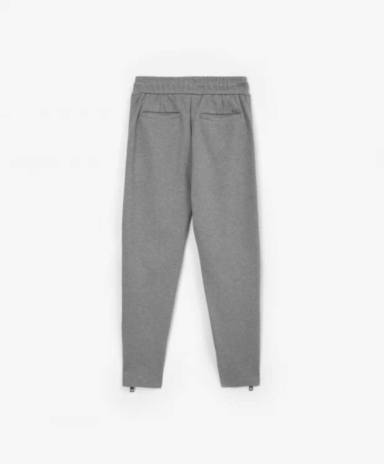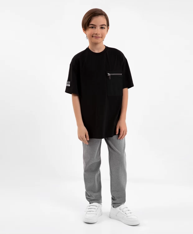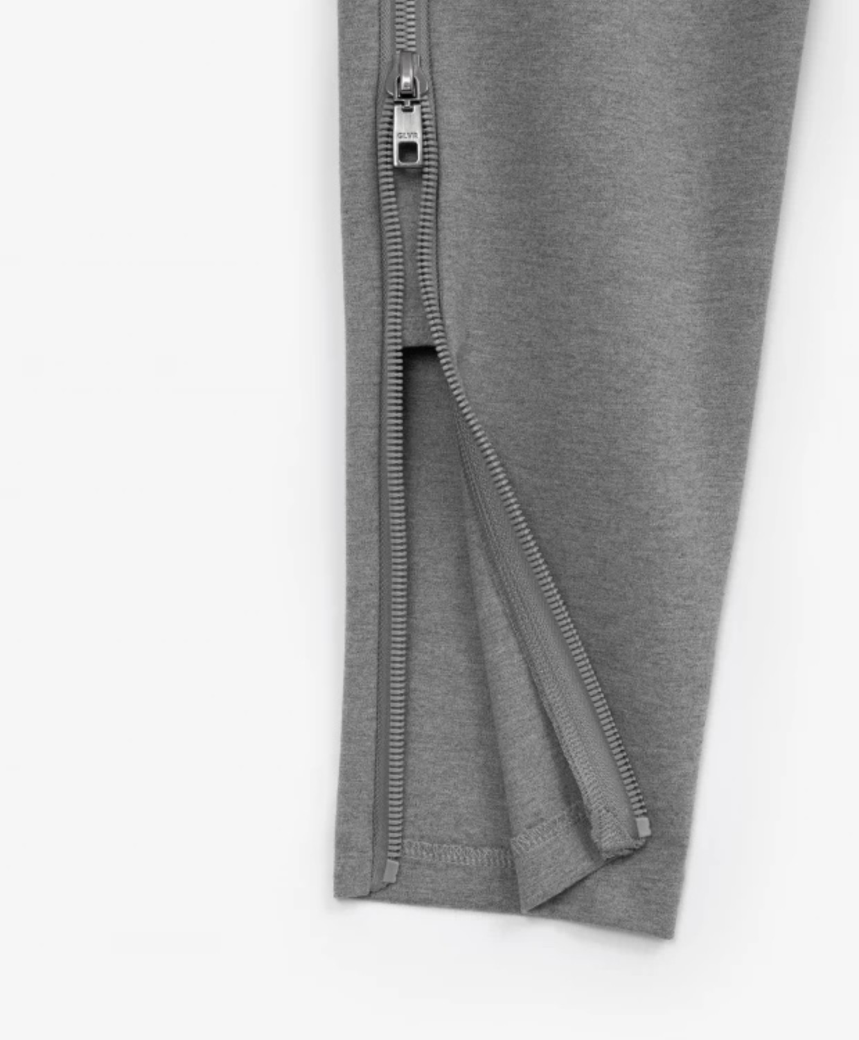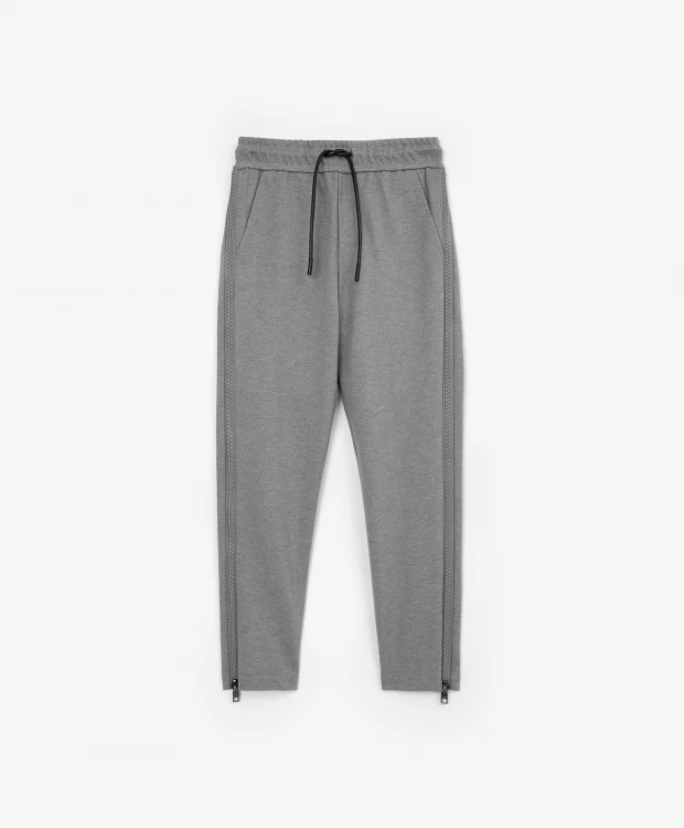 Серые трикотажные брюки из плотного формоустойчивого меланжевого джерси - стильный, удобный, практичный вариант! Дизайн модели, акцентирующий внимание на боковых швах, в которые интегрированы крупные пластиковые молнии, делает брюки модными и необычными. Молнии в цвет основного материала не создают контраста, что важно для учебных заведений, соблюдающих  дресс-код, но они наделяют модель яркой индивидуальностью и брутальным характером, свойственным изделиям в спортивном стиле. Молнии могут расстегиваться с низа до верха, при этом боковой шов оснащен внутренней планкой, делающей эффект расстегнутых молний ложным. Расстегиваться полностью молнии могут лишь в нижней части, создавая впечатление высокого разреза. В оформлении брюк использованы функциональный шнур-утяжка с глянцевым силиконовым покрытием, а также небольшая брендированная металлическая табличка.