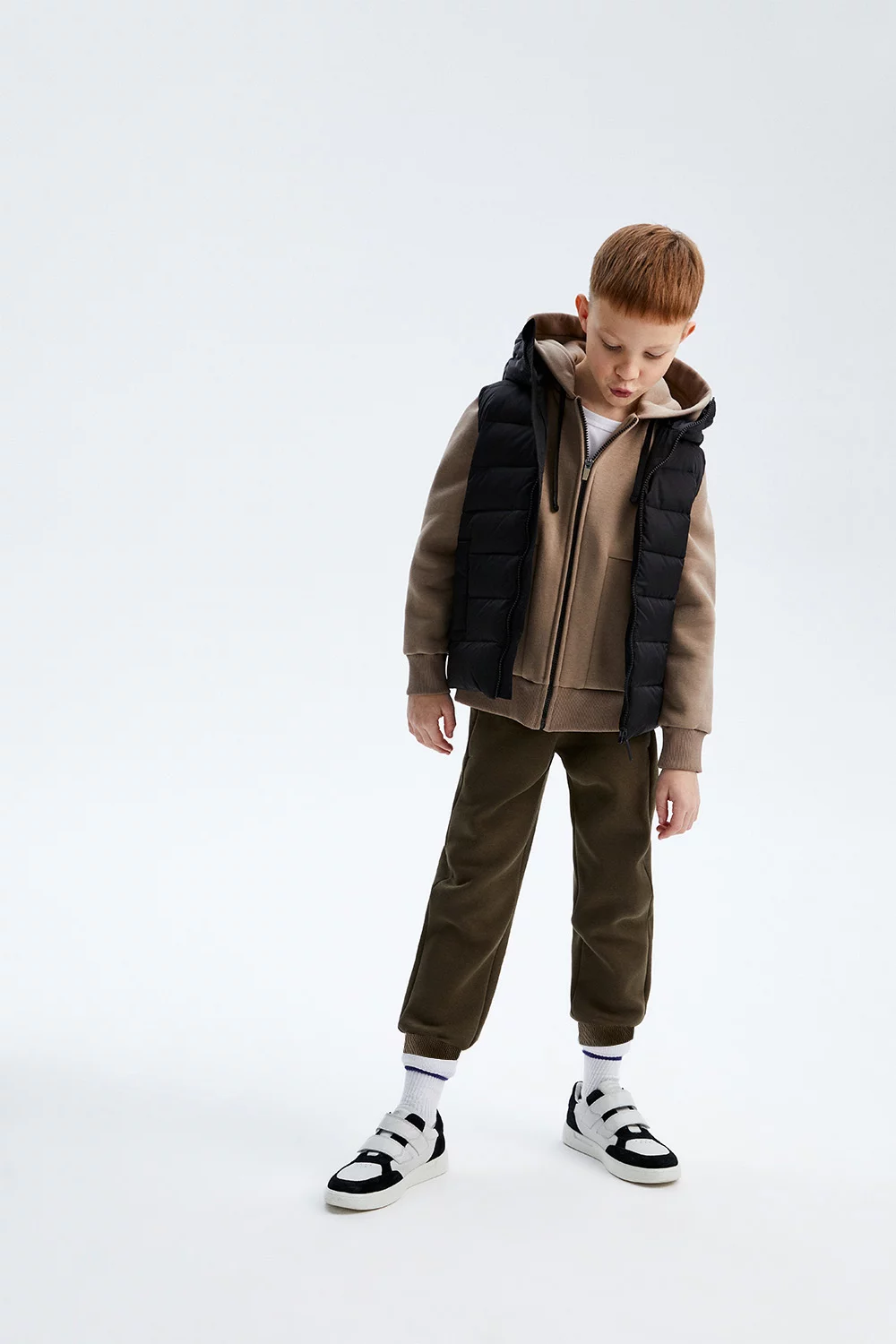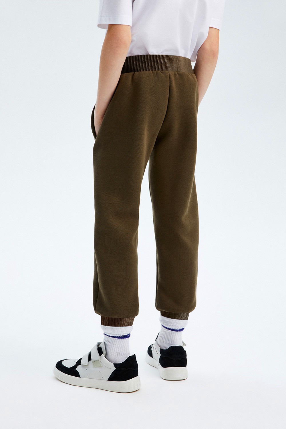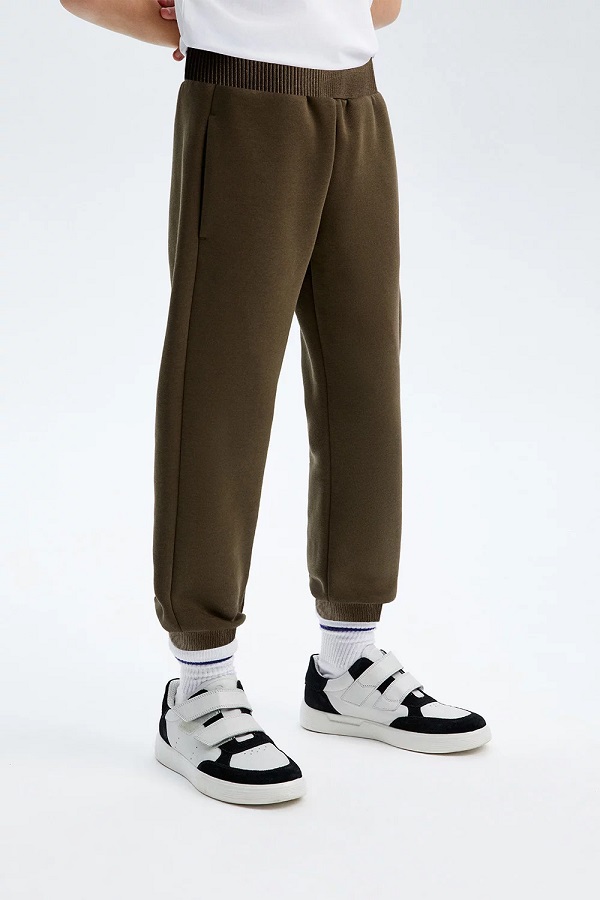 Джоггеры цвета "хаки" из футера с начесом. Модель прямого силуэта, слегка зауженные к низу. Глубокие карманы в боковых швах. Эластичная резинка для идеальной посадки. Пояс и низ брюк выполнены рибаной.