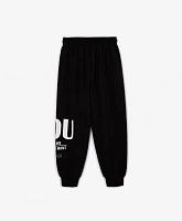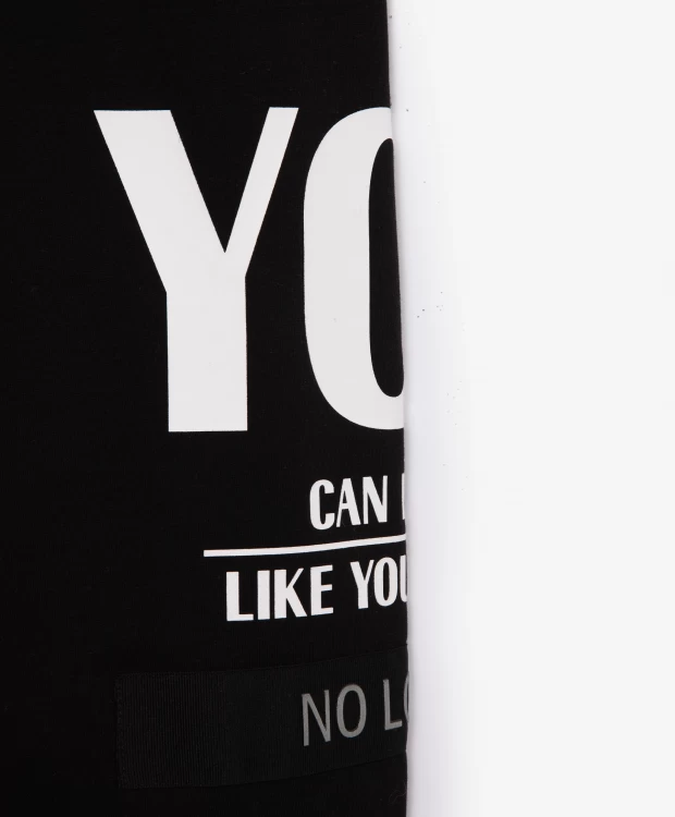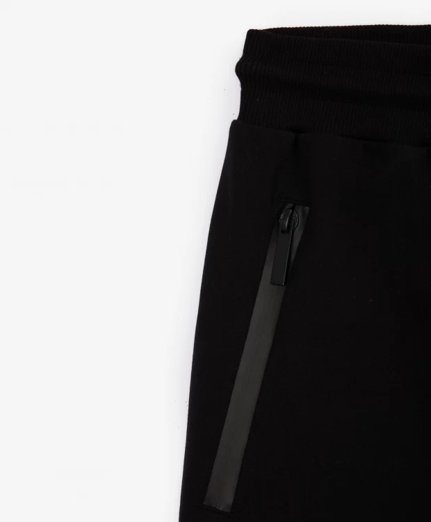 Брюки-джоггеры из мягкого пластичного футера - неотъемлемая составляющая продуманного и комфортного повседневного гардероба! Дизайн модели построен на ярких приметах спортивного стиля: литых молниях на карманах, крупном шрифтовом принте с глянцевой фактурой, расположенном асимметрично, контрастных кордах с пластиковыми наконечниками. В оформлении брюк, также, использован светоотражающий принт, способствующий безопасности мальчика в темное время суток.