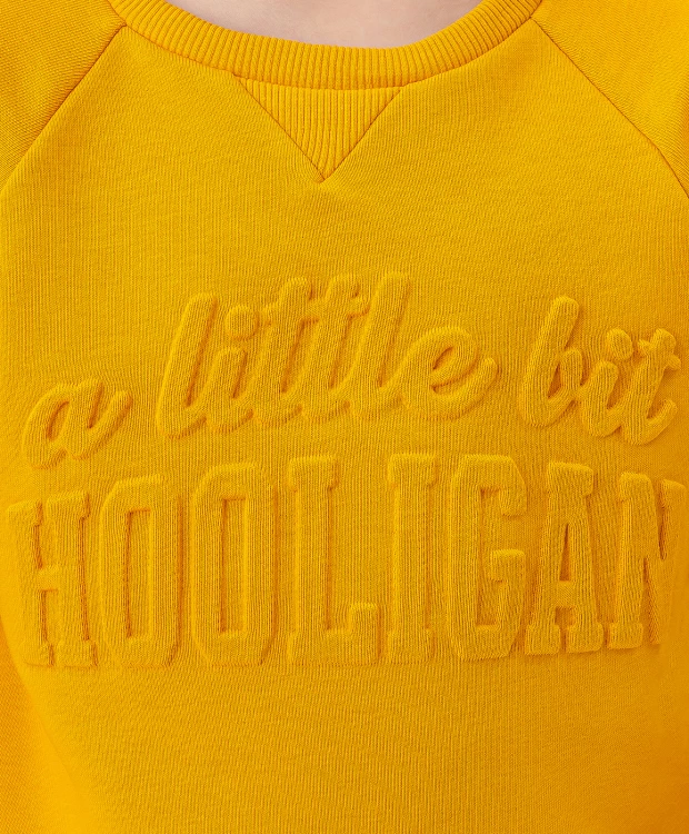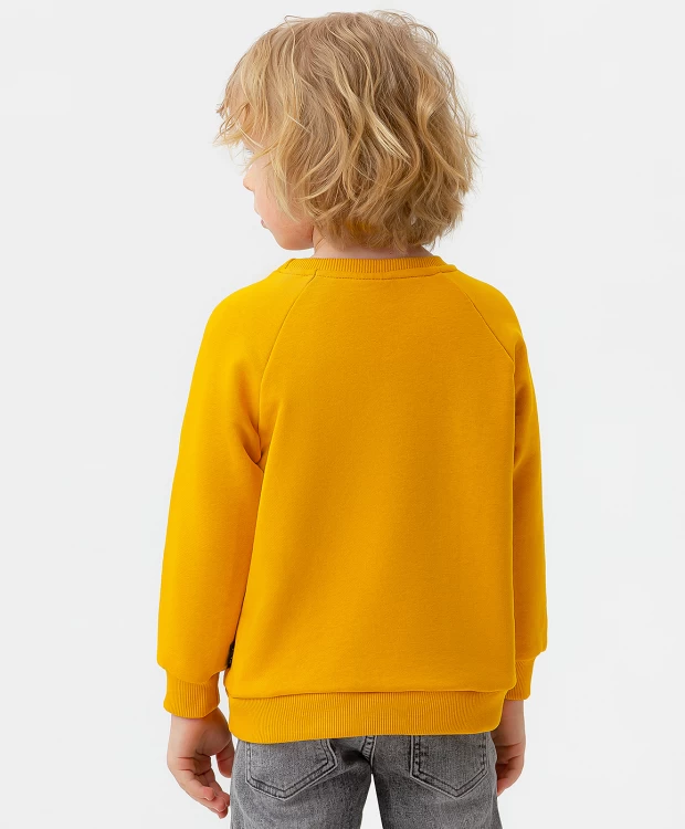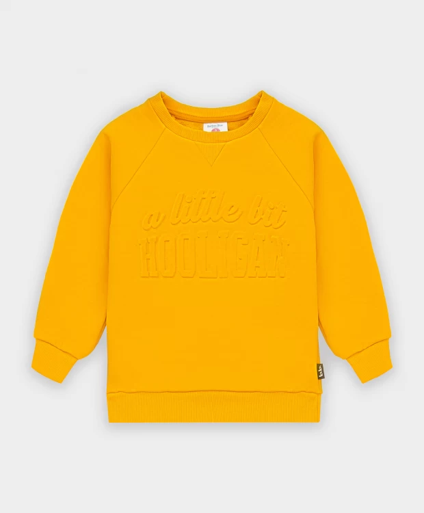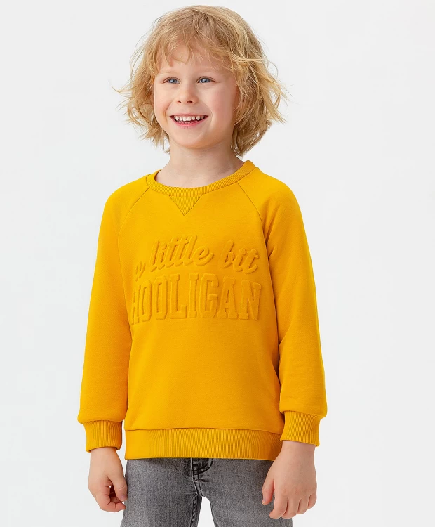 Желтый свитшот для мальчика с округлой горловиной согреет ребенка в межсезонье и подарит заряд хорошего настроения благодаря стильному текстовому принту. Уютная модель из футера имеет гладкую лицевую сторону и петельчатую изнанку без начеса. Мягкая хлопковая ткань с добавленным в состав эластаном приятна на ощупь, проста в уходе и обеспечивает оптимальную терморегуляцию. Прямой крой изделия с рукавом реглан способствует свободной посадке для легкости в каждом движении. Низ изделия, горловина и манжеты выполнены из эластичного рибового материала, который мягко прилегает к телу. Крупный текстовый принт на полочке кофты сделает любой образ стильным и запоминающимся. Детский свитшот в стиле casual оптимально сочетается с джоггерами, джинсами и брюками из капсульной коллекции Button Blue.