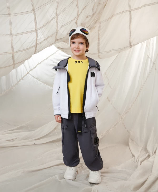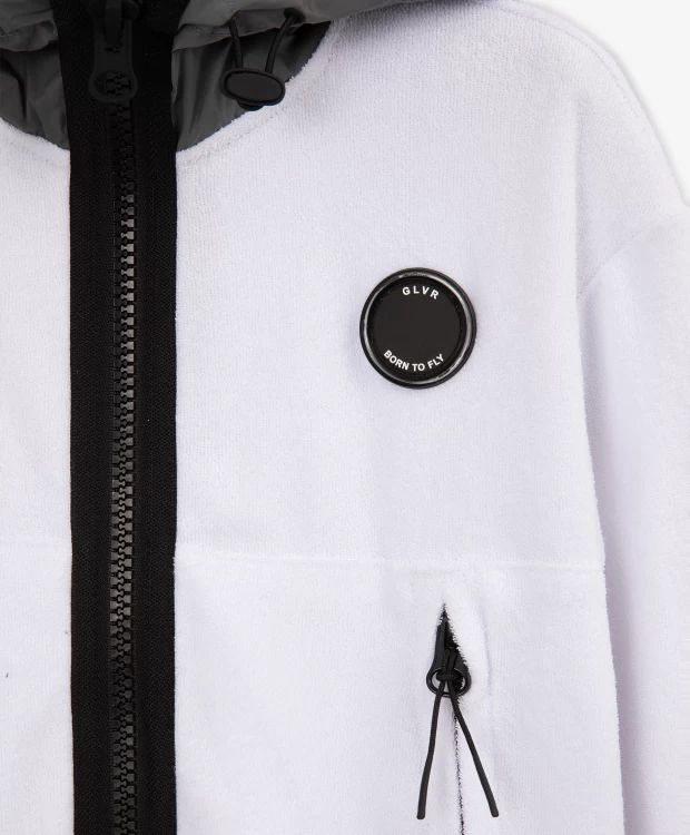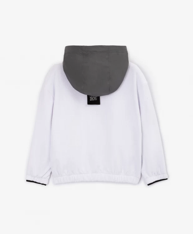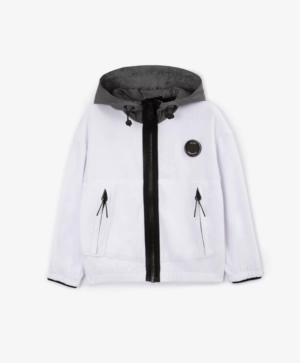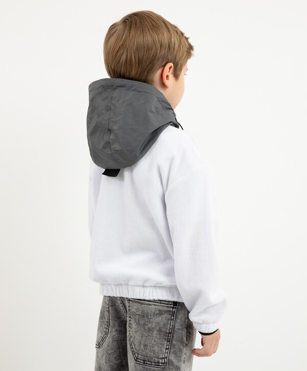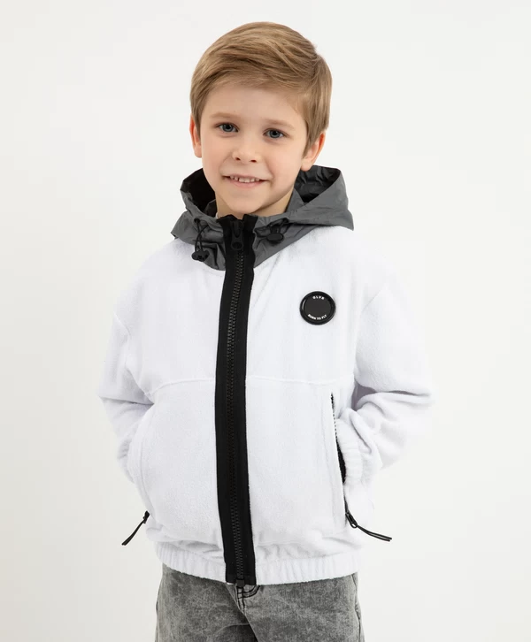 Распашная толстовка из махрового трикотажного полотна - модная, острая, интересная вещь! Дизайн модели построен сочетании фактур махрового трикотажа и серо-серебристой плащовки на капюшоне, а также на брутальных деталях, придающих толстовке современный вид. Контрастные тракторные молнии на центральной застежке и карманах, отлетной ярлык с текстовым принтом, круглый оригинальный шеврон и т.п. - все работает на образ стильного, энергичного мальчика, неравнодушного к трендам.