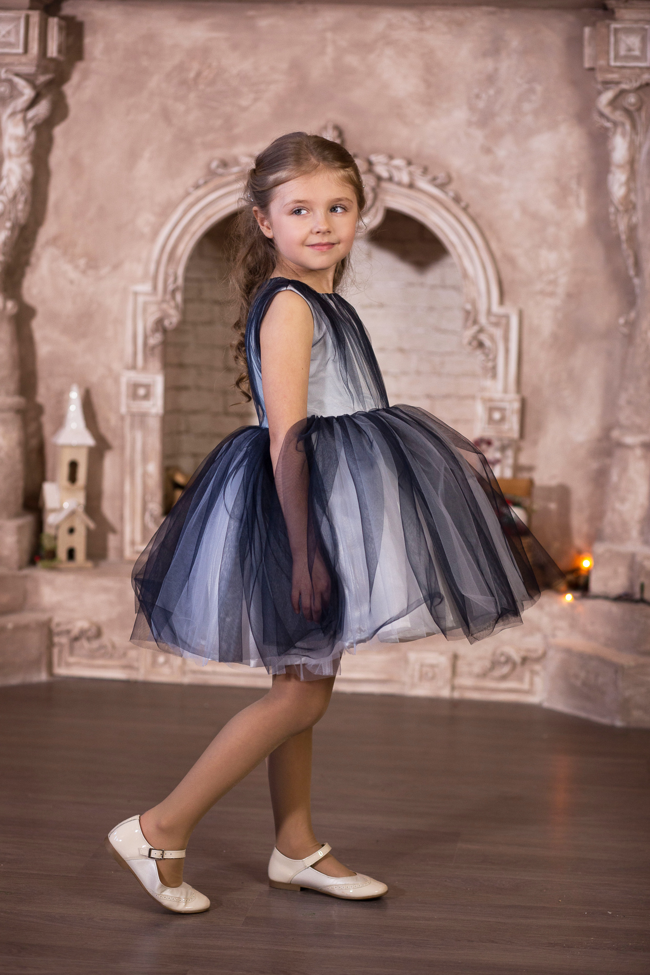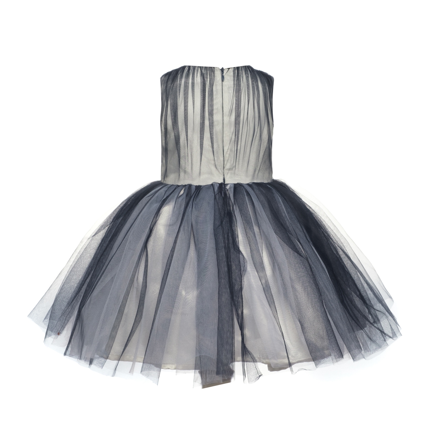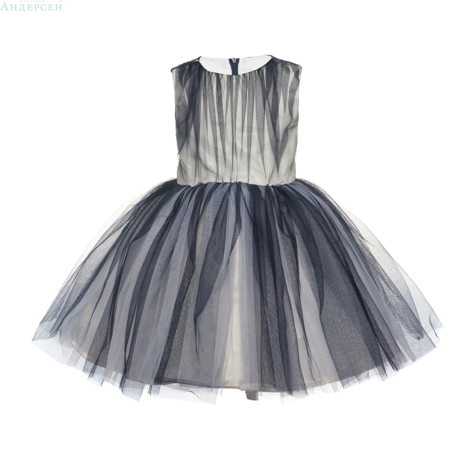 Безусловная изюминка данной модели - эффект омбре. Молочный атлас платья затянут синим фатином в складку. Платье без рукавов, отрезное по талии.