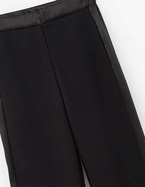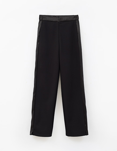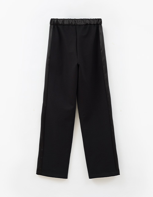 Стильные чёрные брюки для девочки. Комфортная прямая модель с высокой посадкой. Вставка из сатиновой ткани по бокам и на мягком эластичном поясе. Застёжка на потайную молнию. Брюки дополнены карманами в шве.