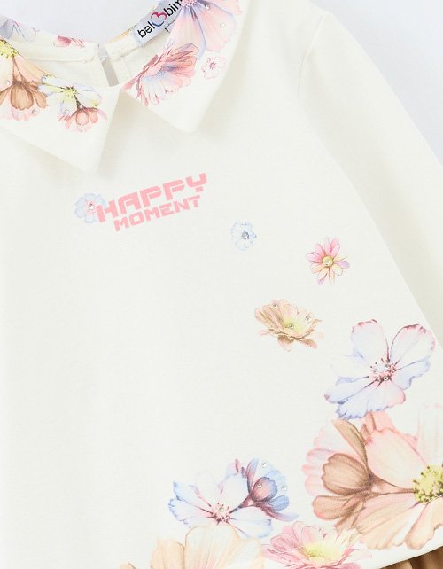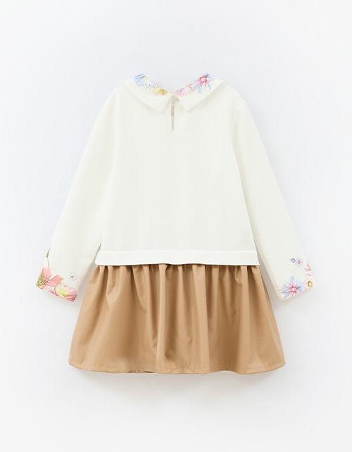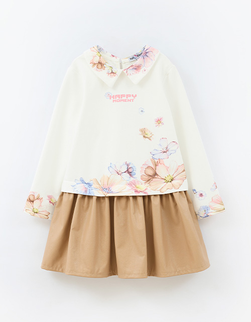 Стильное платье для девочки. Модель комфортного А-образного силуэта с воланом из эко кожи по низу. Длинный рукав. Застёжка на пуговицу на спинке. Платье декорировано авторским цифровым принтом и стразами.