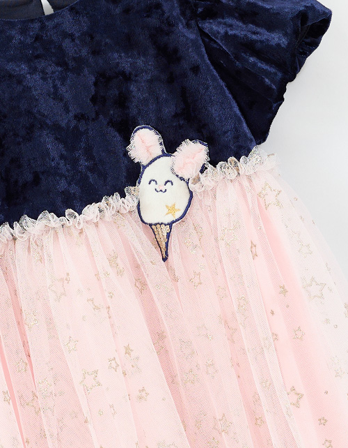 Платье для девочки. А-образный силуэт, короткий пышный рукав. Верх из бархата глубокого синего цвета. Юбка из фатина с золотыми звёздами. Аппликация-вышивка "зайчик-мороженое". Внутри кулирная гладь, все срезы закрыты. Застёжка на пуговицу по спинке.