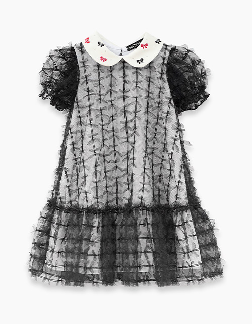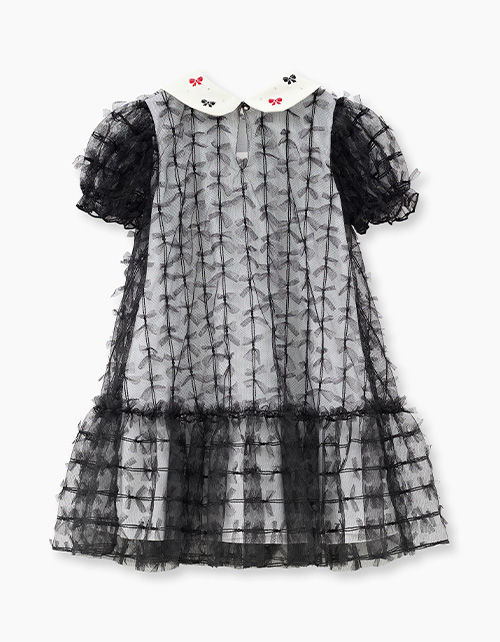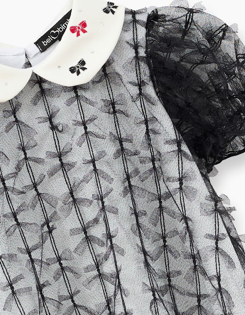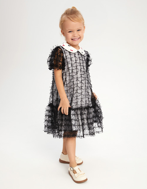 Чёрное платье для особых случаев. Комфортный А-образный силуэт. Короткий рукав со сборкой на резиновую нить. Застёжка на пуговицу по спинке. Комбинация материалов: кулирная гладь и сетчатое полотно. Атласный воротник декорирован вышивкой и стразами.