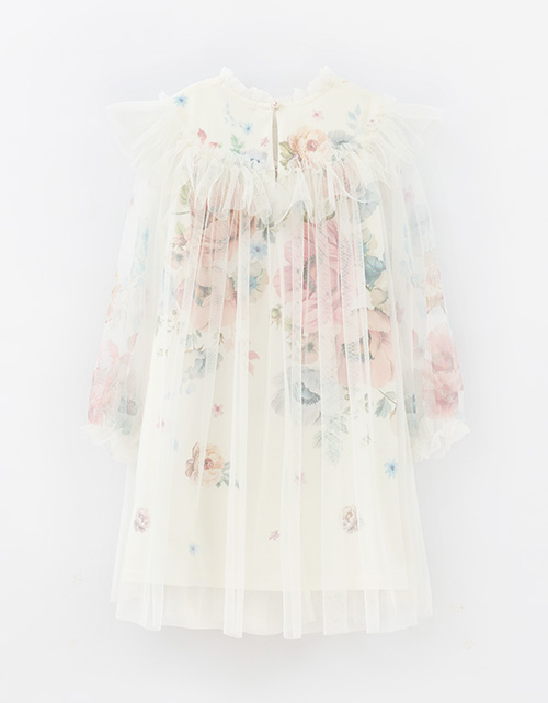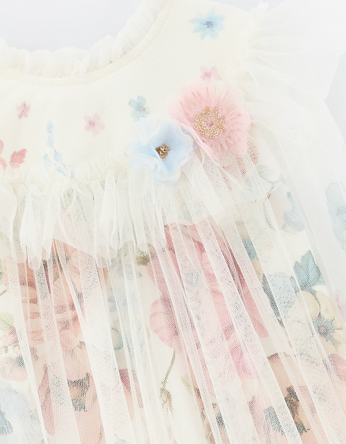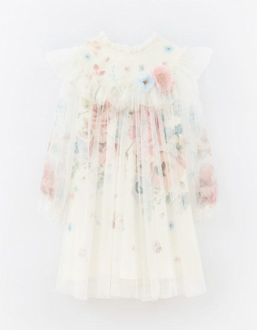 Воздушное платье с ноткой ретро. Модель комфортного летящего А-образного силуэта. Удобная застёжка на пуговицу. Длинный свободный рукав с рюшей на тонкой резинке. Платье выполнено из мягкой сетки и кулирной глади с авторским принтом. Крафтовые цветы.