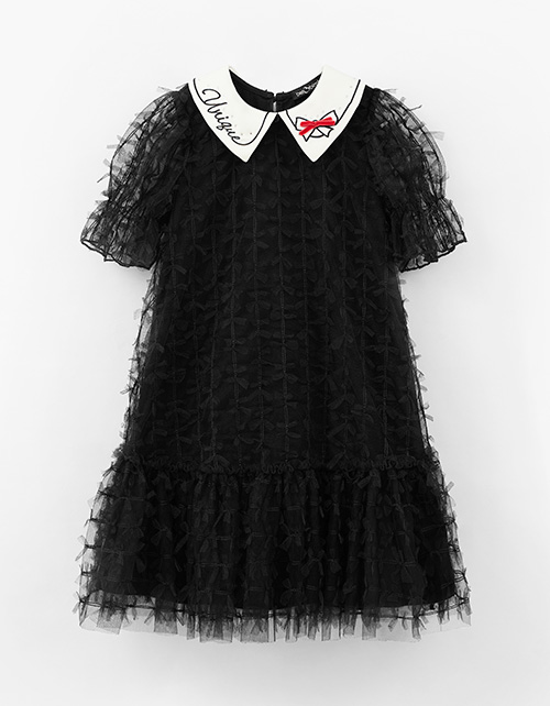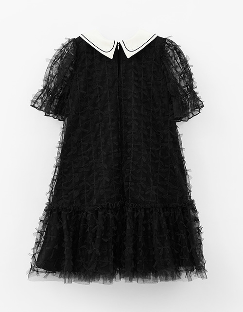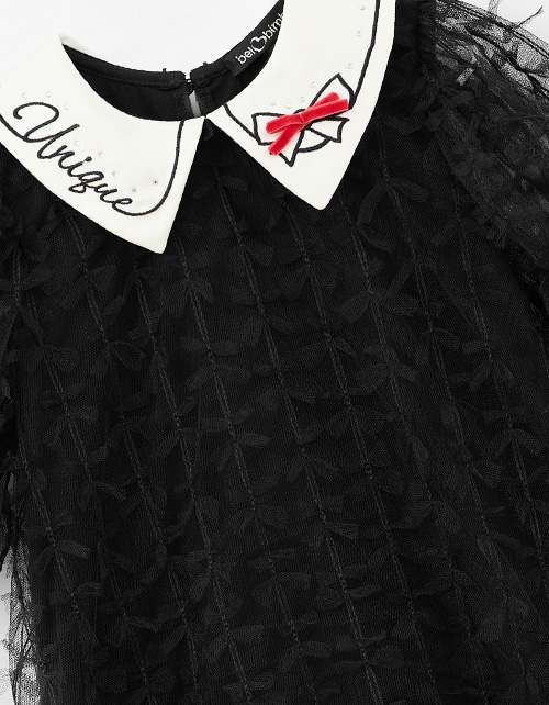 Элегантное чёрное платье. Комфортный А-образный силуэт. Объёмный рукав со сборкой на резиновую нить. Застёжка на пуговицу. Комбинация материалов: кулирная гладь и сетчатое полотно. Атласный воротник декорирован вышивкой, стразами и бархатным бантиком