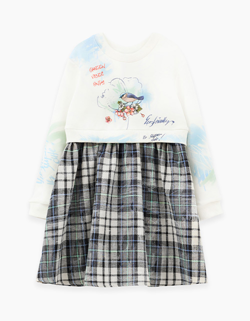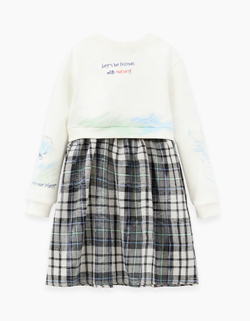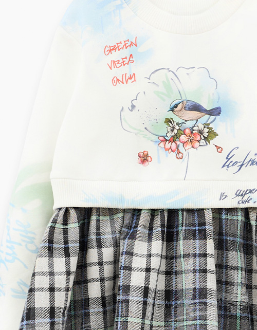 Авторское лёгкое платье для девочки. Модель комфортного А-образного силуэта, без застёжки. Комбинированное платье: футер и фланель. Горловина, манжеты и низ части из футера из эластичной рибаны. Платье декорировано дизайнерскими принтами.