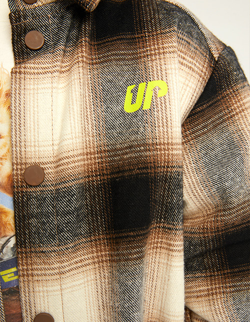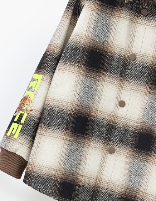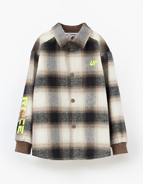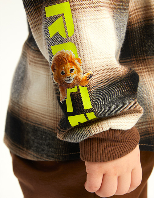 Рубашка в клетку из 100% хлопка для мальчика. Прямая модель с фигурным низом. Приспущенная линия плеча. Манжеты из эластичной рибаны. Комфортная застёжка на кнопки. Рубашка декорирована авторскими принтами с использованием инновационной DTF-плёнки.