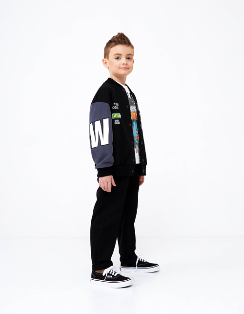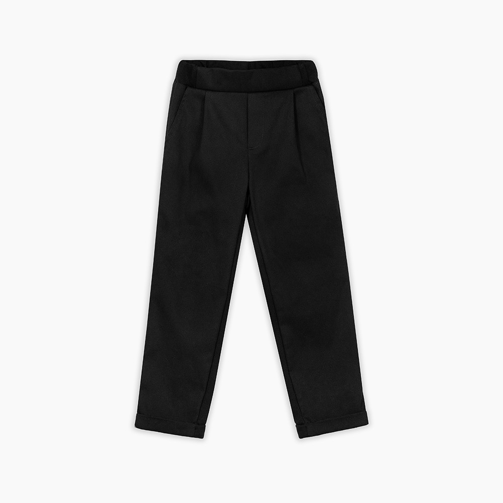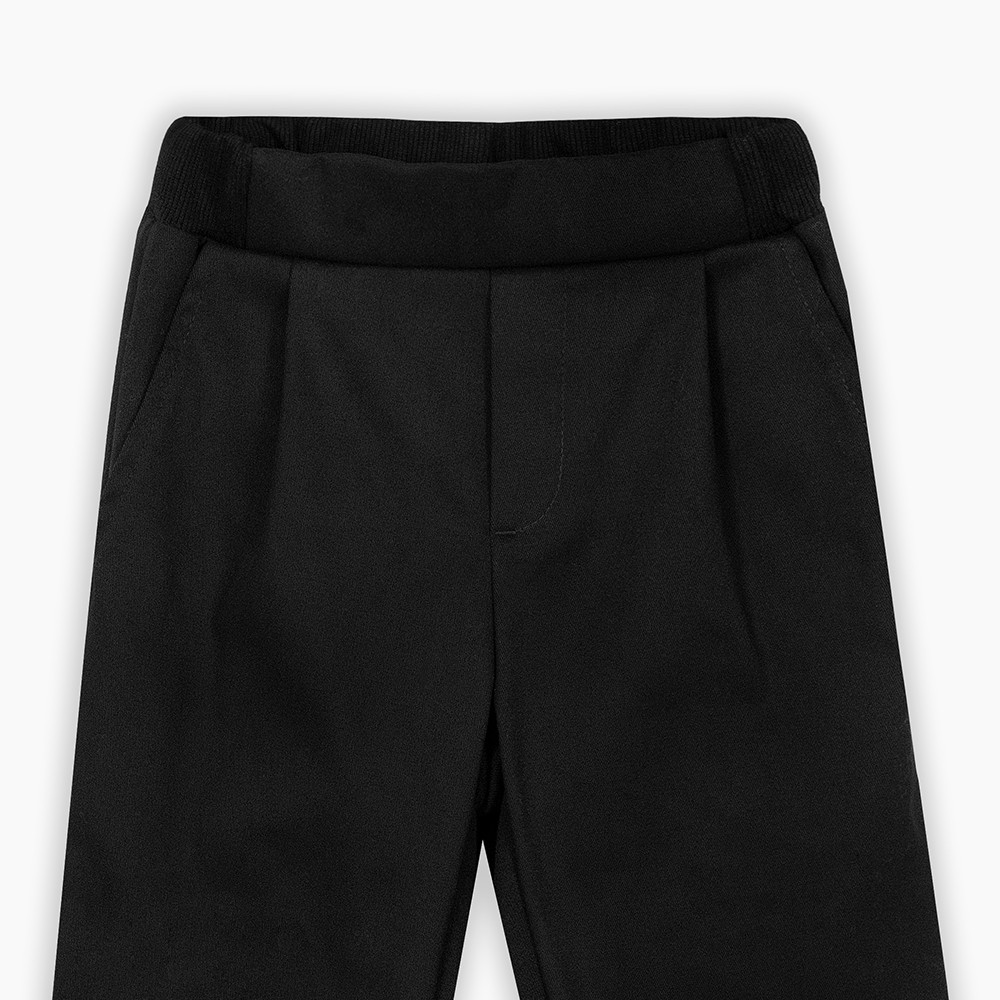 Прямые чёрные брюки для мальчика. Модель со средней посадкой на мягком поясе. Изделие с наклонными карманами. Брюки из комбинации материалов: твил и футер.