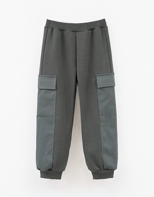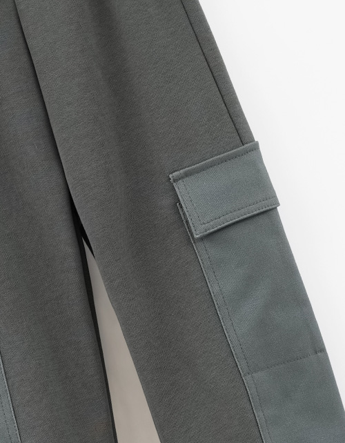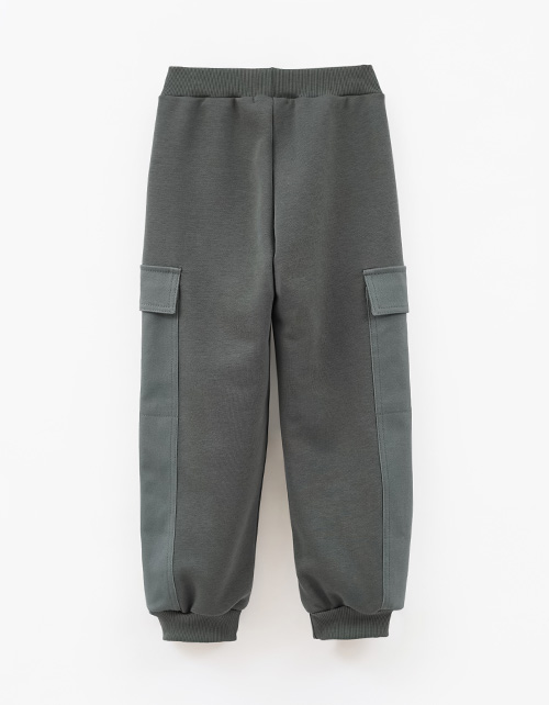 Брюки благородного серо-зелёного оттенка для мальчика. Комбинированная модель из футера и твила. Прямая модель, со средней посадкой. Изделие на мягком поясе. Эластичные манжеты из рибаны. Брюки дополнены накладными карманами с клапанами.