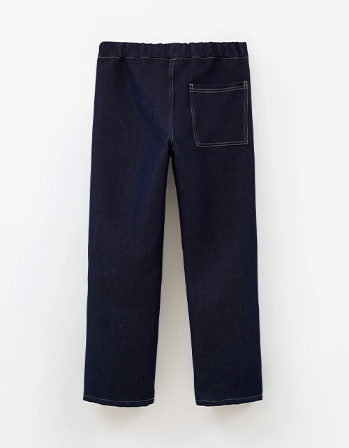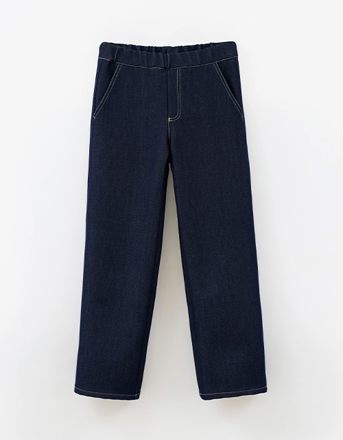 Брюки оттенка деним для мальчика. Прямая модель, со средней посадкой. Изделие на мягкой эластичной ленте. Брюки дополнены боковыми карманами спереди, накладным сзади. Контрастные декоративные строчки.
