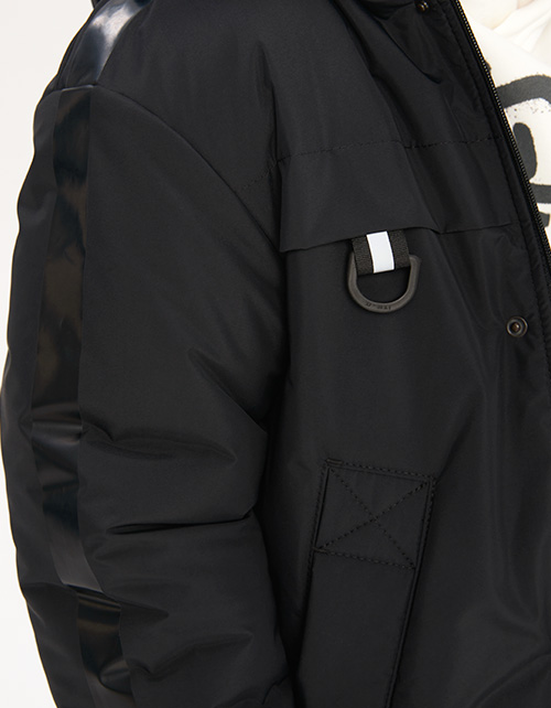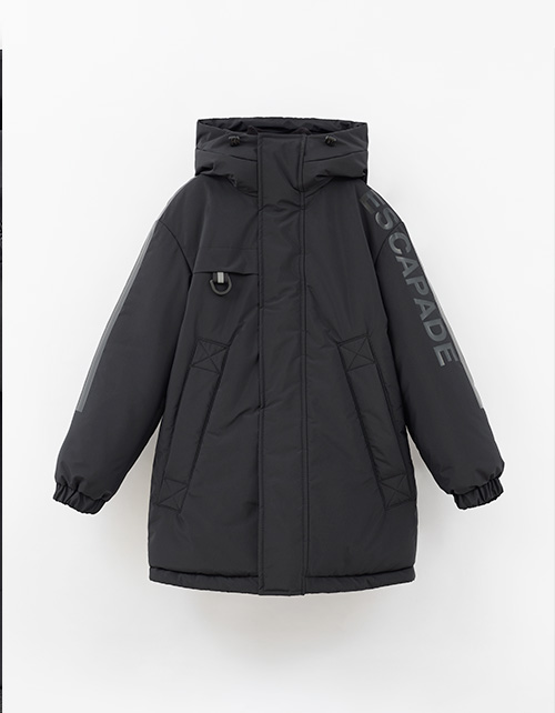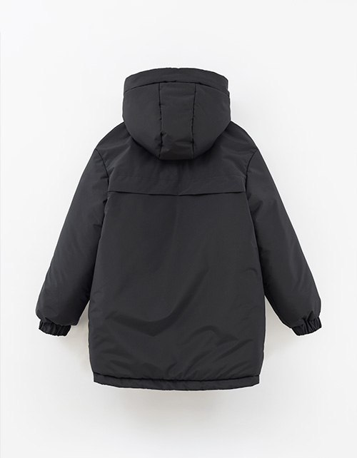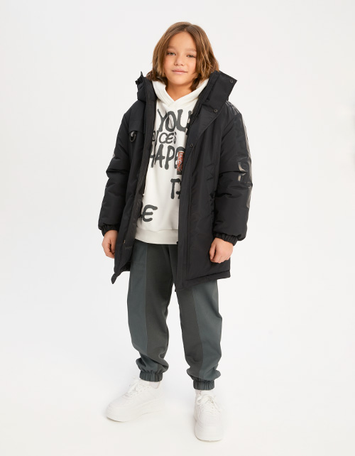 Зимняя куртка на гипоаллергенном синтепоне. Материал с 4-х уровневой степенью защиты. Прямая модель с капюшоном и воротником-стойкой. Декорирована плёнкой, репсовой тесьмой и полукольцом. Подкладка: флис и нейлон. Рекомендуемая температура: до -25 °C.