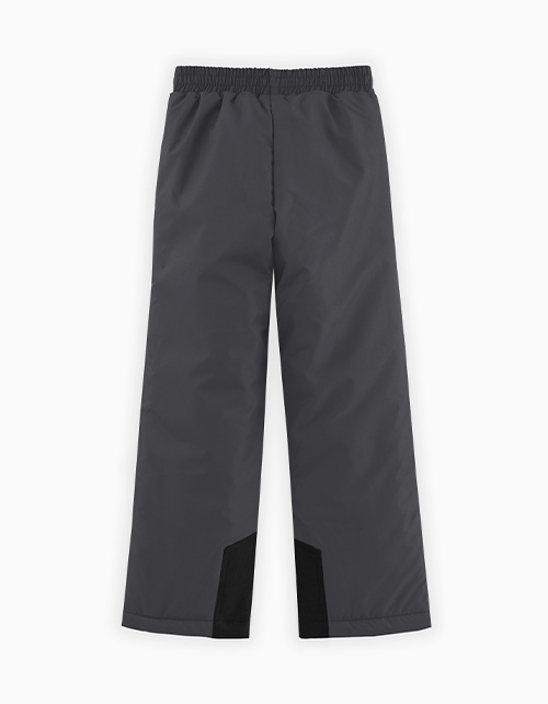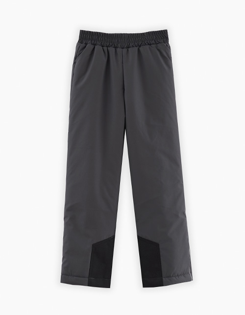 Графитовые утеплённые брюки для мальчика. Прямая модель со средней посадкой и поясом на резинке. Светоотражающий кант. Верх из ткани дьюспо защищает от ветра и влаги, устойчива к износу. Подкладка нейлон. Комфортно до -10 °C.