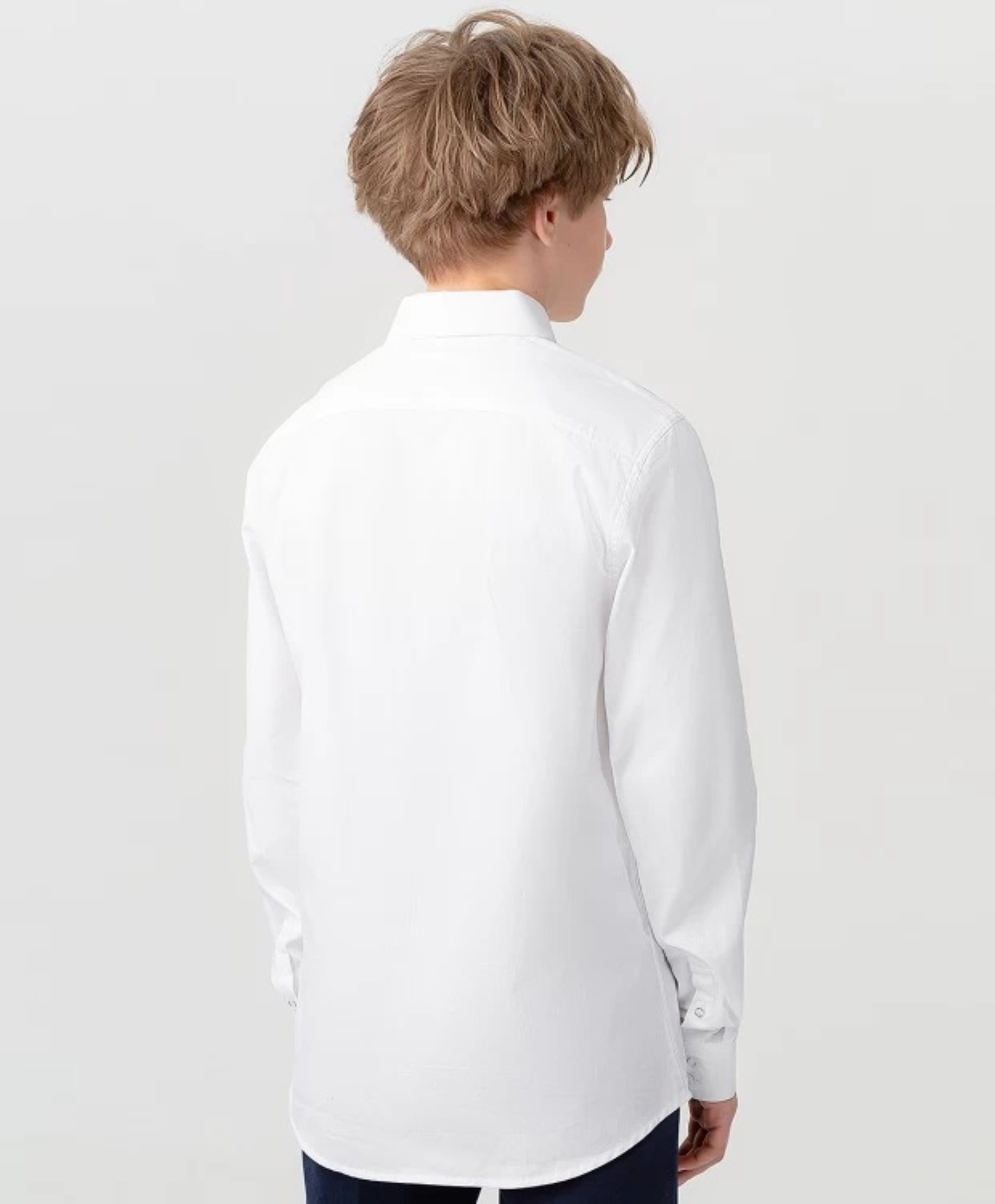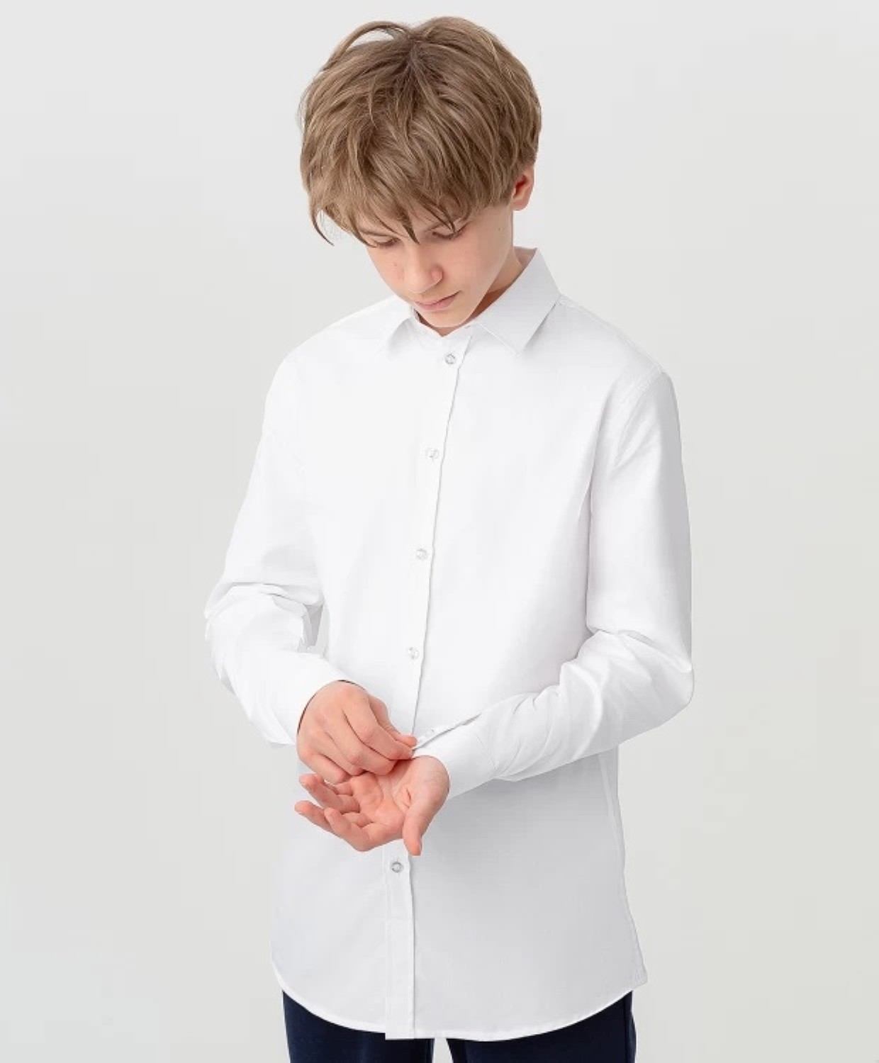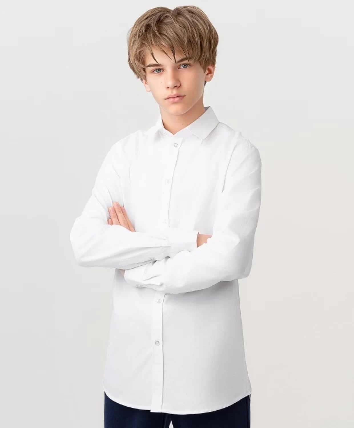 Классическая рубашка белого цвета на пуговицах для мальчика подростка. Модель с фактурой в мелкий рубчик сшита из качественного хлопкового текстильного полотна с небольшим добавлением эластана. Такой материал позволит телу дышать, обеспечит приятные ощущения для кожи и оптимальную прочность изделия. Прямой крой способствует свободной посадке, а закругленный низ добавит интересный акцент в образы. Рубашка c длинным рукавом и с отложным воротником застегивается на стильные полупрозрачные пуговицы, украшенные принтом с логотипом. На каждом манжете расположено по три пуговицы. Белая сорочка для мальчика является отличной базой для составления образов в школу, на торжественные линейки, День знаний, выпускной и другие повседневные и праздничные мероприятия. Сочетайте модель с любым низом и вторым слоем из школьной коллекции одежды для подростков Баттон Блю, получая идеальные результаты.