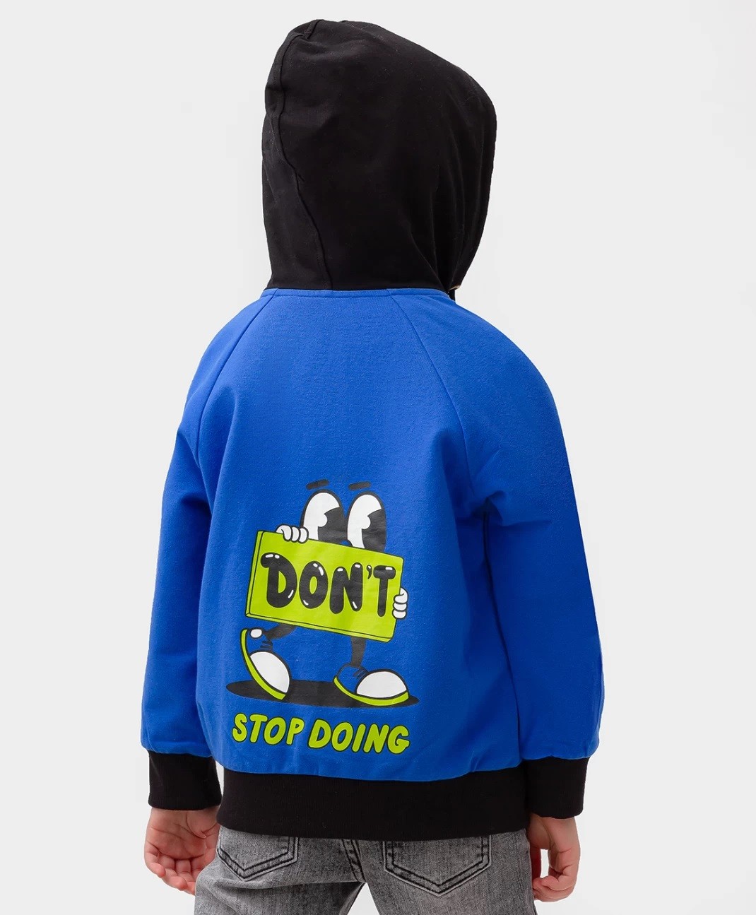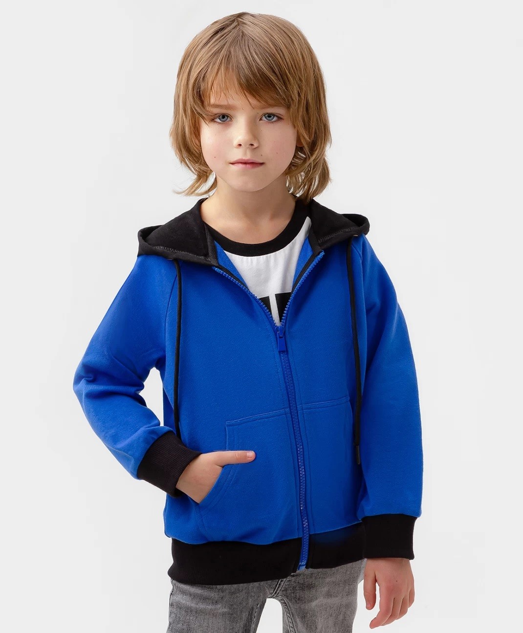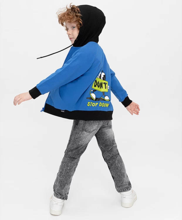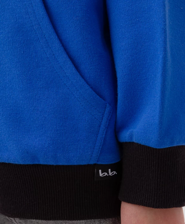 Синяя трикотажная толстовка с капюшоном на молнии для мальчика дополнена стильными рукавами реглан. Натуральная хлопковая ткань с добавлением эластана подарит приятные ощущения при соприкосновении с кожей, обеспечивая оптимальный воздухообмен. Прямой крой толстовки способствует свободной посадке для легкости при активных движениях. Капюшон можно затянуть при помощи функциональных завязок для дополнительного тепла. В накладных карманах-кенгуру удобно носить с собой важные мелочи. Яркий контрастный принт на спинке изделия сделает любой образ привлекательным и запоминающимся. Детская кофта с капюшоном в околоспортивном стиле оптимально сочетается с разнообразием джоггеров, джинсов и брюк из капсульной коллекции Button Blue.