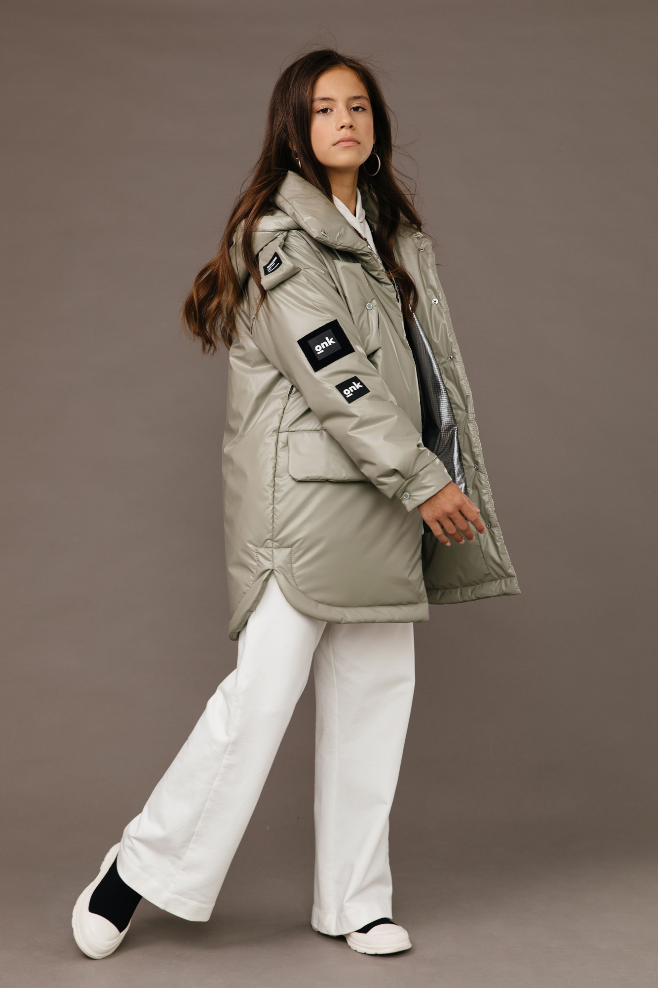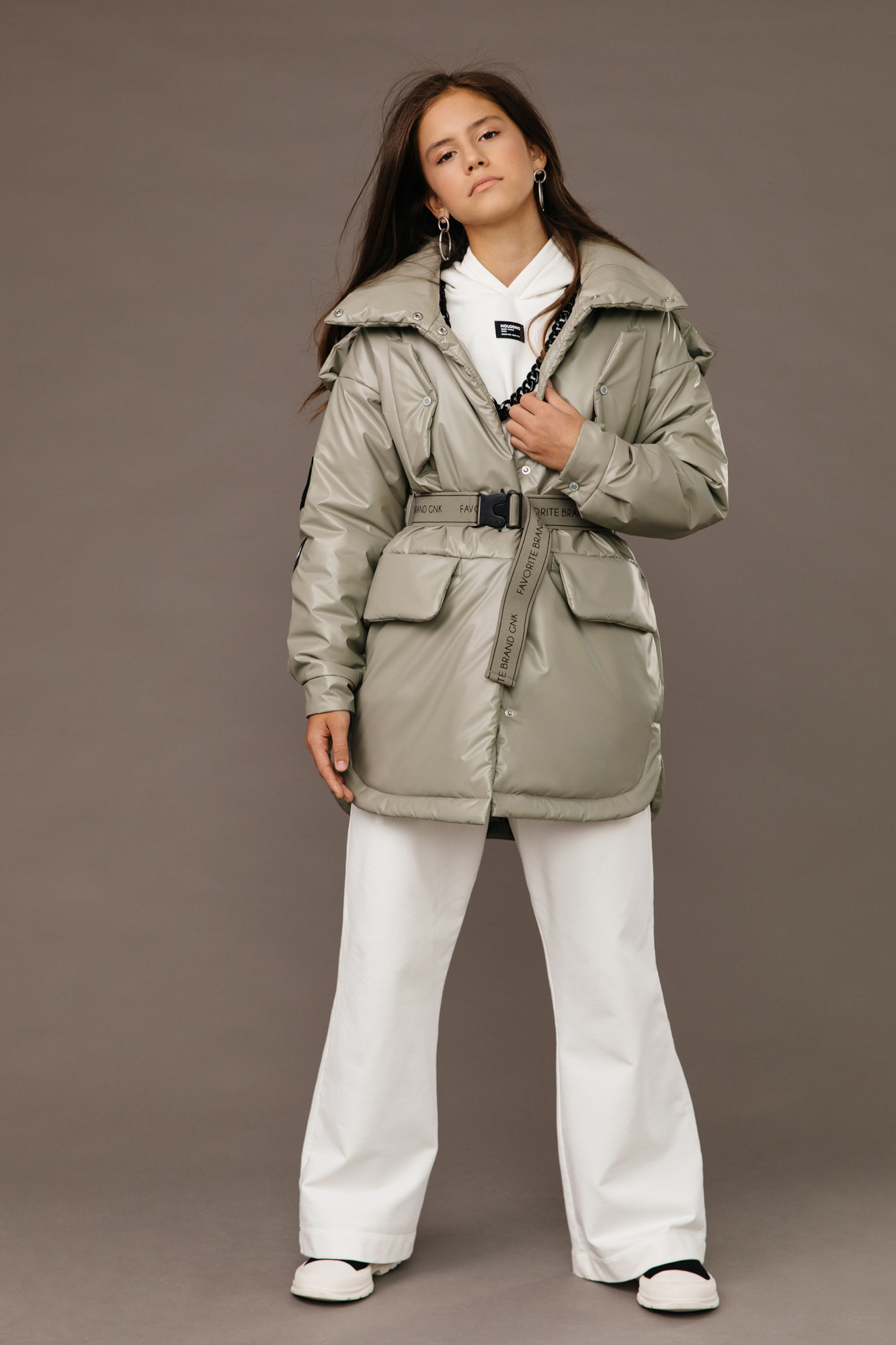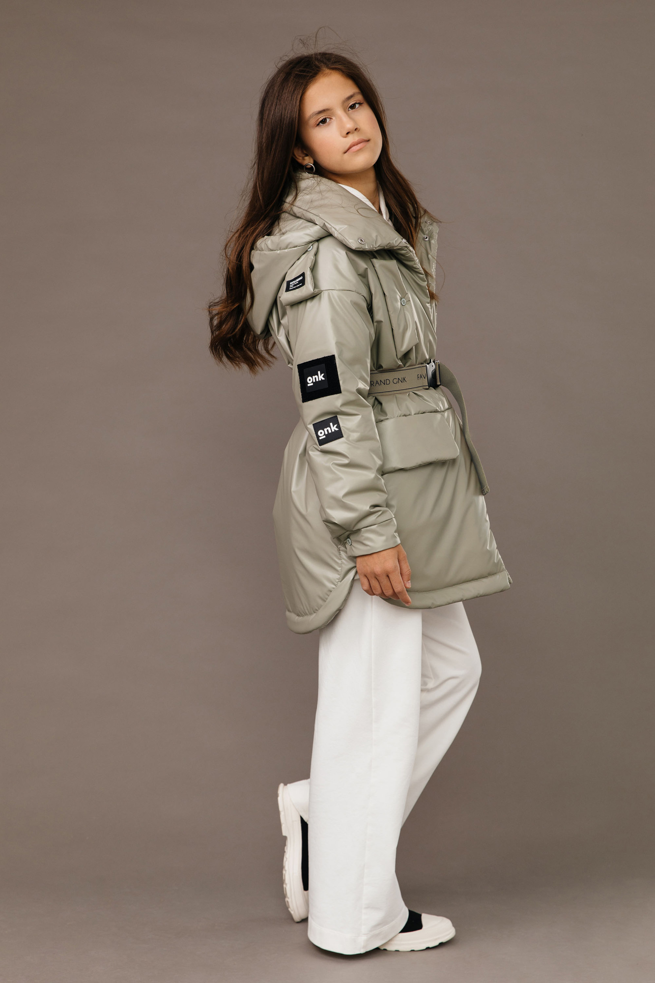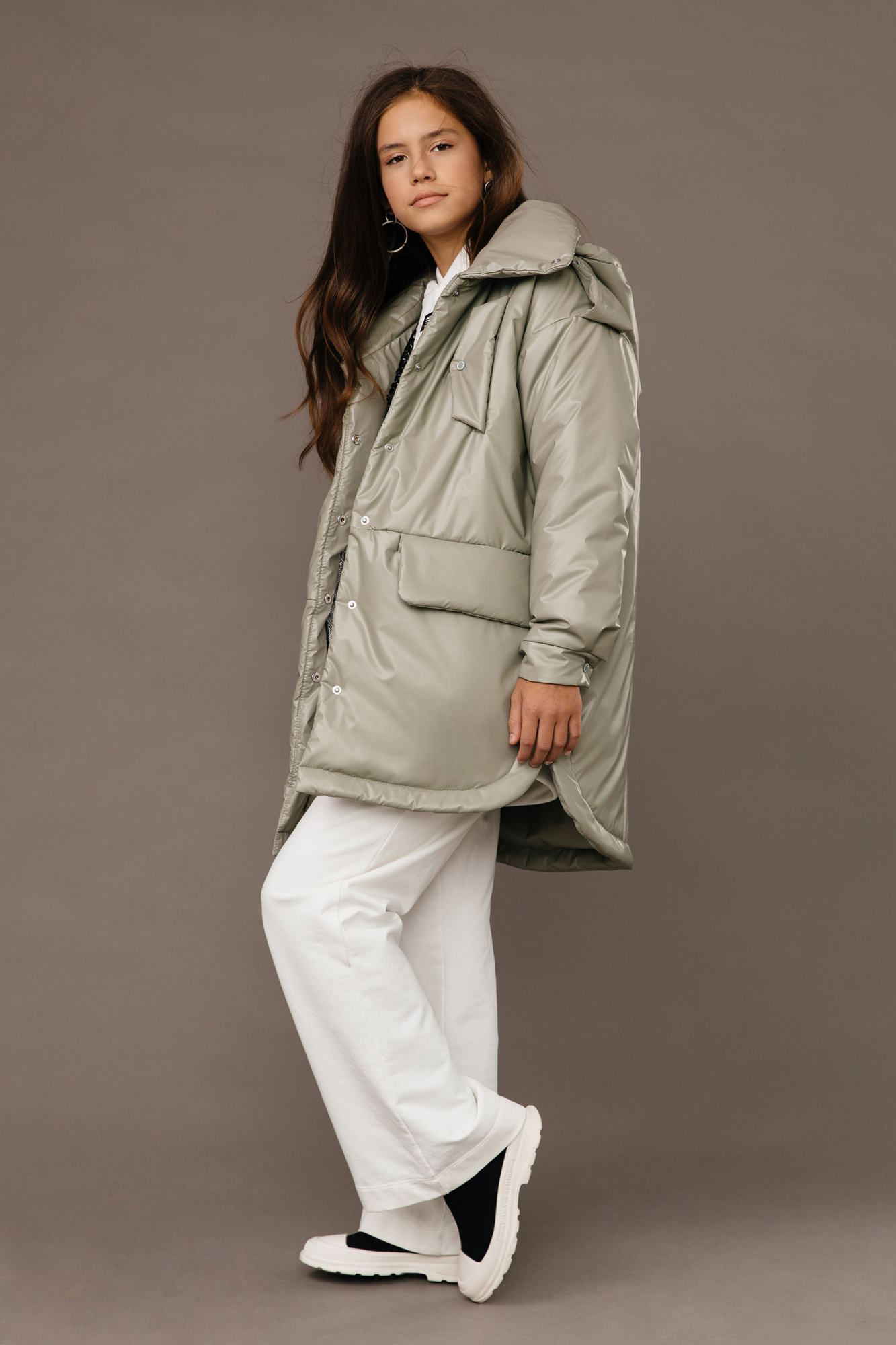Куртка прямого силуэта. Рукав втачной, со спущенной линией плеча. Застежка – центральная на потайные кнопки. Воротник - стойка. На переде выполнены наклонные нагрудные прорезные карманы с фигурными клапанами. Боковые карманы - горизонтальные прорезные с клапанами. Низ рукава оформлен притачными манжетами застегивающимися на кнопки. Капюшон отстегивающийся, по краю капюшона кулиса регулируемая резинкой и стопорами . Низ изделия фигурный, с отделочной строчкой. С помощью съемного пояса возможна трансформация силуэта.