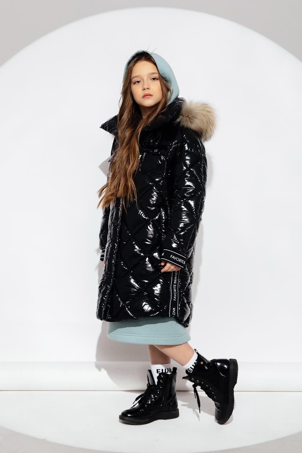 Пальто-в рубашечном стиле-прямого силуэта. Рукав втачной, со спущенной линией плеча. Воротник-стойка на кнопках, объемный, с декоративными шнурами. Застежка на молнию и потайные кнопки, с верхней планкой и нижней ветрозащитной планкой. Изделие стеганое ромбом. На переде обработаны нагрудные накладные карманы с клапанами. Боковые карманы - вертикальные с листочками. Наполнитель: синтетический лебяжий пух Ткань: курточная ткань с лаковым блеском Подклада: фольгированная (омни хит) Опушка: мех енота натуральный