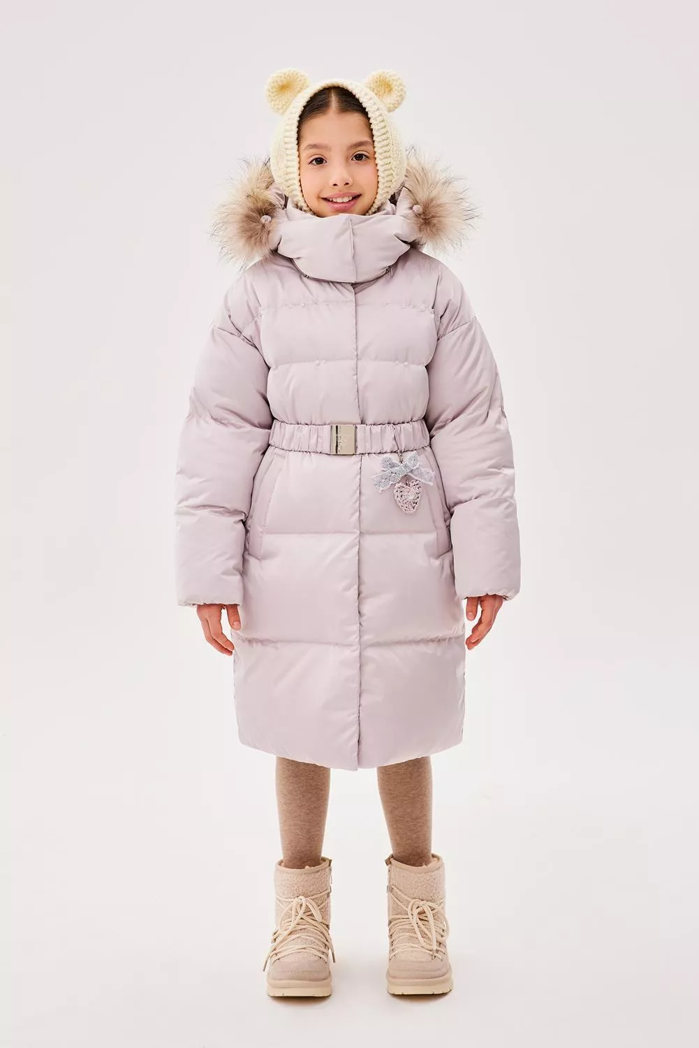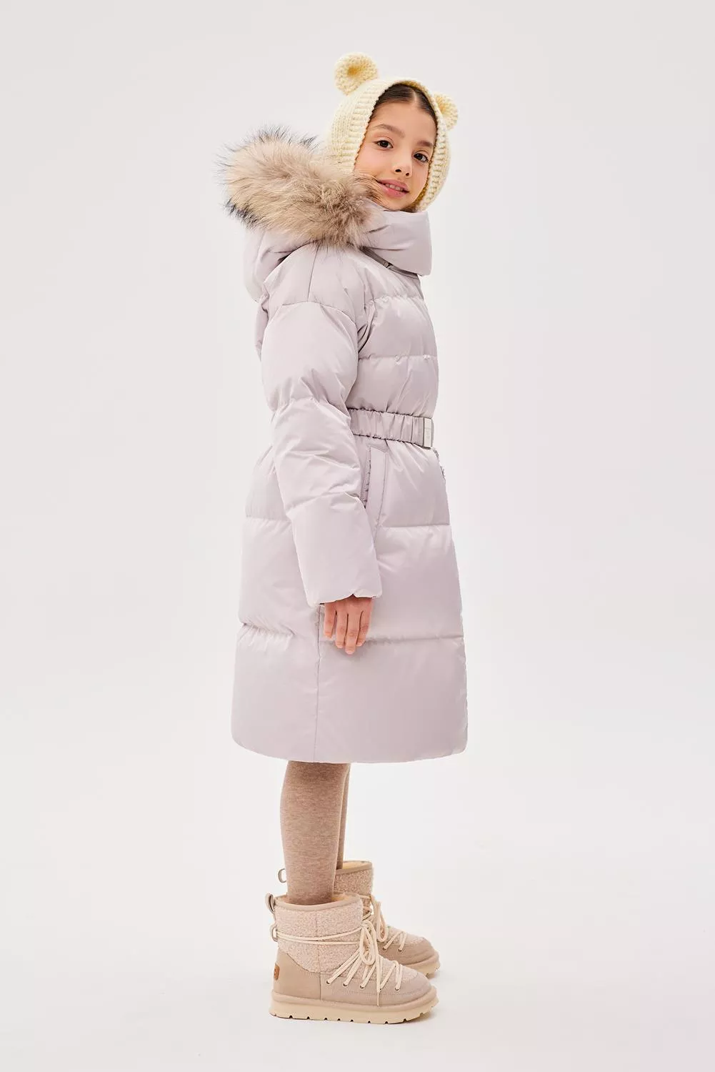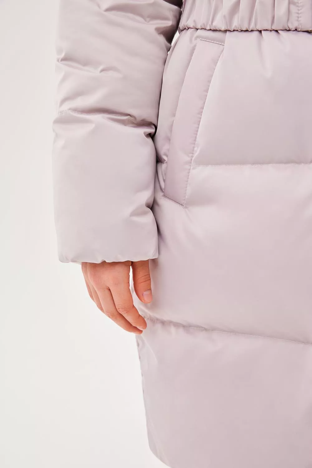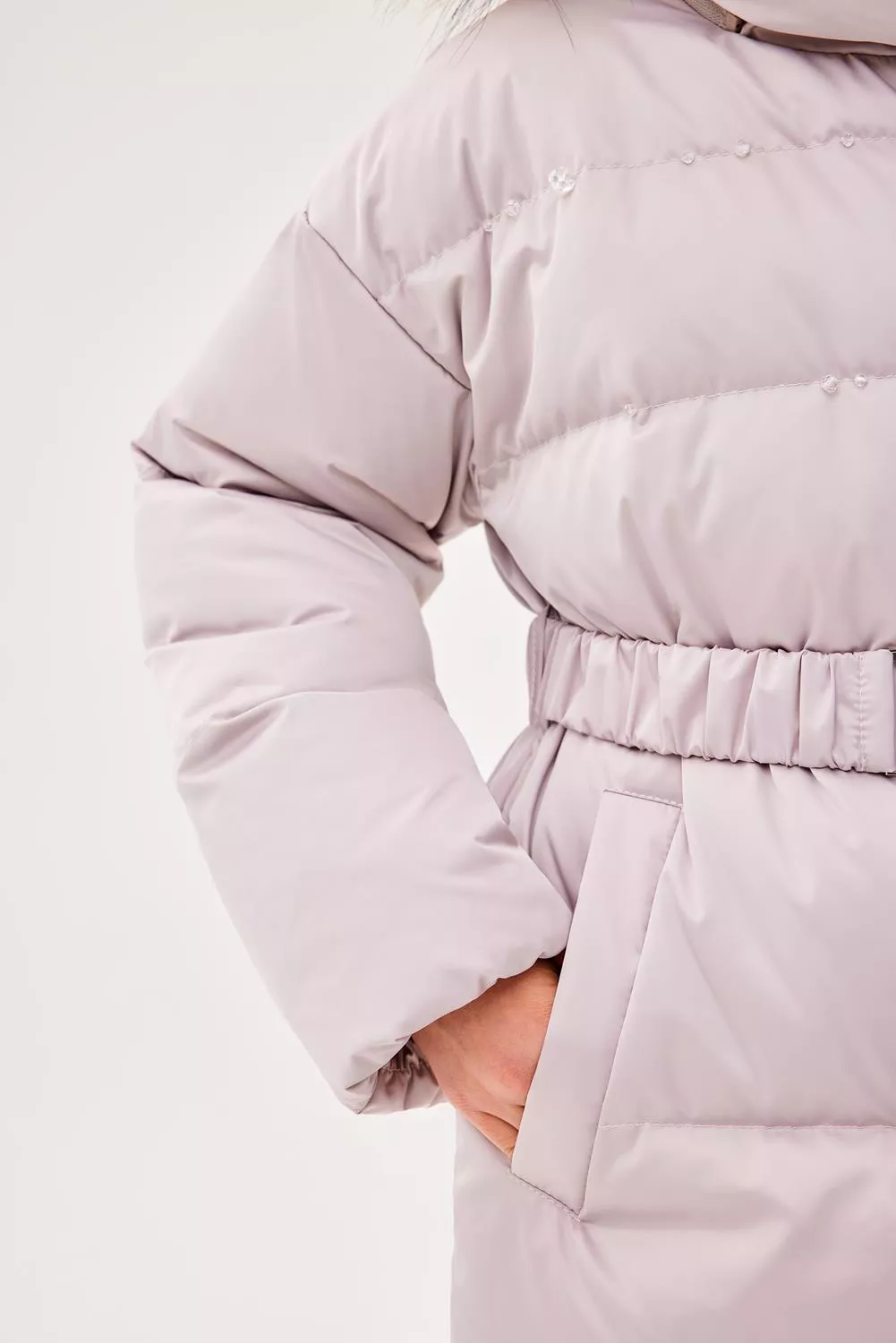 Пальто свободного прямого силуэта. Рукав втачной, со спущенной линией плеча. Воротник-стойка. Капюшон - шлем, застегивающийся на потайные кнопки. Капюшон съемный, пристегивается на молнию. Край капюшона-с кулисой, регулируемой шнуром-резинкой и стопорами. Меховая опушка по краю капюшона съемная на застежку-молнию. Застежка центральная на молнию, с цельнокроеной верхней ветрозащитной планкой, застегивающейся на потайные кнопки. Изделие стеганое широкими горизонтальными переборками. На переде выполнены вертикальные прорезные карманы с листочками. Внутри рукав оформлен трикотажными манжетами. С помощью съемного пояса возможна трансформация силуэта.