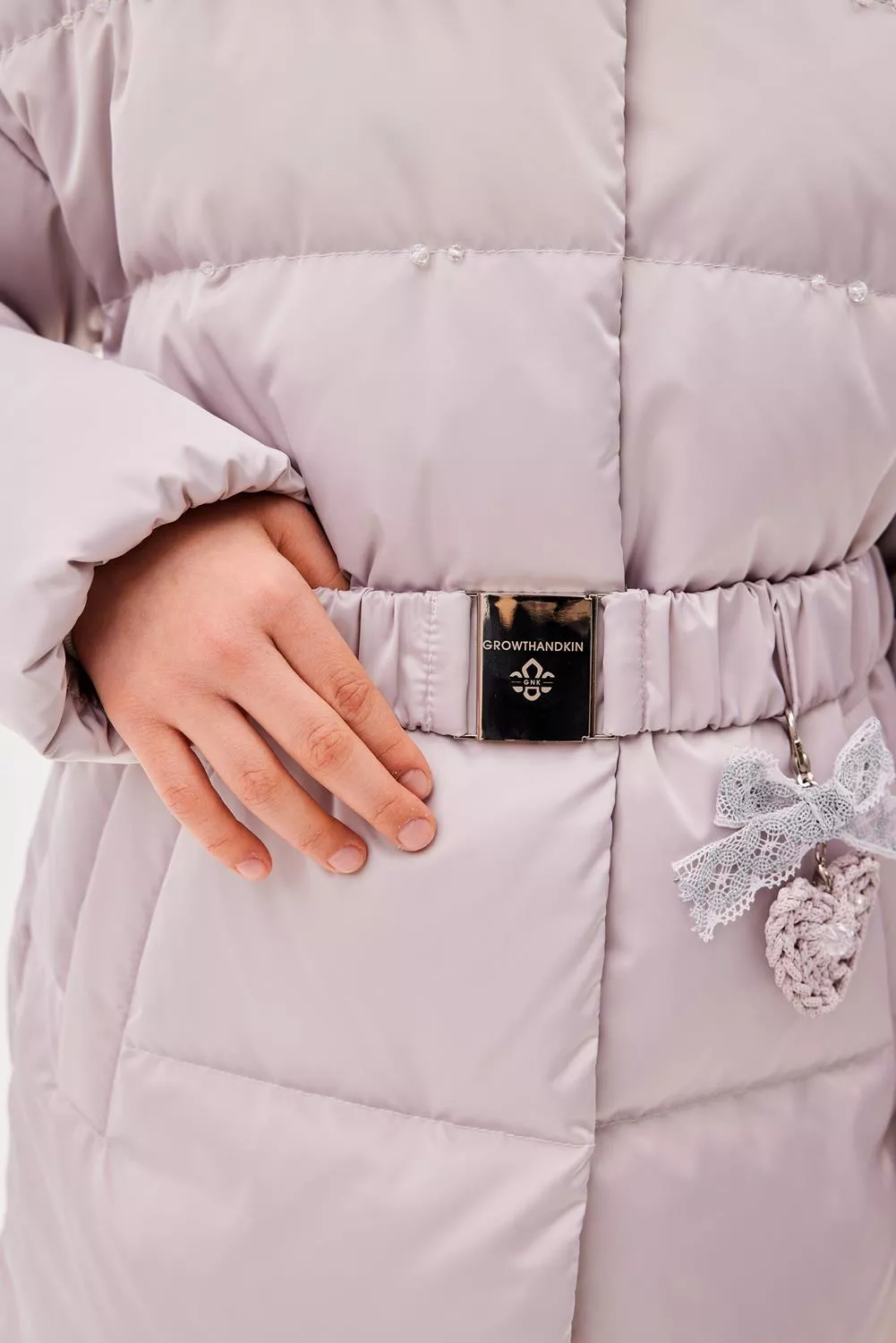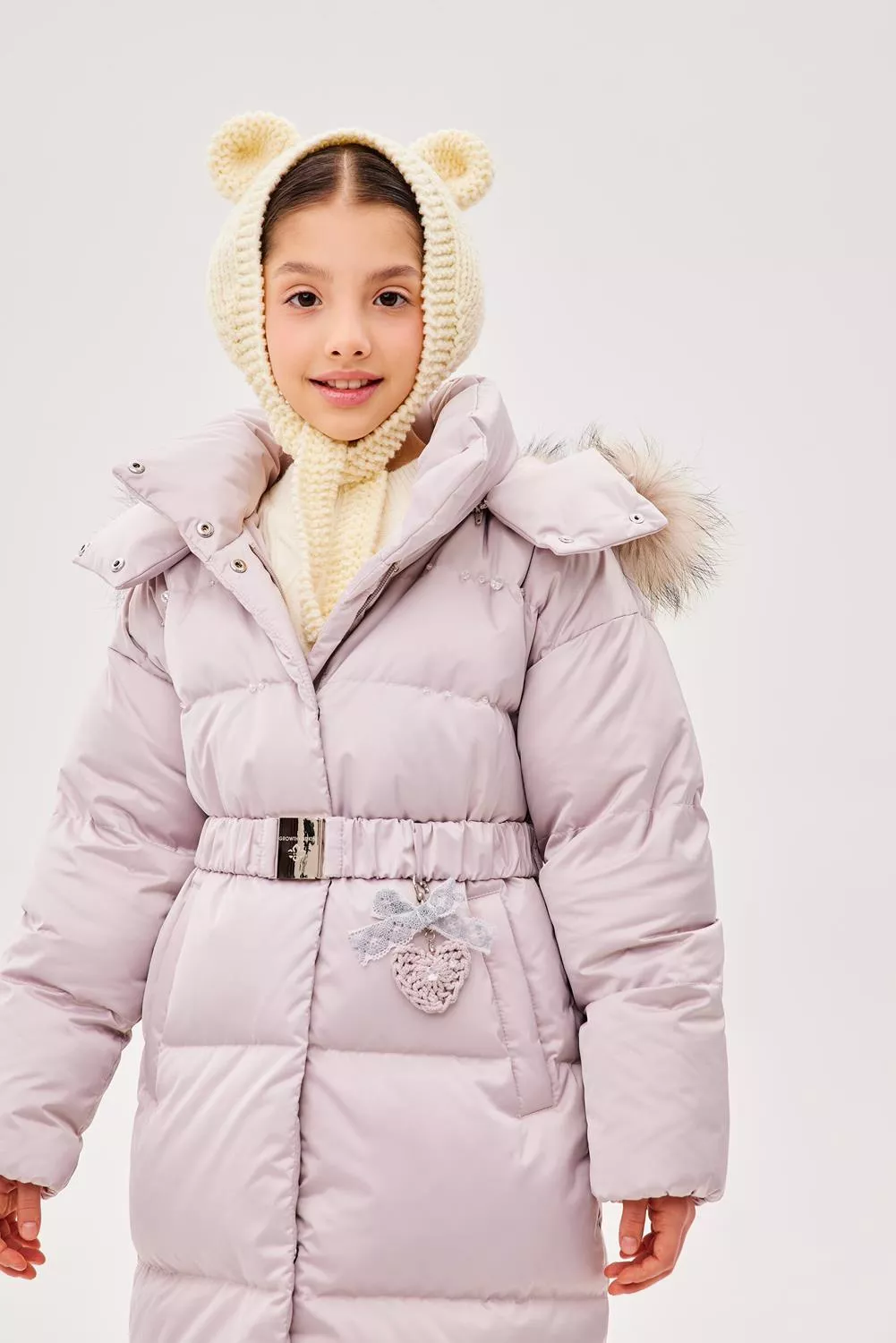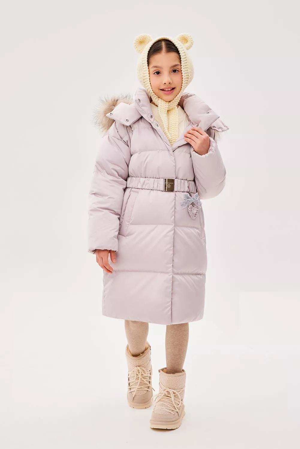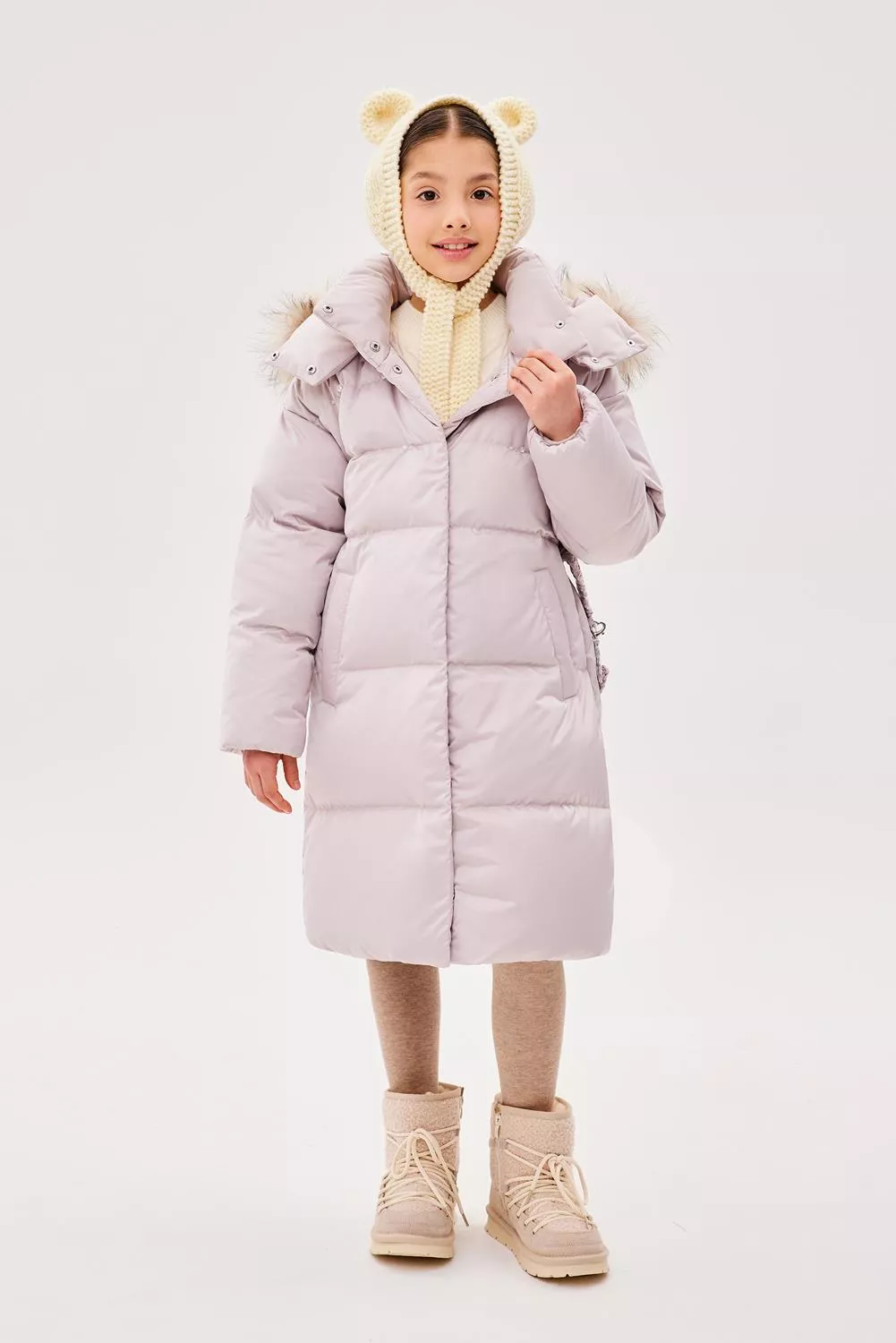 Пальто свободного прямого силуэта. Рукав втачной, со спущенной линией плеча. Воротник-стойка. Капюшон - шлем, застегивающийся на потайные кнопки. Капюшон съемный, пристегивается на молнию. Край капюшона-с кулисой, регулируемой шнуром-резинкой и стопорами. Меховая опушка по краю капюшона съемная на застежку-молнию. Застежка центральная на молнию, с цельнокроеной верхней ветрозащитной планкой, застегивающейся на потайные кнопки. Изделие стеганое широкими горизонтальными переборками. На переде выполнены вертикальные прорезные карманы с листочками. Внутри рукав оформлен трикотажными манжетами. С помощью съемного пояса возможна трансформация силуэта.