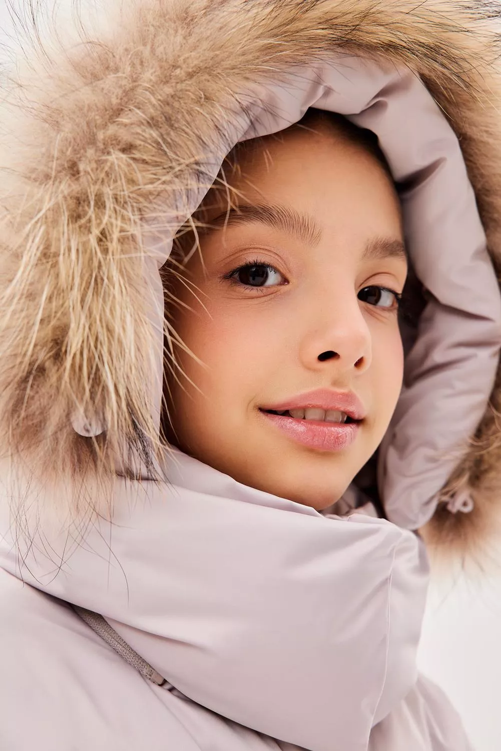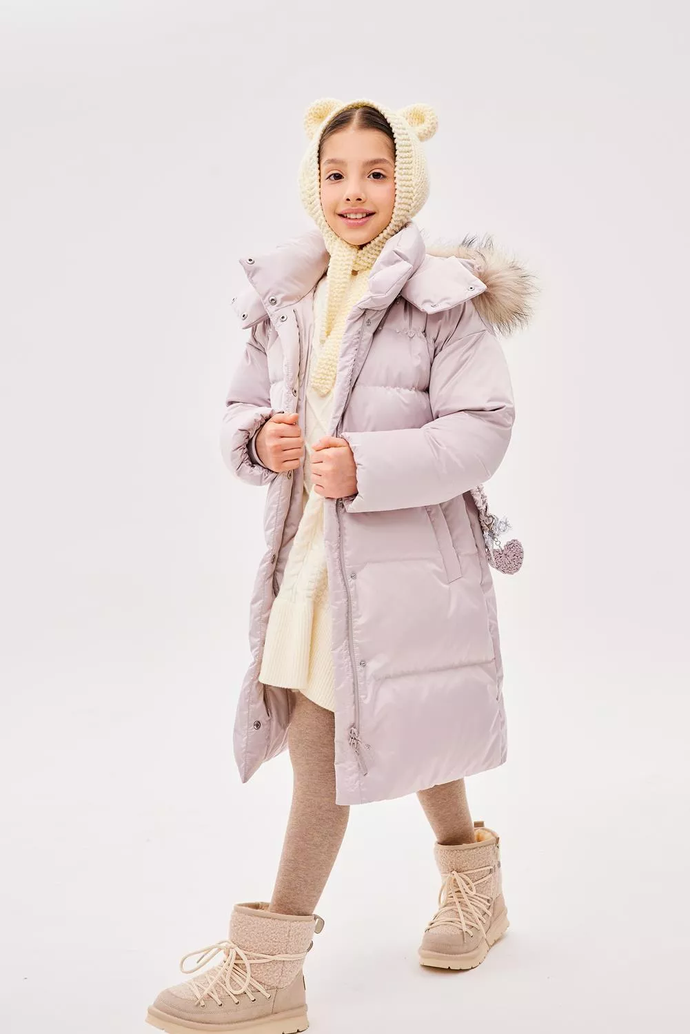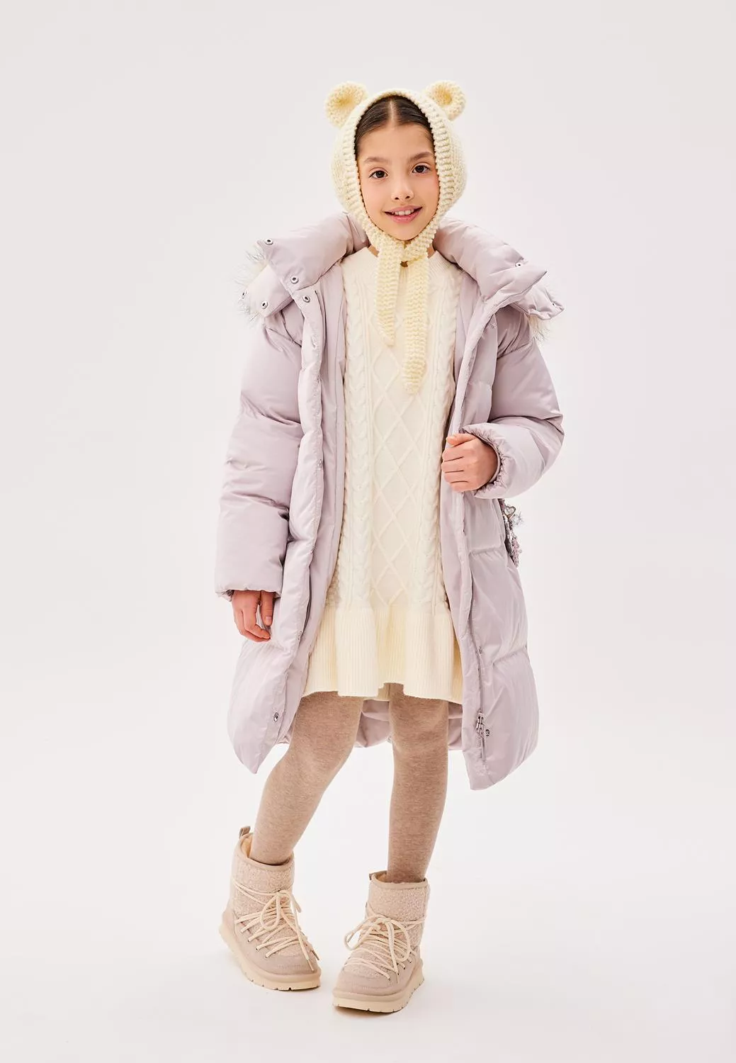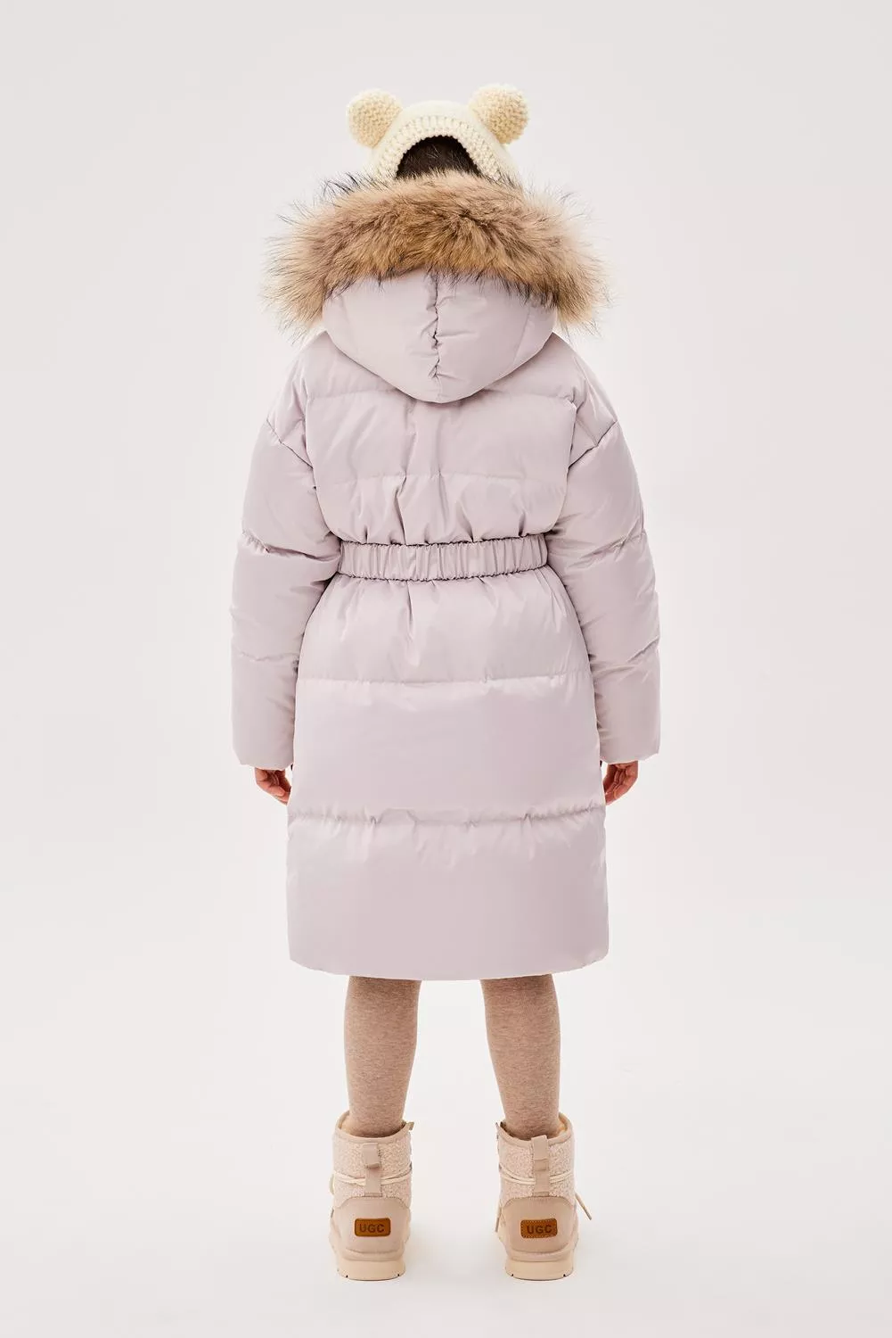 Пальто свободного прямого силуэта. Рукав втачной, со спущенной линией плеча. Воротник-стойка. Капюшон - шлем, застегивающийся на потайные кнопки. Капюшон съемный, пристегивается на молнию. Край капюшона-с кулисой, регулируемой шнуром-резинкой и стопорами. Меховая опушка по краю капюшона съемная на застежку-молнию. Застежка центральная на молнию, с цельнокроеной верхней ветрозащитной планкой, застегивающейся на потайные кнопки. Изделие стеганое широкими горизонтальными переборками. На переде выполнены вертикальные прорезные карманы с листочками. Внутри рукав оформлен трикотажными манжетами. С помощью съемного пояса возможна трансформация силуэта.
