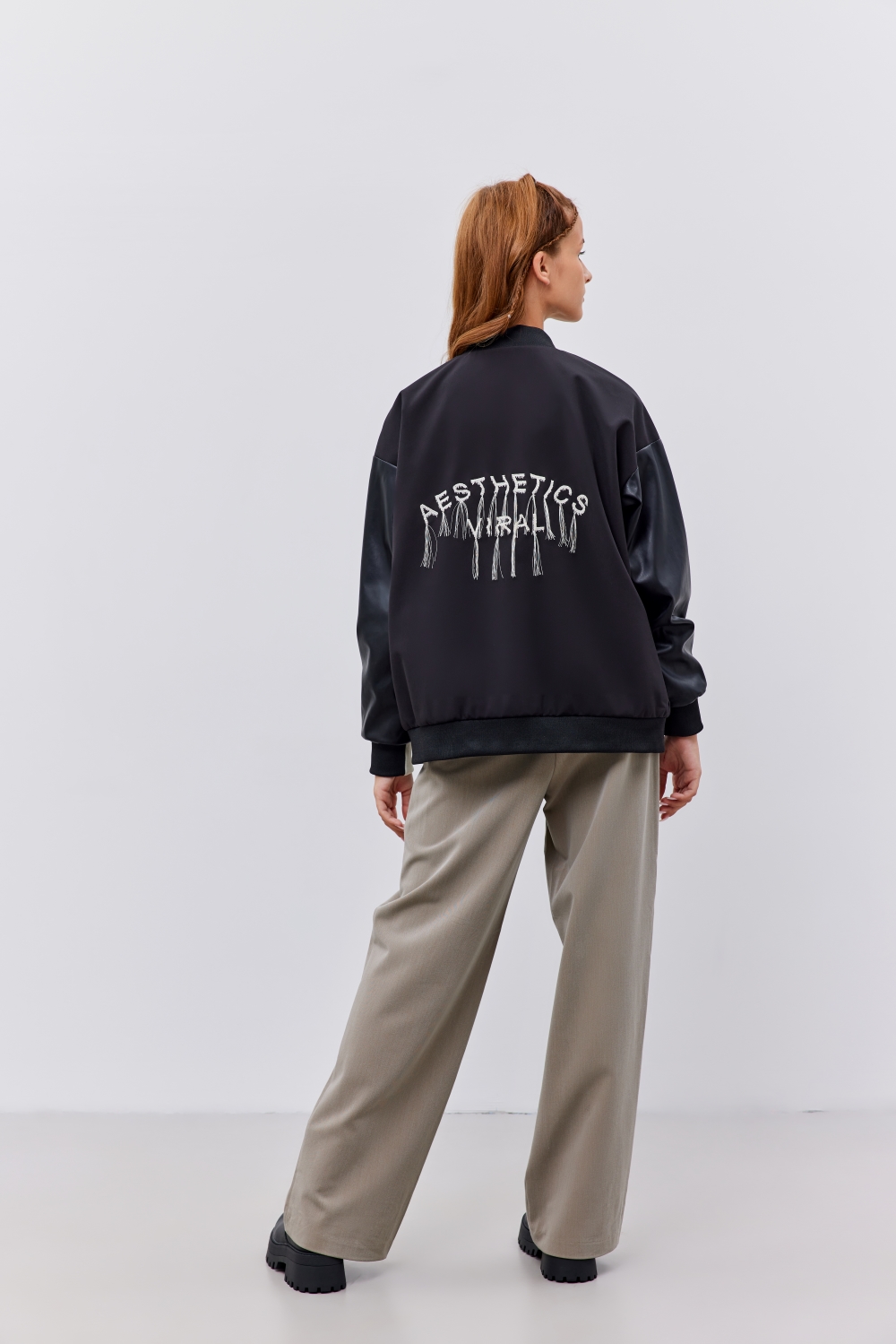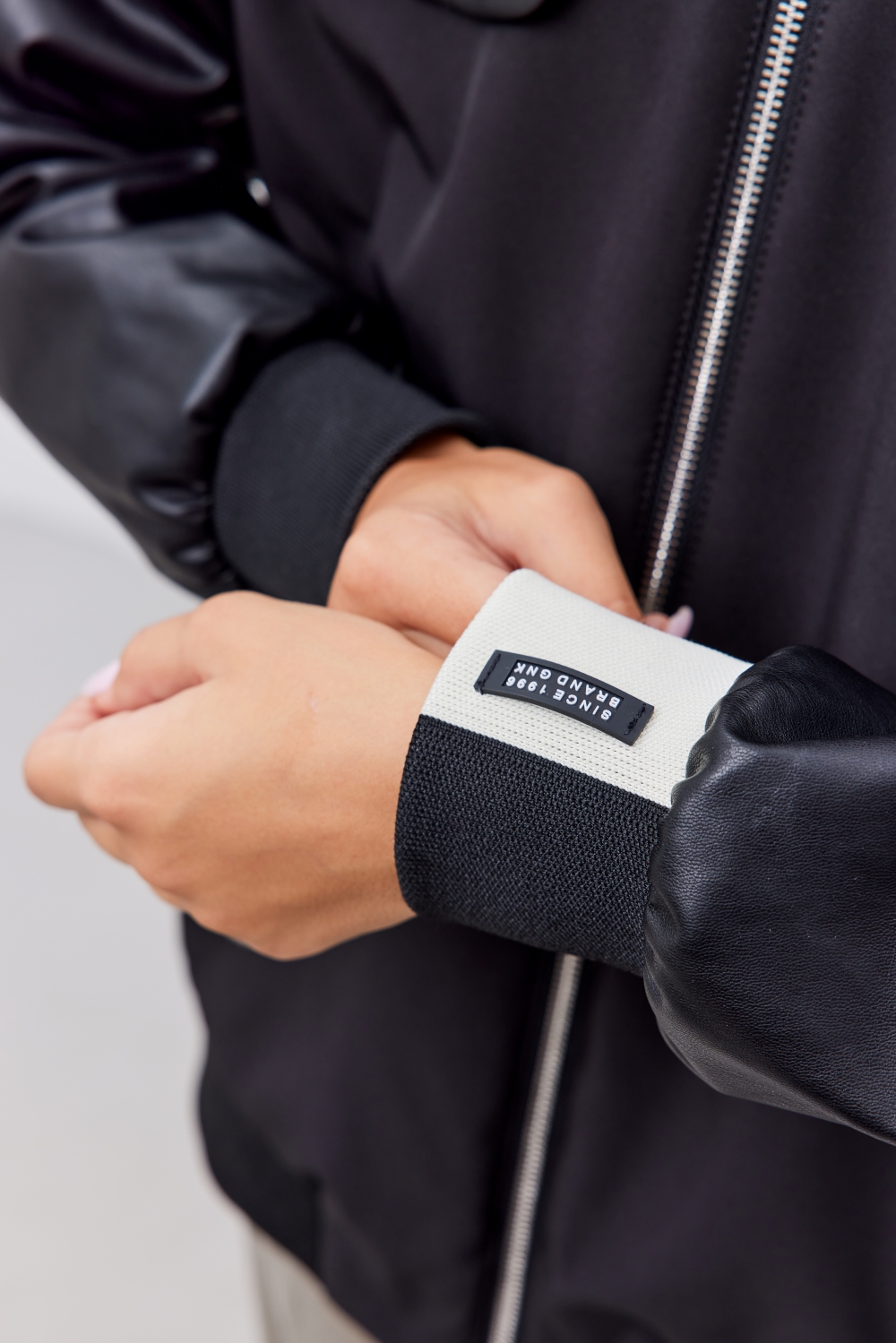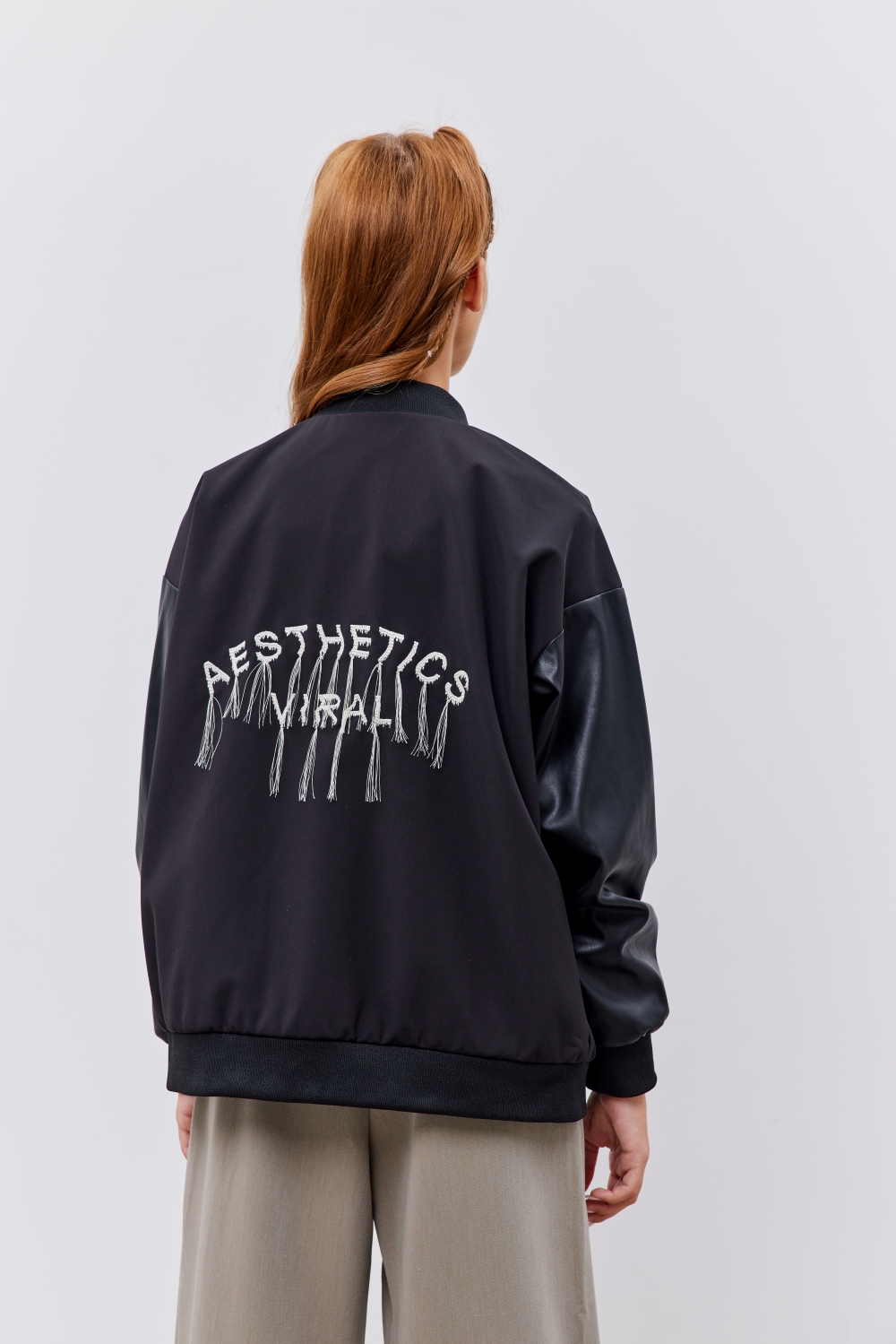 Молнии металл - центральная застежка, карманы. Клапаны, рукава - экокожа. Жаккардовый двухцветный трикотаж, нашивка с логотипом - воротник, манжета левого рукава. Вышивка - спинка.