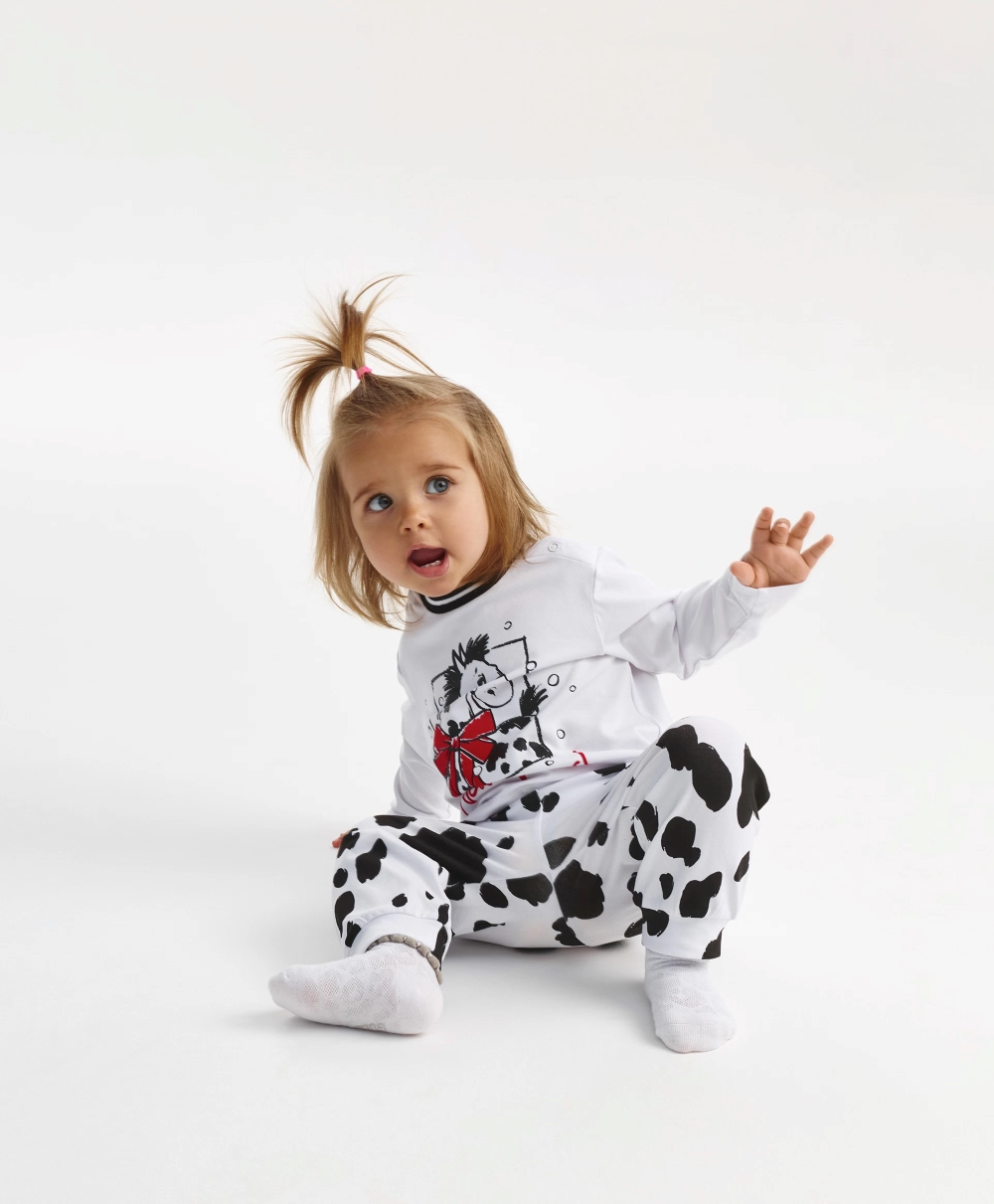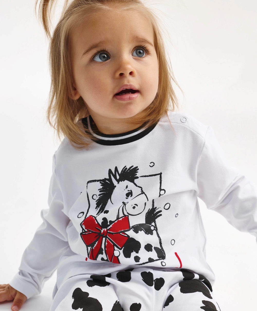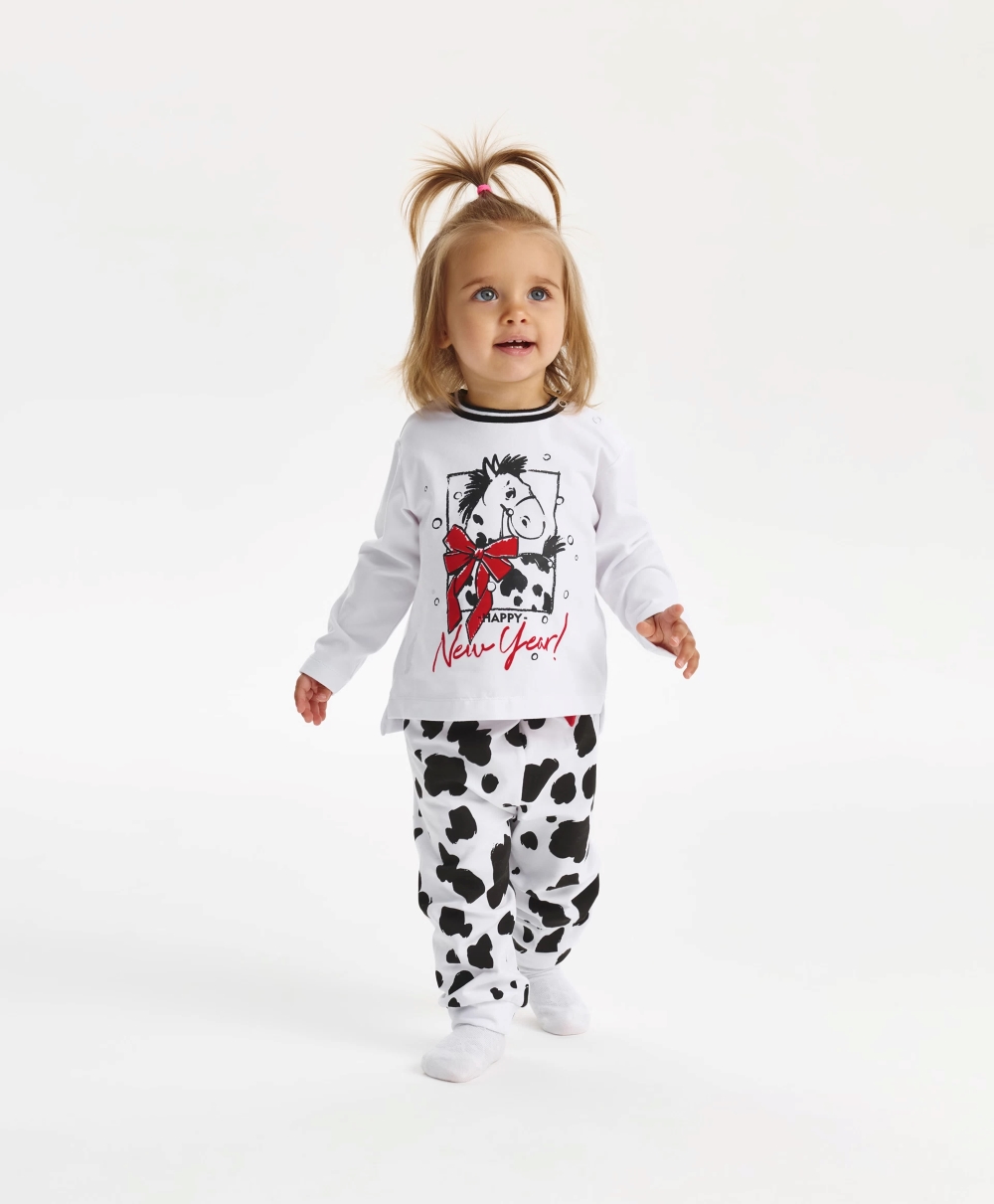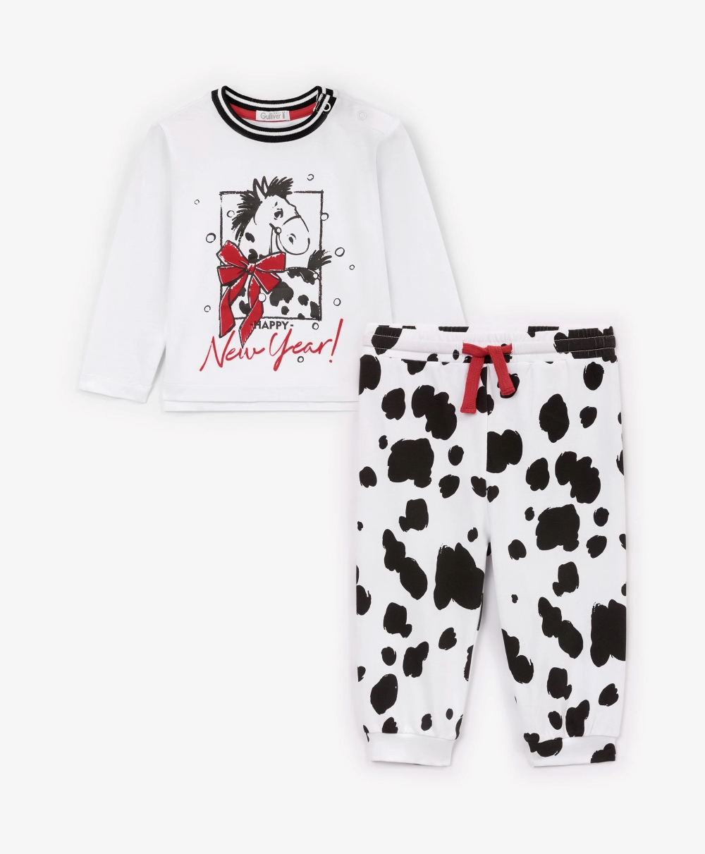 Пижама с новогодним принтом идеально подойдет для создания уютной домашней атмосферы в преддверии праздника или после него!  Белый лонгслив с оригинальным тематическим изображением и свободные трикотажные брюки с черно-белым рисунком  очень пластичны, комфортны в эксплуатации, приятны тактильно. Брюки имеют пояс на резинке и удобные для малышей манжеты.