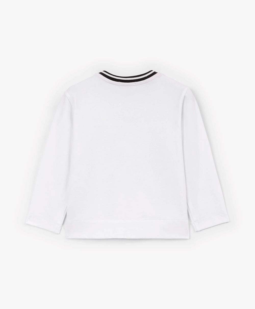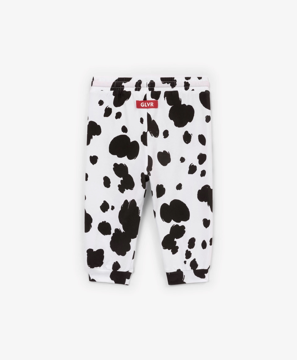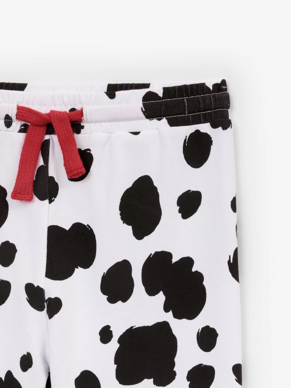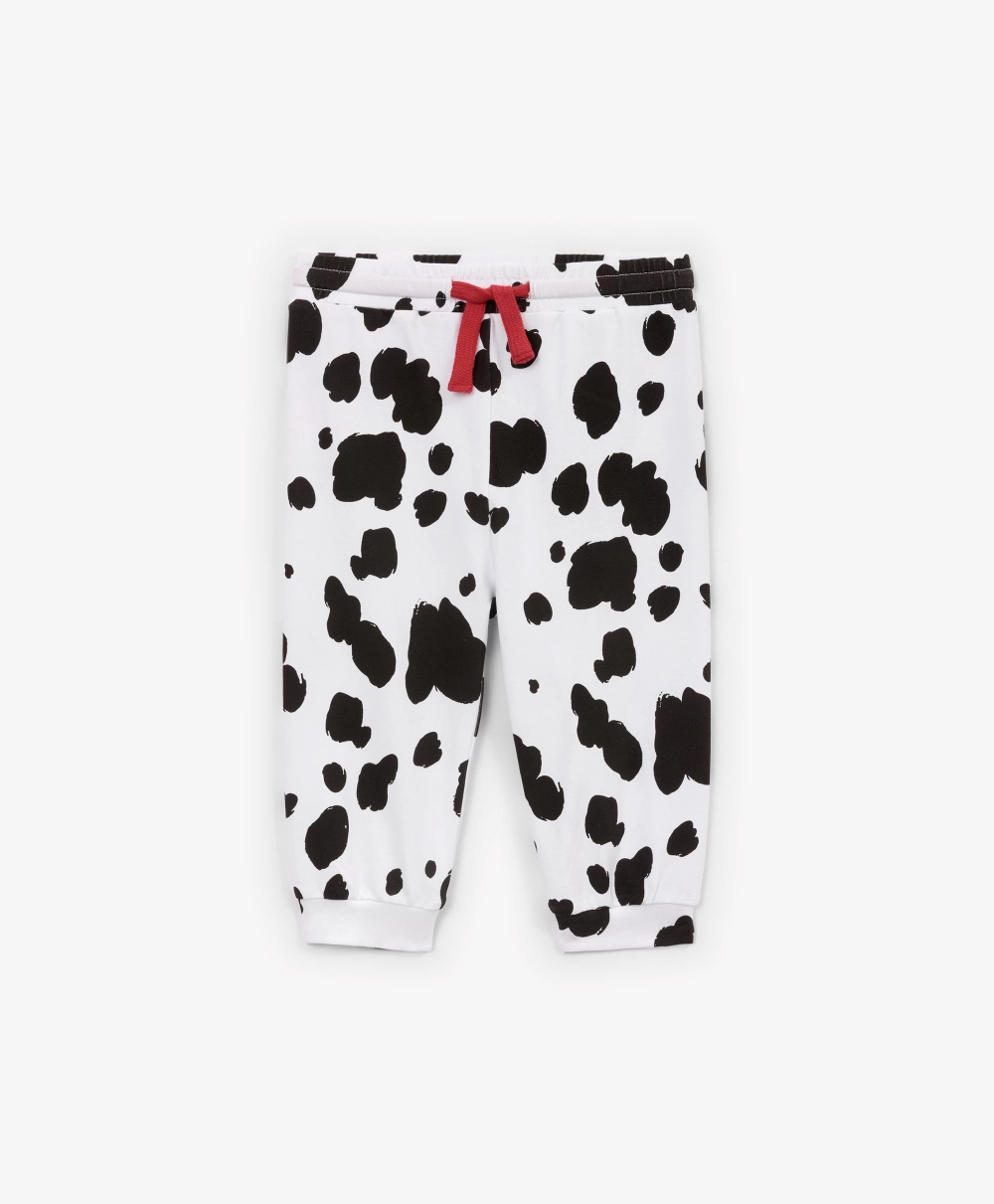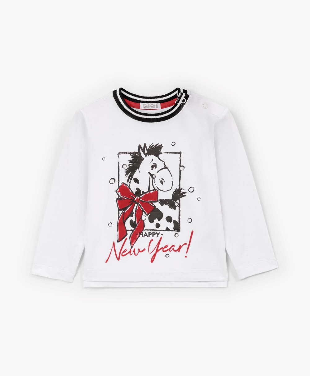 Пижама с новогодним принтом идеально подойдет для создания уютной домашней атмосферы в преддверии праздника или после него!  Белый лонгслив с оригинальным тематическим изображением и свободные трикотажные брюки с черно-белым рисунком  очень пластичны, комфортны в эксплуатации, приятны тактильно. Брюки имеют пояс на резинке и удобные для малышей манжеты.